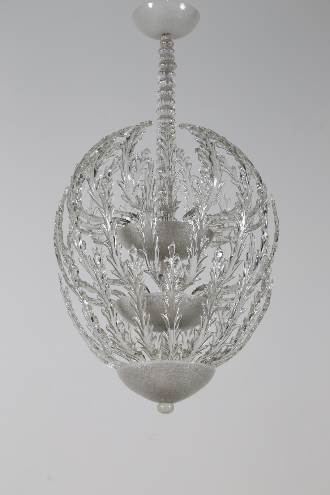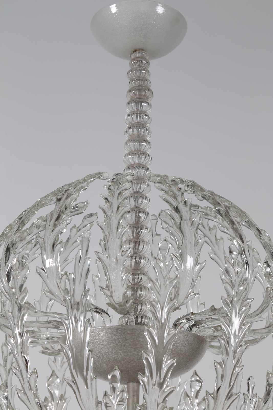 BAROVIER ERCOLE (1889 - 1974) Glass chandelier with transparent crystal leaves, for Barovier and Toso, 30’s. The same model was used by the architect Melchiorre Bega for the bakery bar Majani’s furnitures in Bologna in 1939, Literature; same model Domus num. 146 february 1940 pag. 87.
