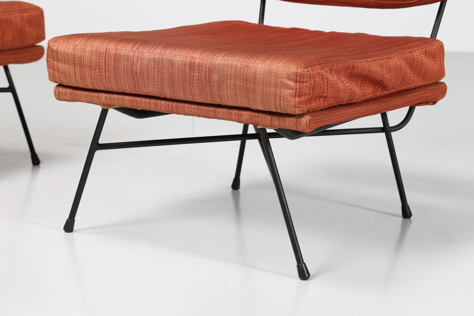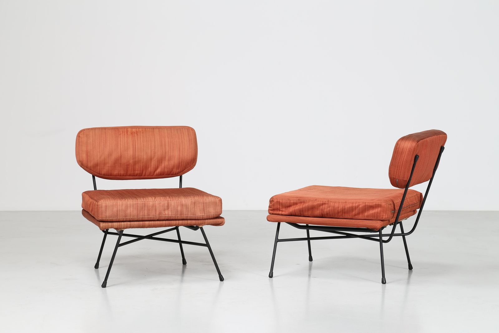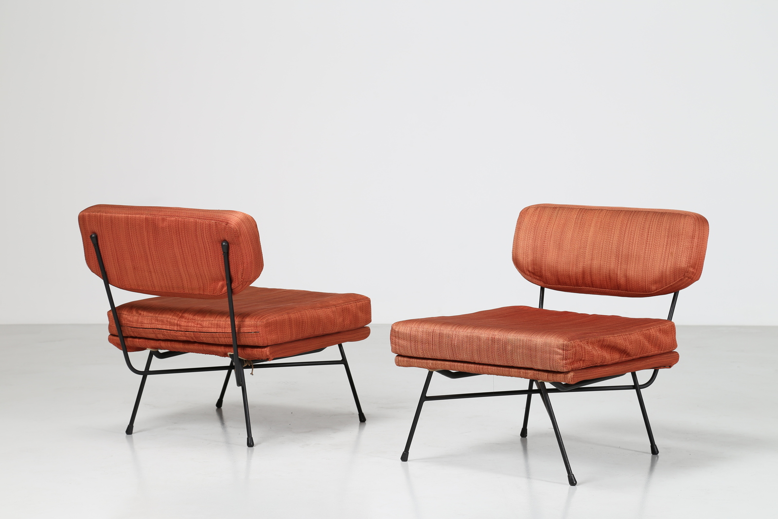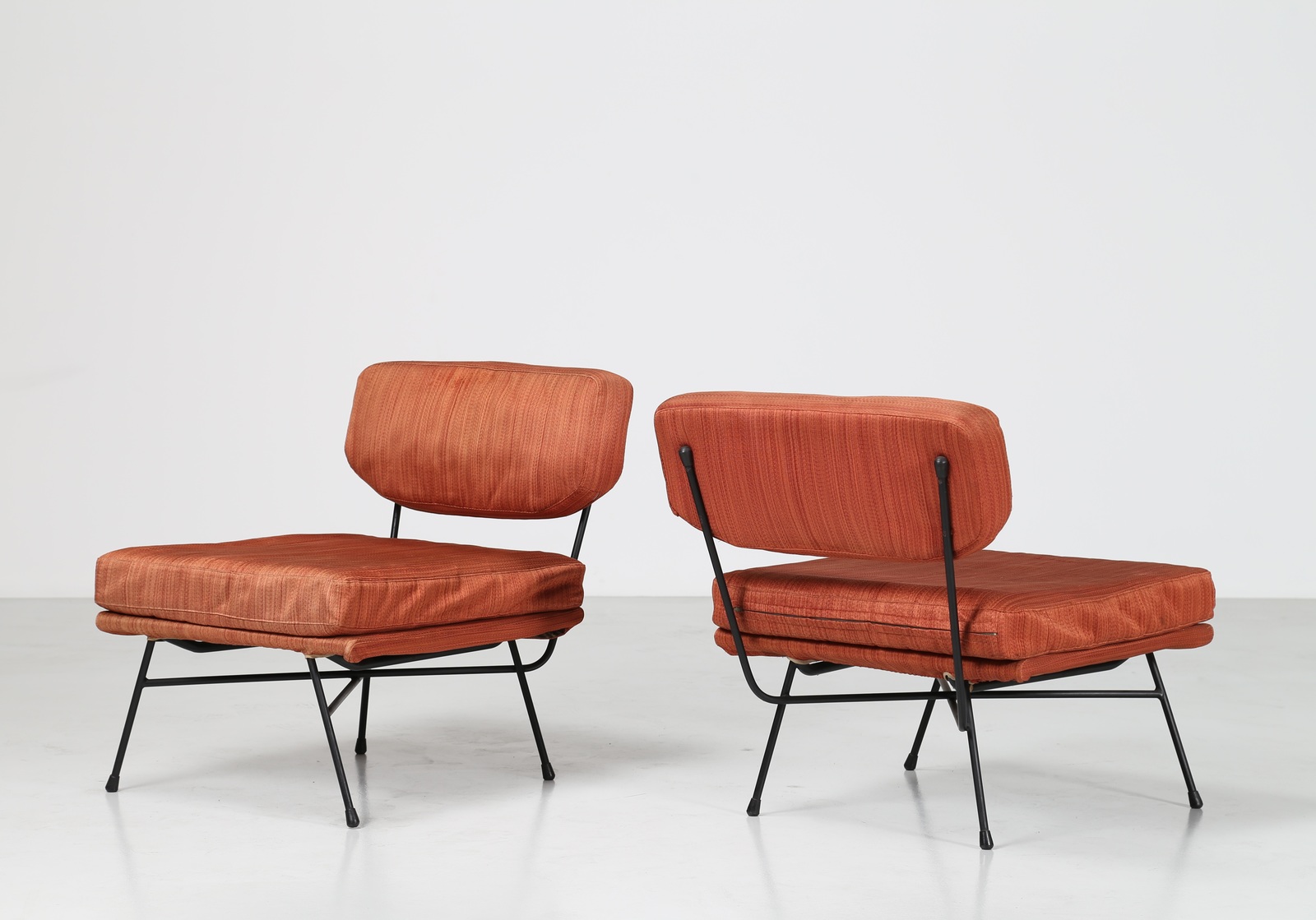 STUDIO BBPR (BANFI, BELGIOIOSO, PERESSUTTI, ROGERS) Coppia di poltrone in tondino di metallo e tessuto originale, mod. Elettra per Arflex, 1953.