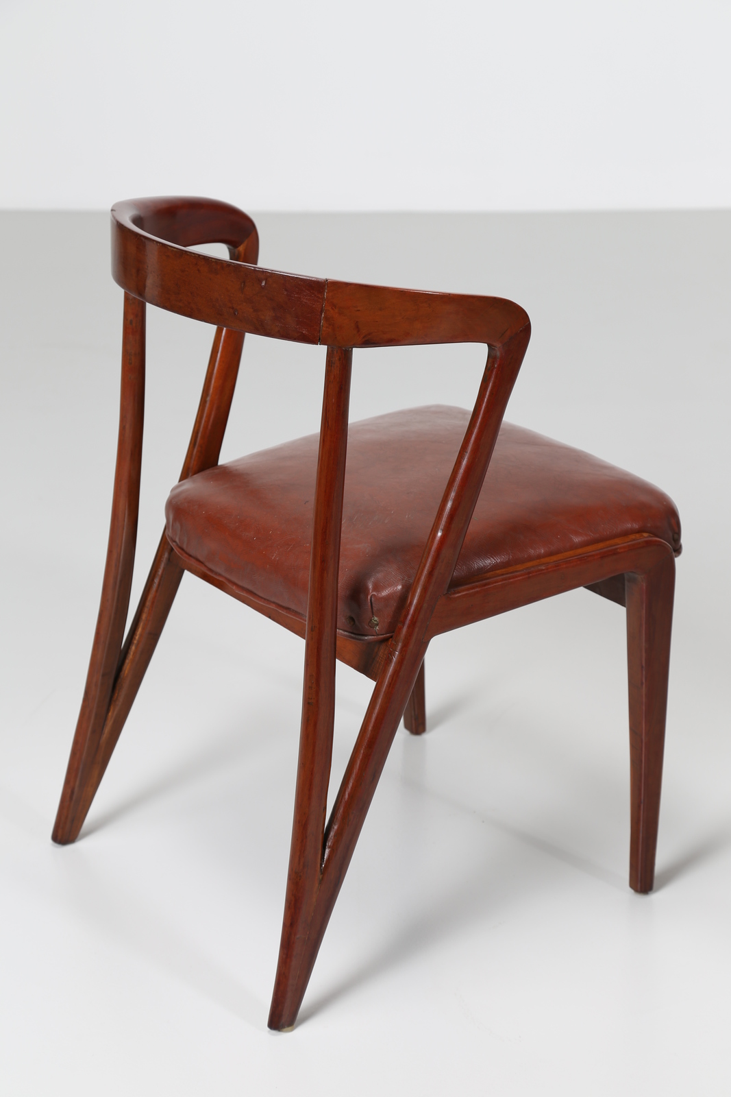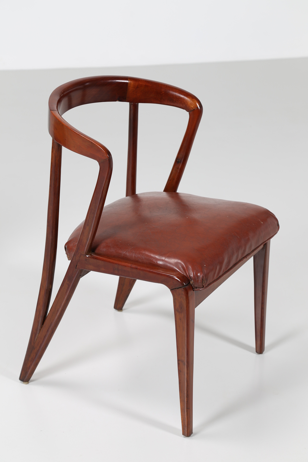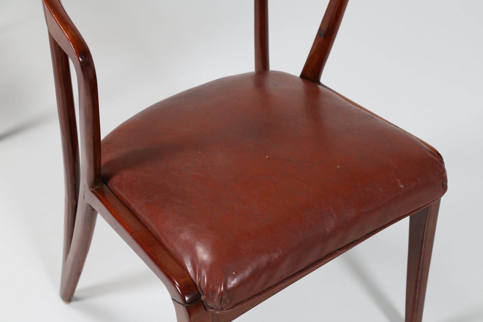 SCHAEFER BERTHA Six walnut and leather chairs, for Singer e Sons, 50’s. Literature; Singer e Sons producer’s catalog. . . Cm 50,00 x 77,50 x 53,00.