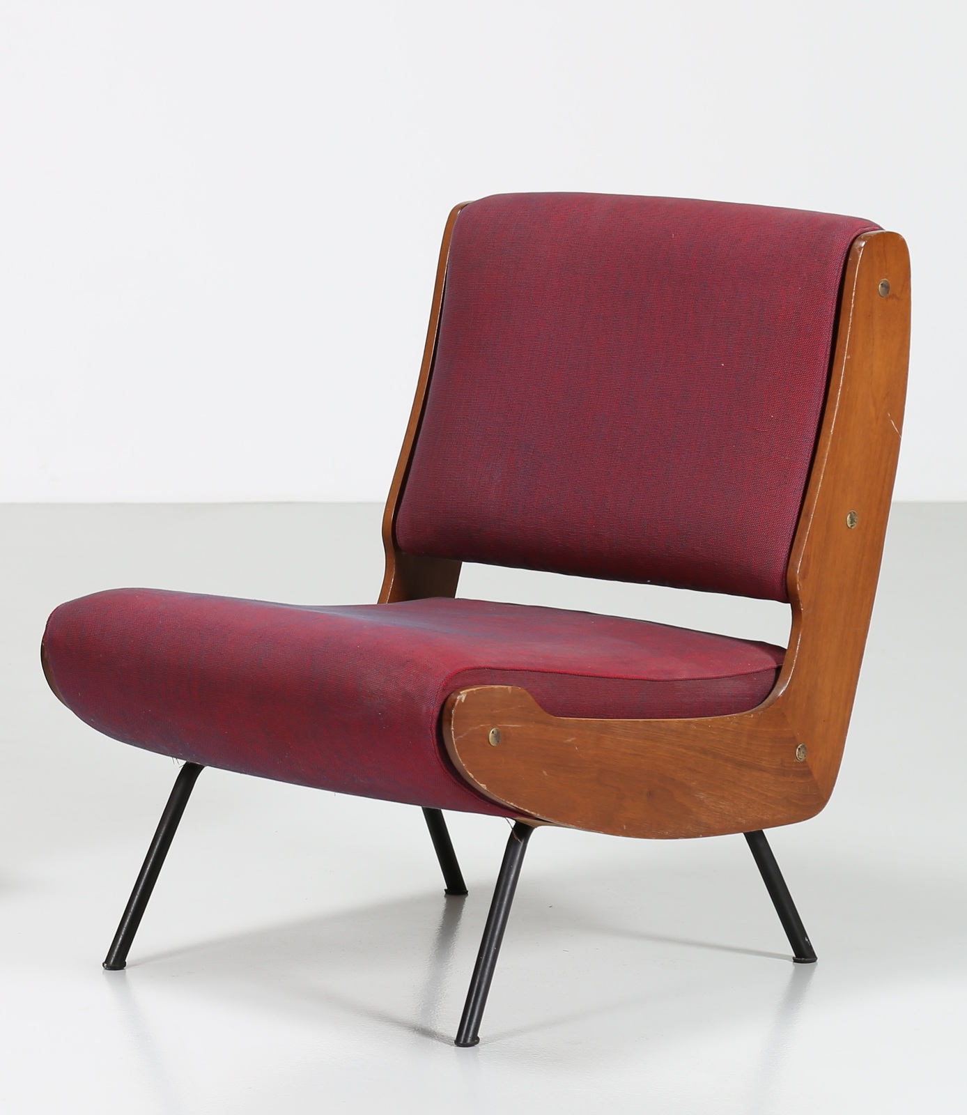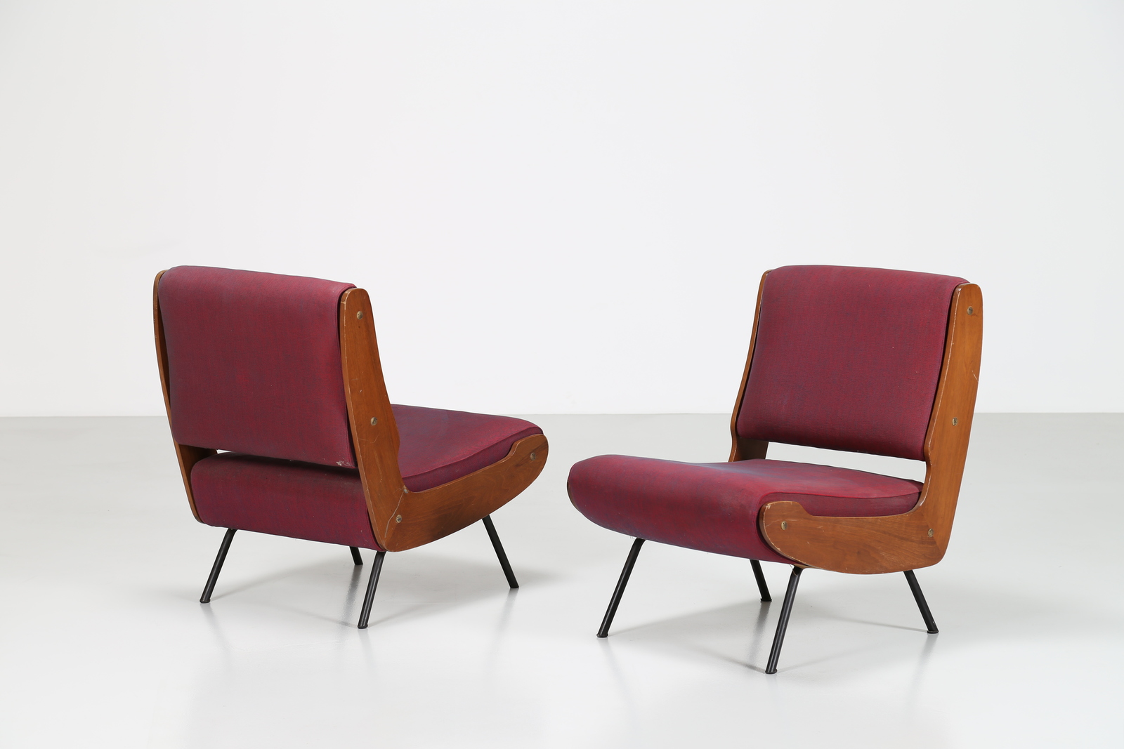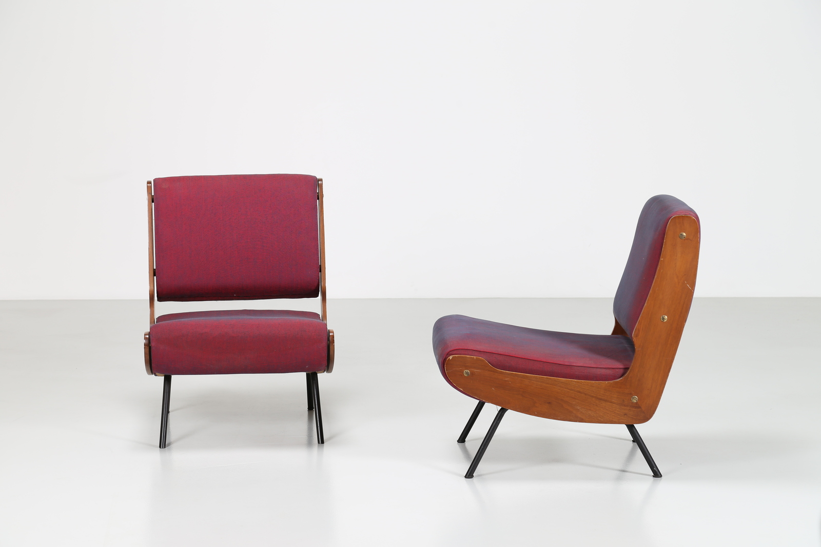 FRATTINI GIANFRANCO (1926 - 2004) Coppia di poltrone in metallo e legno, rivestimento in tessuto originale mod. 863, per Cassina, anni 50.