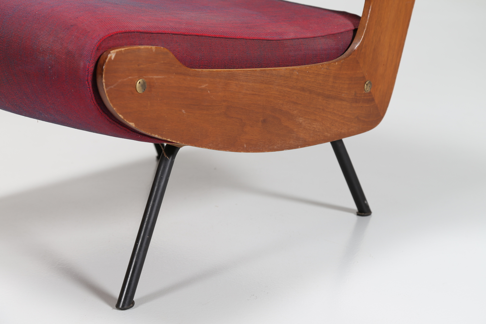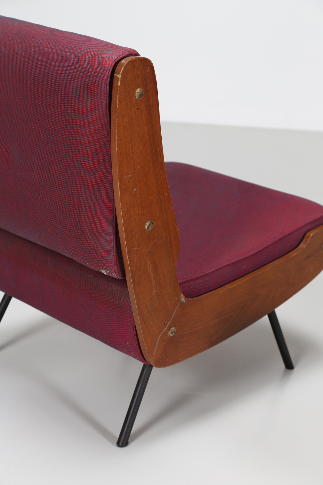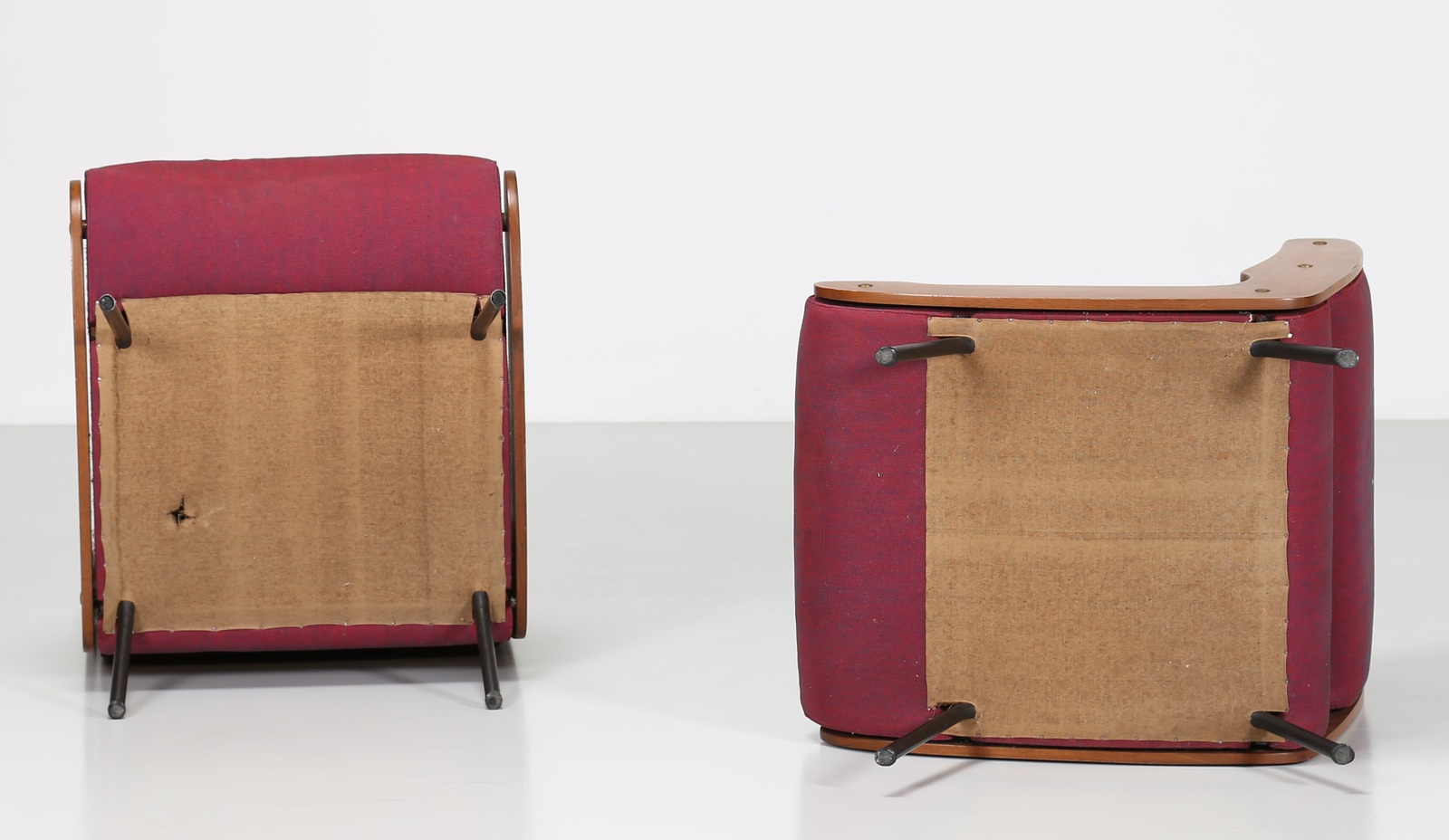 FRATTINI GIANFRANCO (1926 - 2004) Pair of metal and wood armchiars, original woven covering, mod. 863, for Cassina, 50’s. Literature; Domus num. 314 january 1956 pag. 98, sofà.