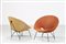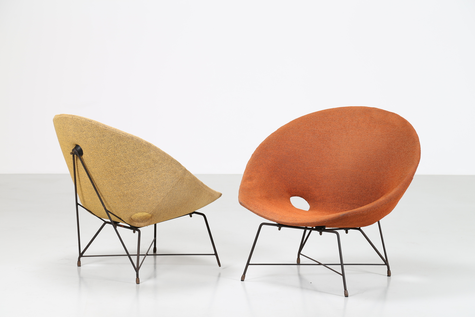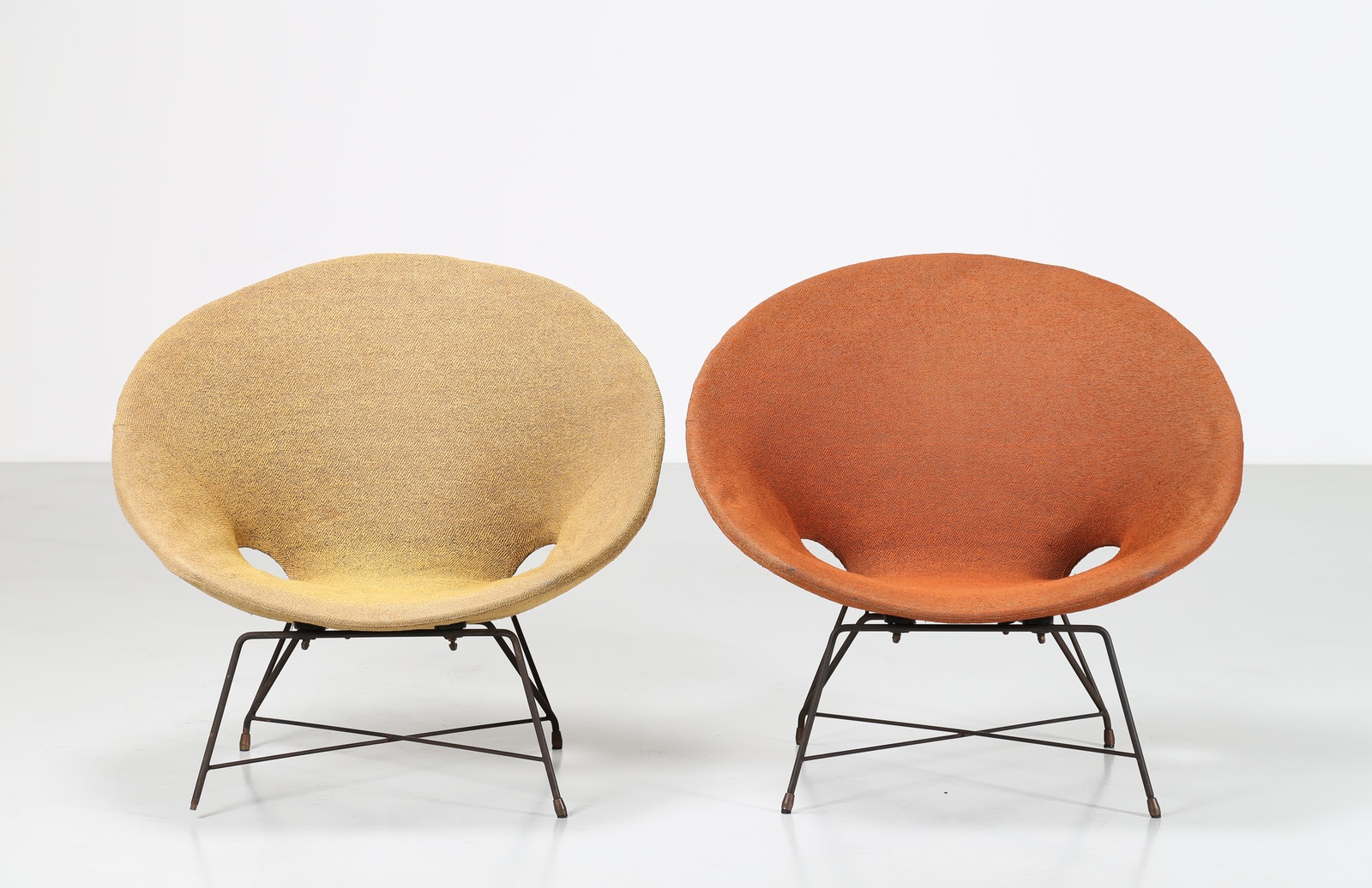 BOZZI AUGUSTO (1924 - 1982) Coppia di poltrone in metallo laccato nero con piedini in ottone e tessuto originale, mod. Kosmos, per Saporiti, 1954, etichetta originale presente. . Cm 98,00 x 83,00 x 87,00.