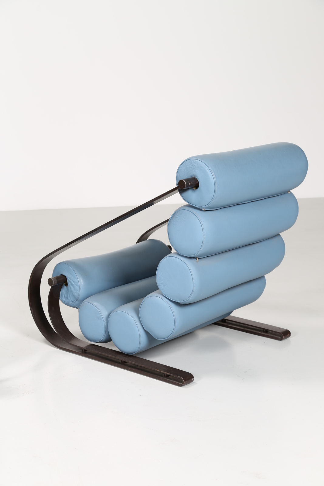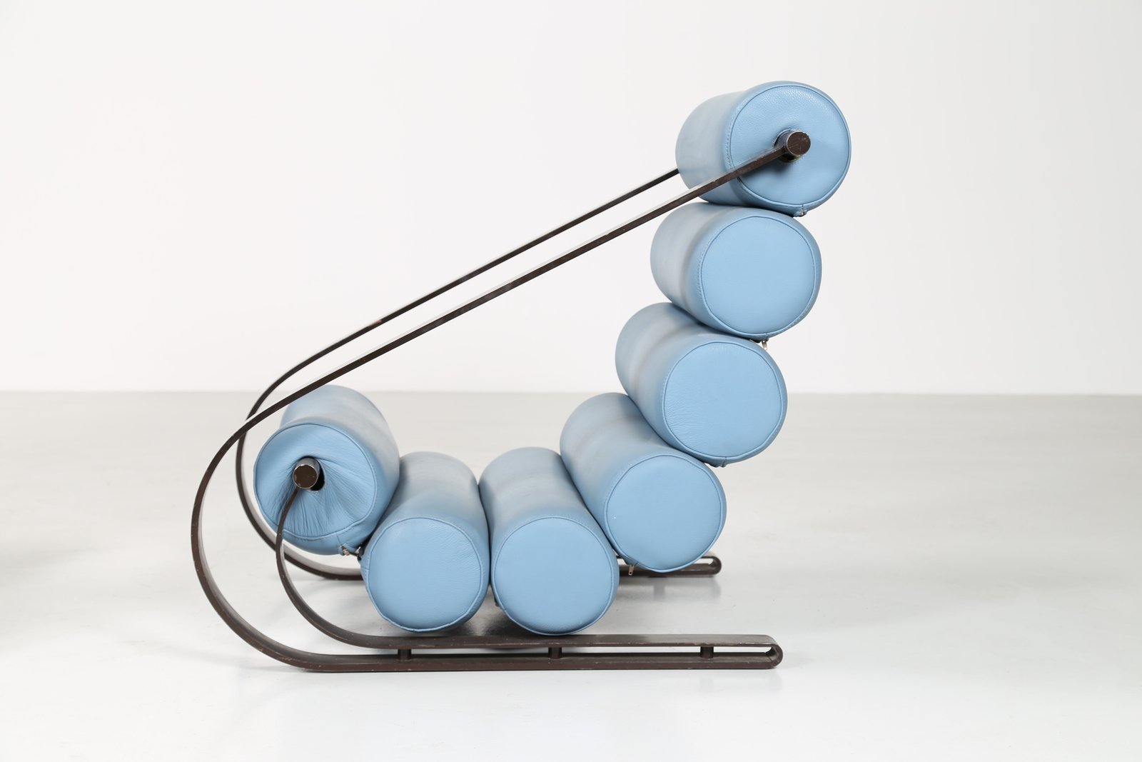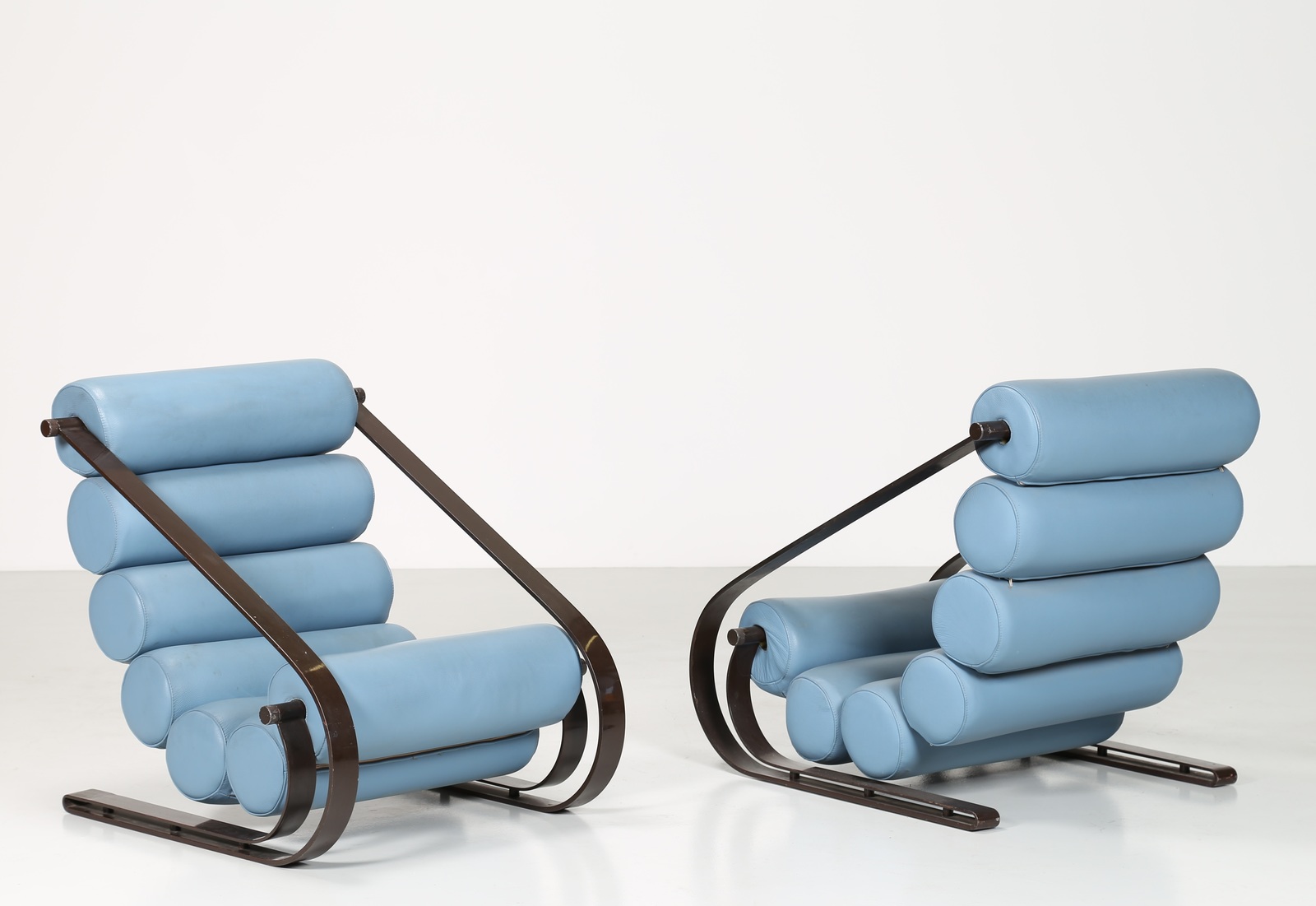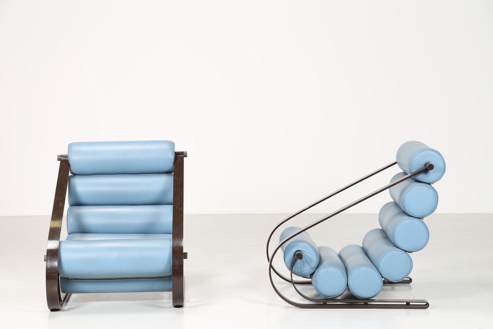 CECCHI MARZIO Coppia di poltrone in metallo laccato nero e pelle, mod. Balestra per studio Most Firenze 1970