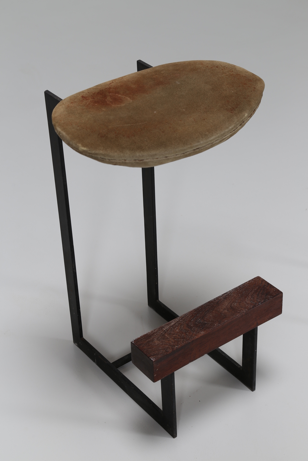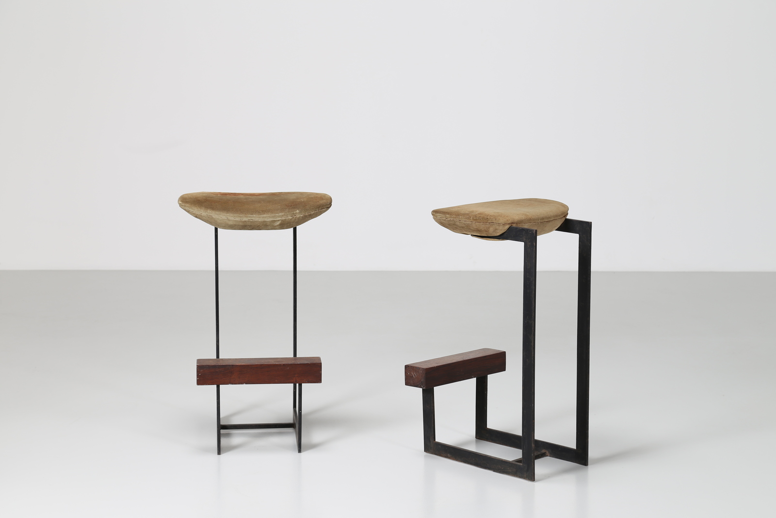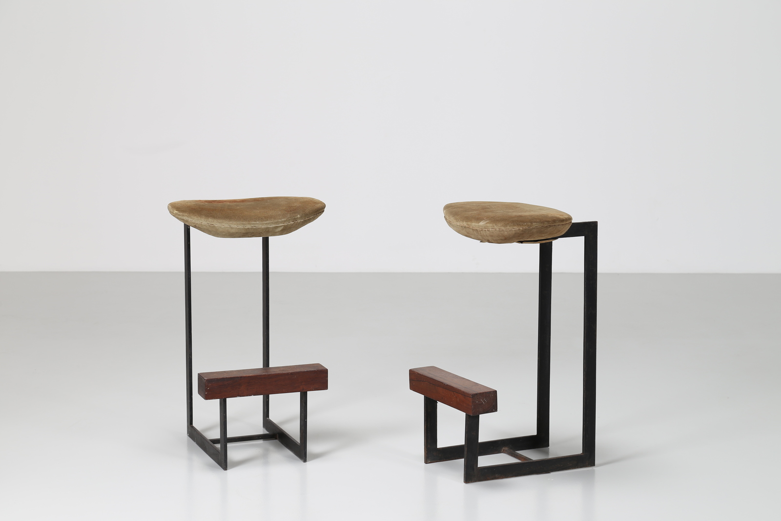 ZALSZUPIN JORGE Coppia di sgabelli in metallo poggiapiedi in legno e seduta in tessuto originale, mod. Gavea, per L’Atelier anni 50. . Cm 43,50 x 72,00 x 42,00.