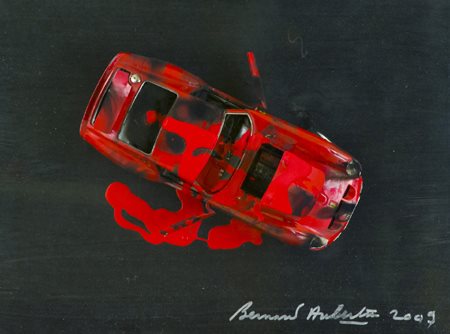 Bernard Aubertin Fotenay aux Roses 1934 Ferrari Modellino bruciato applicato su tavola dipinta, cm. 30x40, in teca di plexiglass Firmato in basso a destra. Autentica dell'Artista su foto.