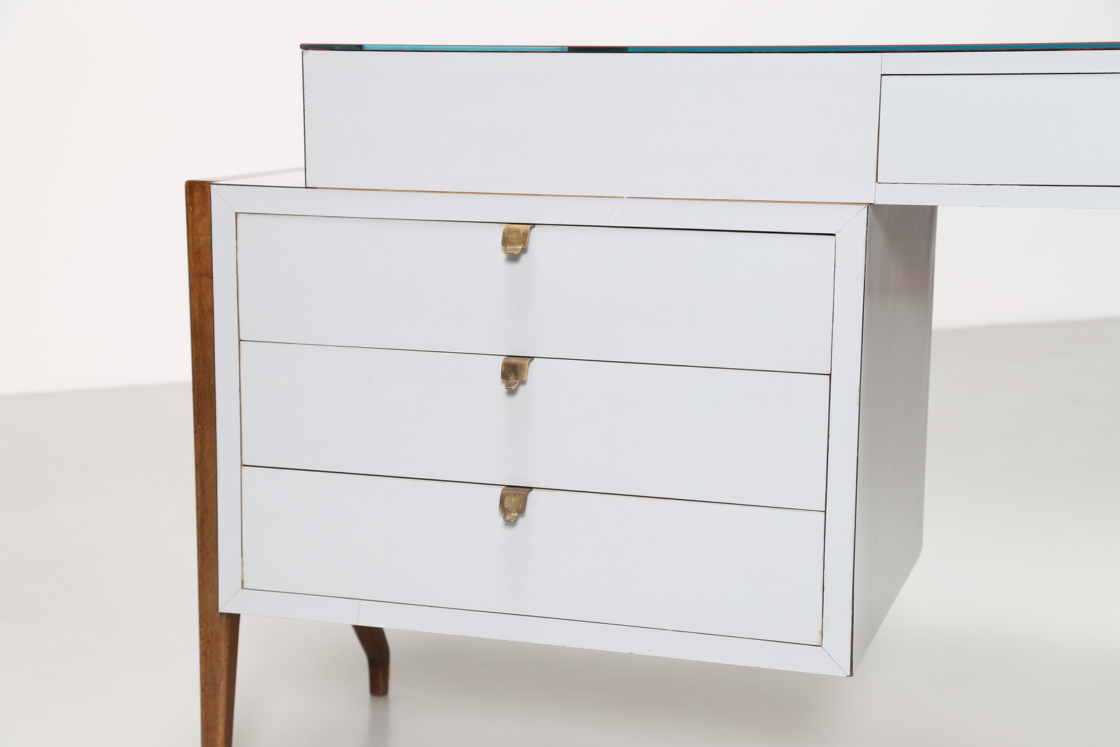 BEGA MELCHIORRE (1898 - 1976) Scrivania in noce legno laccato e formica con piano in cristallo, anni 50. -. Cm 158,00 x 80,50 x 59,50.