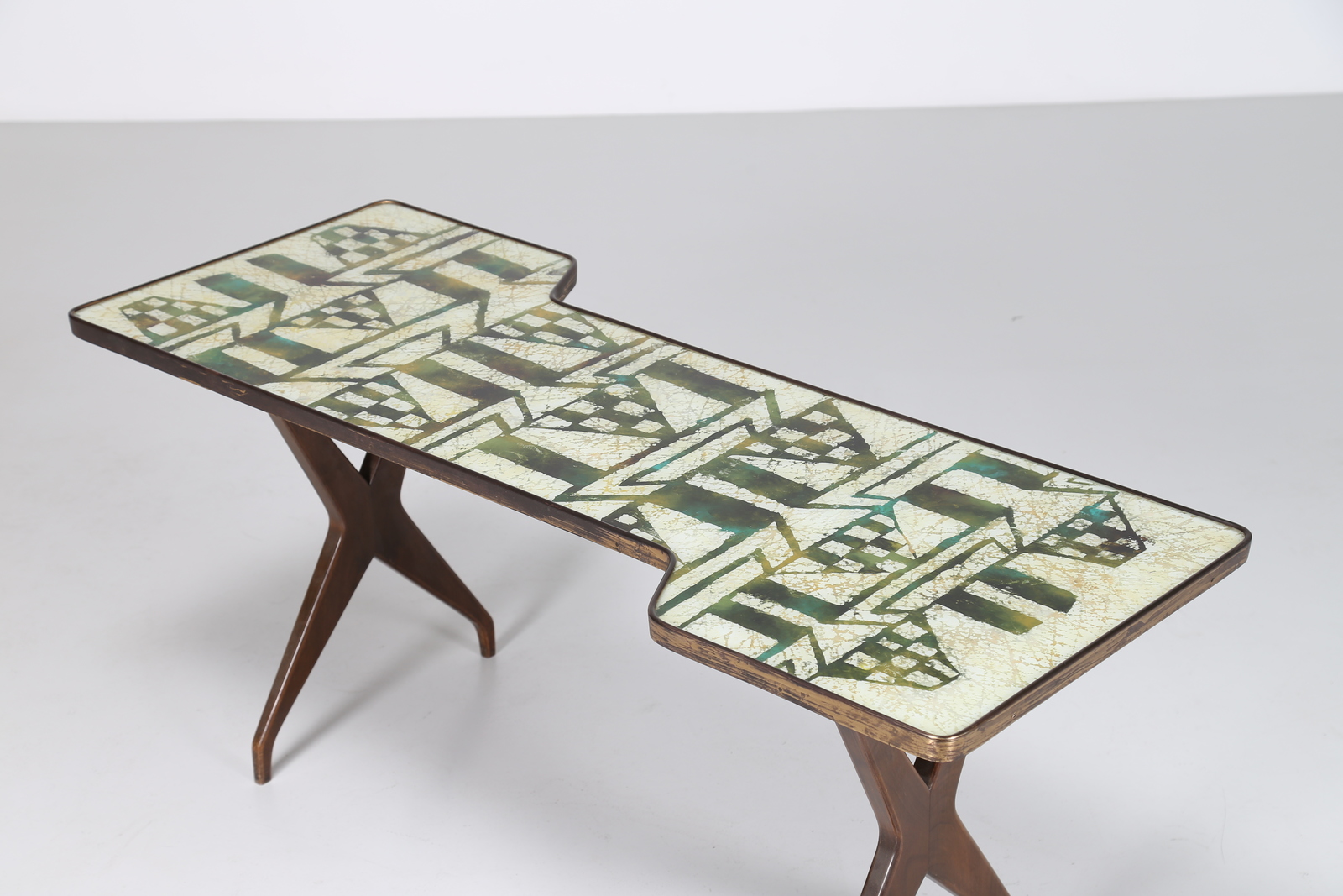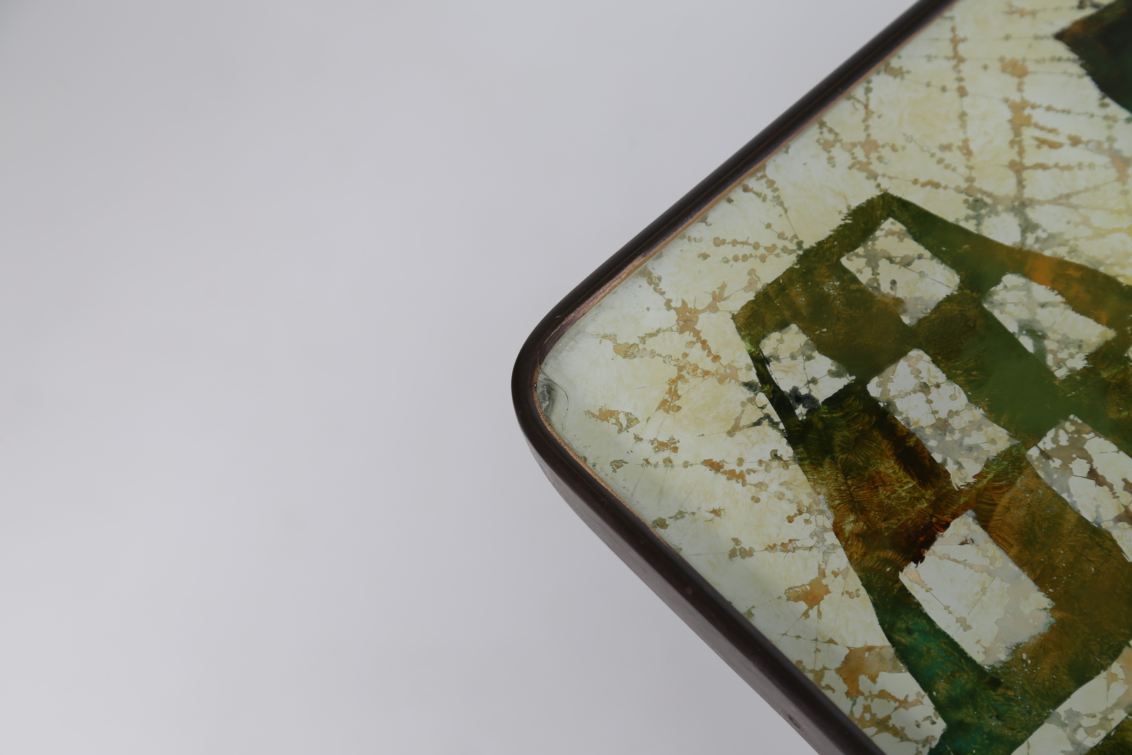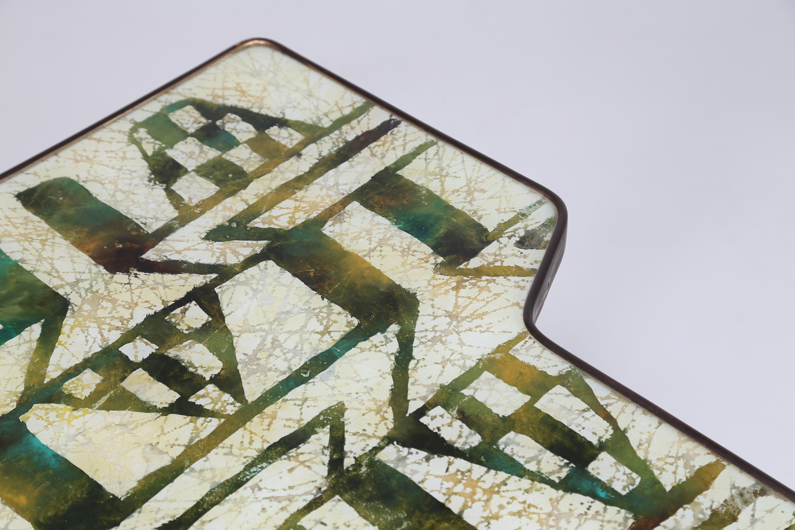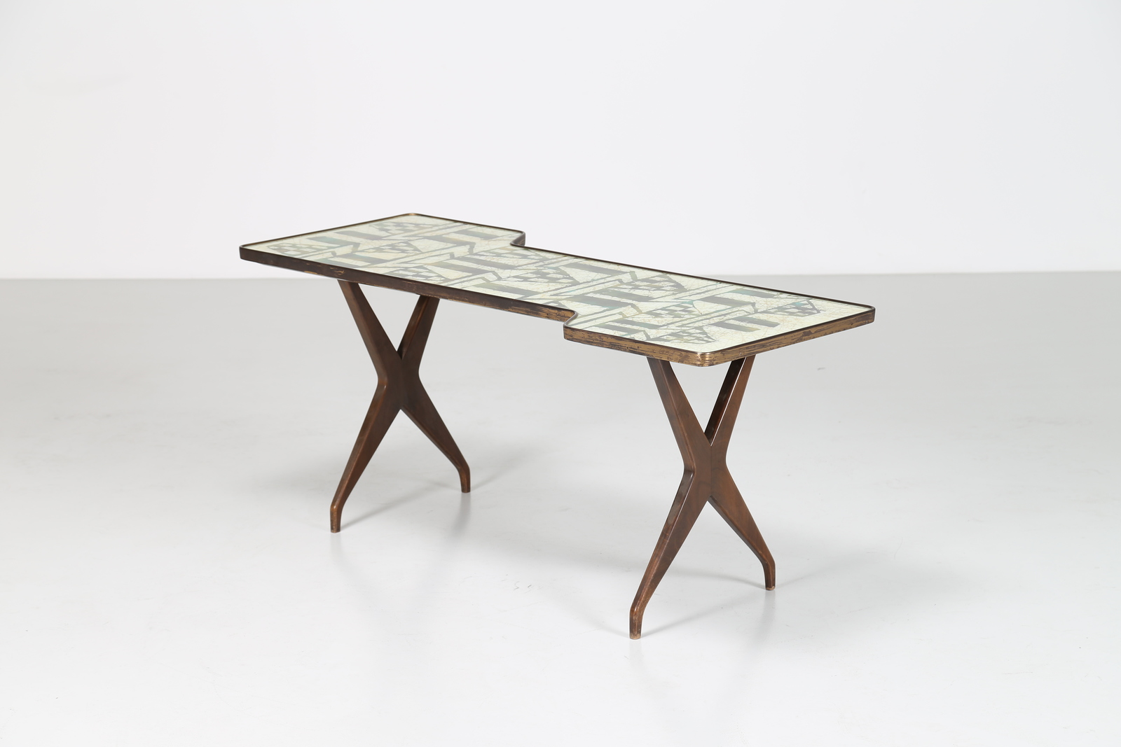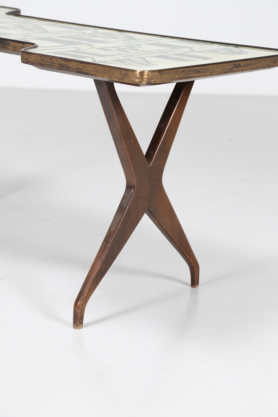 BEGA MELCHIORRE (1898 - 1976) Tavolino in legno con bordo in ottone e piano in cristallo decorato, per casa Volterra Bologna, anni 40. -. Cm 131,00 x 61,00 x 50,00.