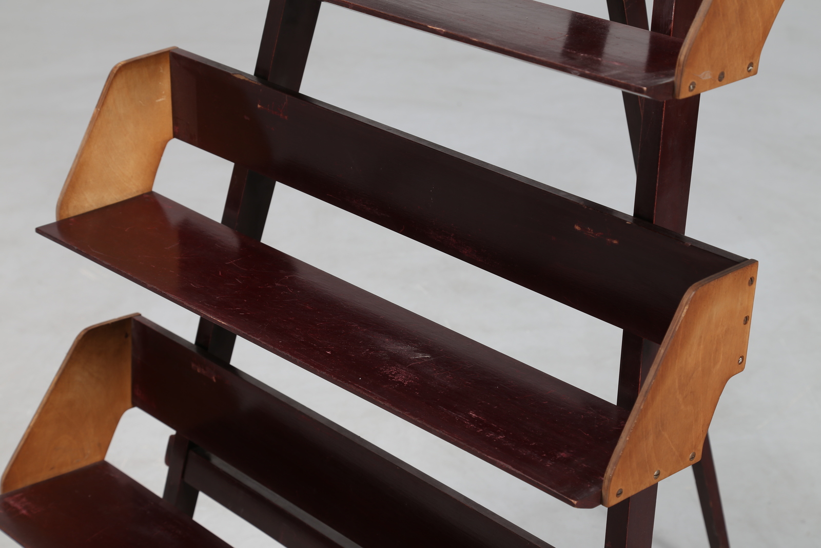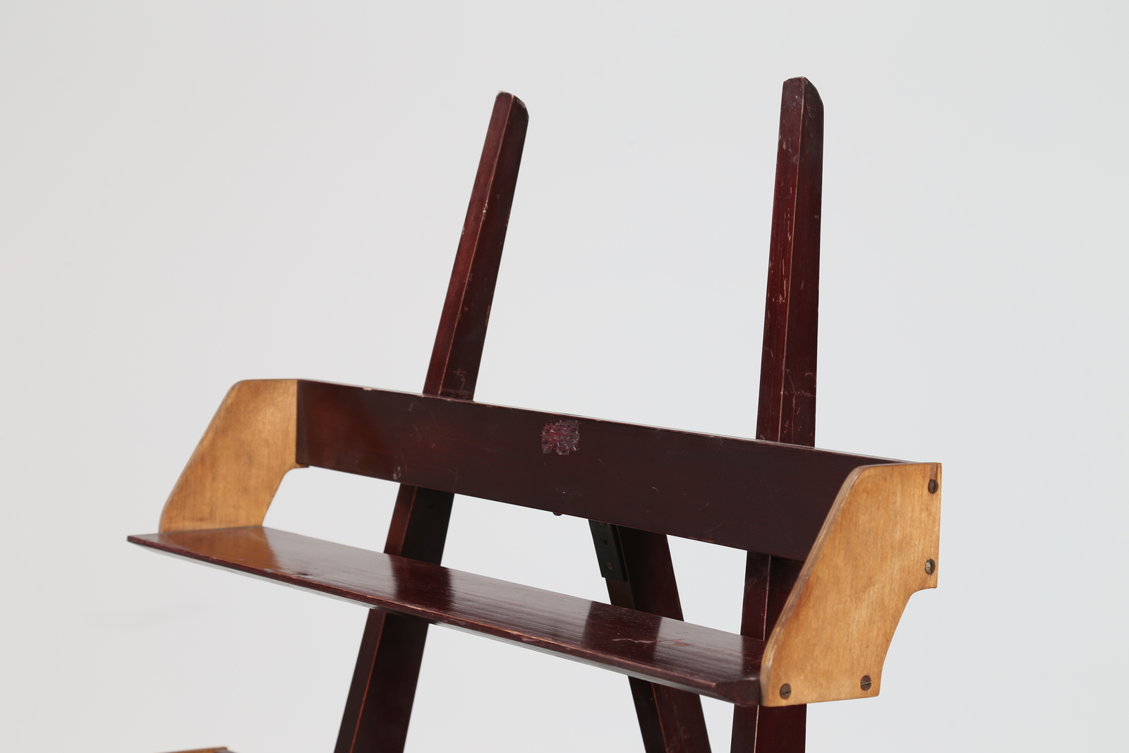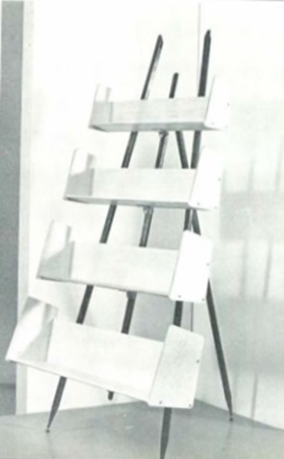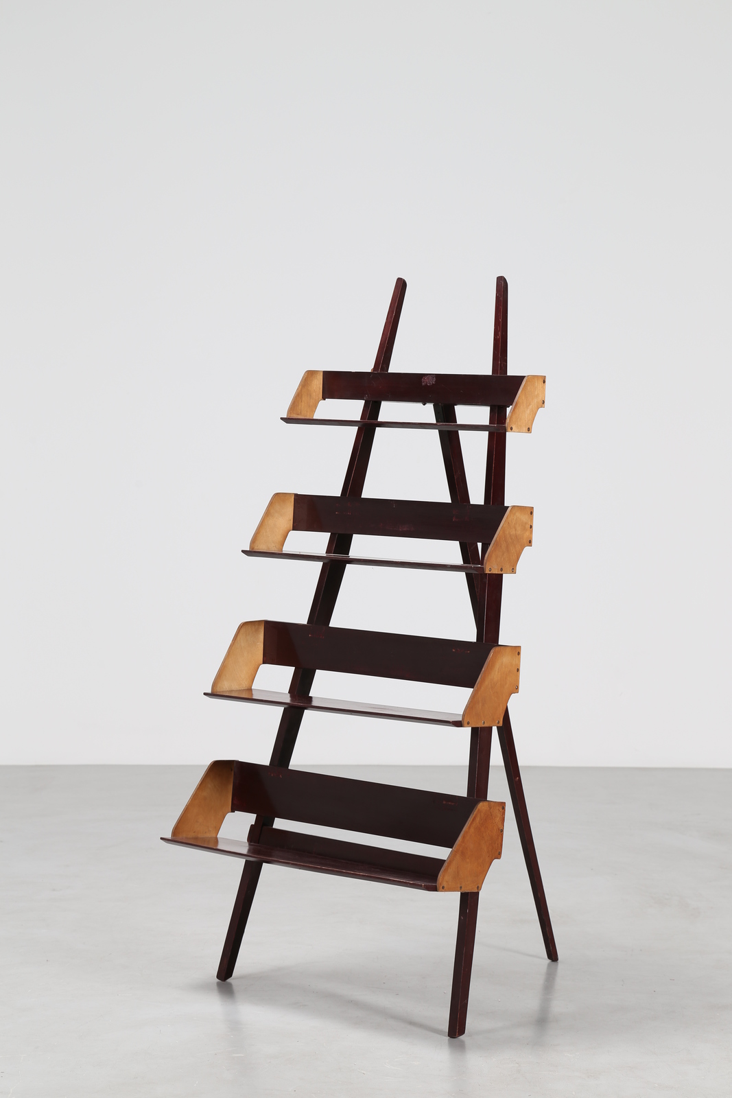 CLAVARINO AMEDEO Decomposable easel bookcase, birch wood structure and levels, for Bazzani Bovisio, 50’s. Literature; Domus num. 314 january 1956 pag. 69. . . Cm 80,00 x 150,00 x 50,00.