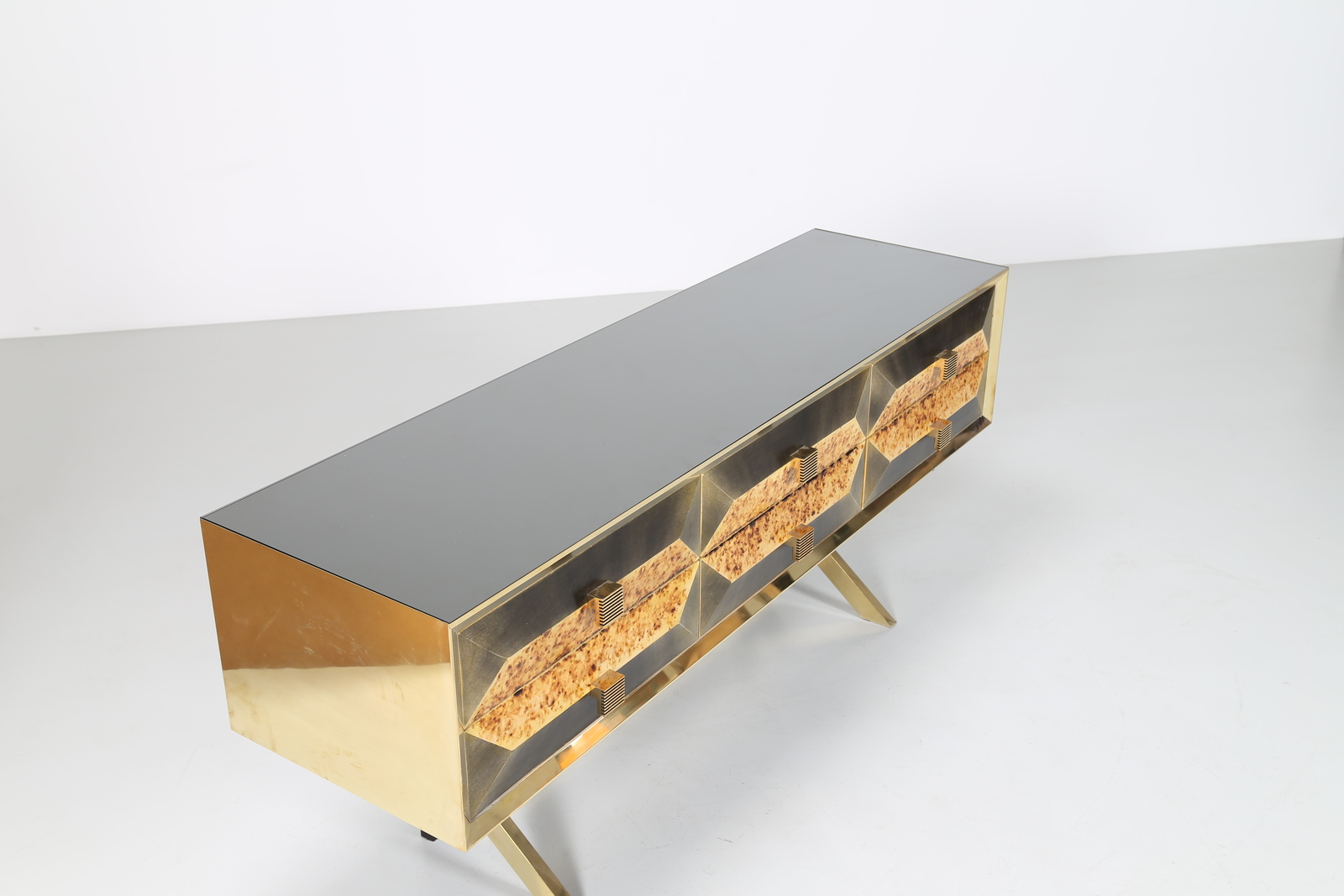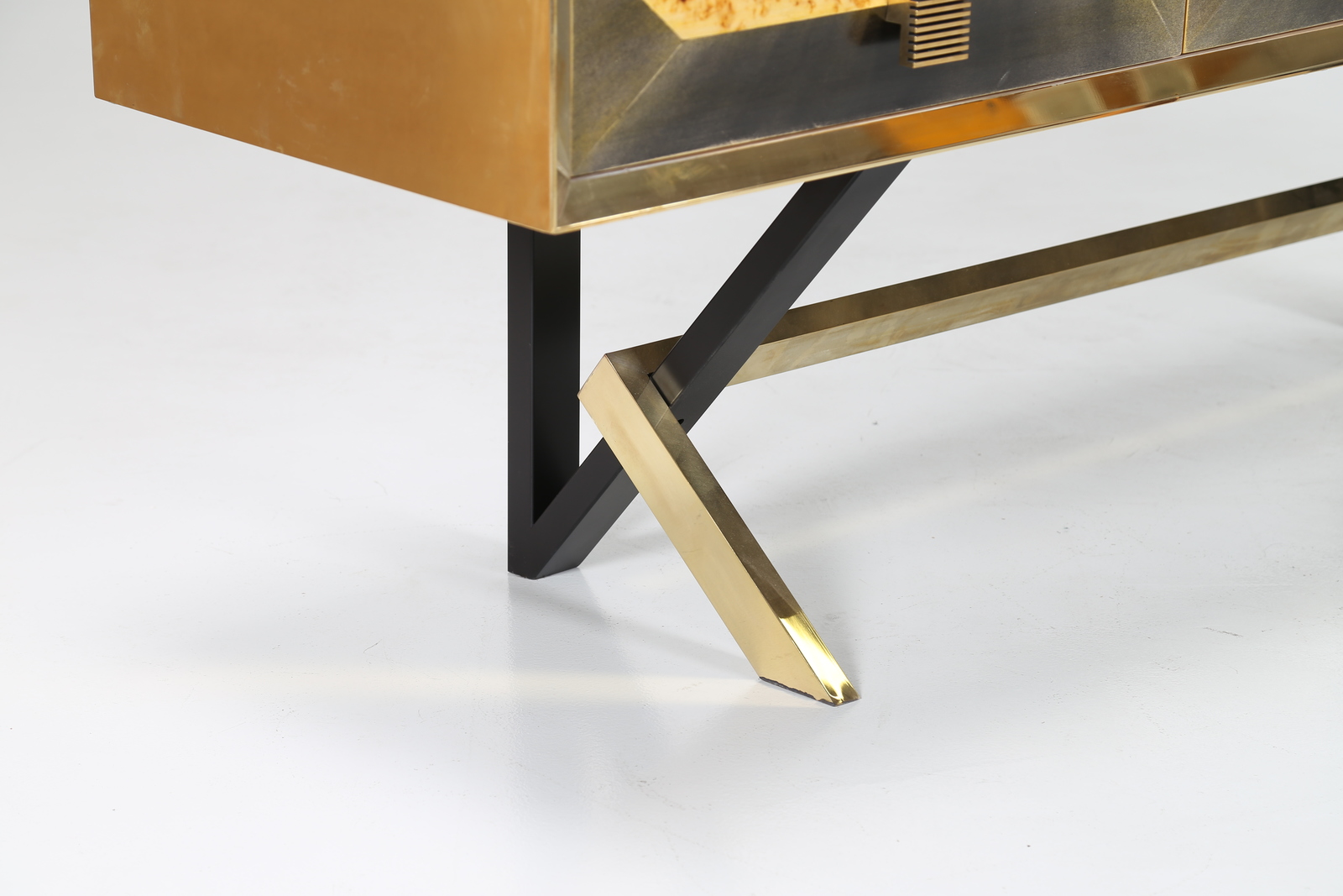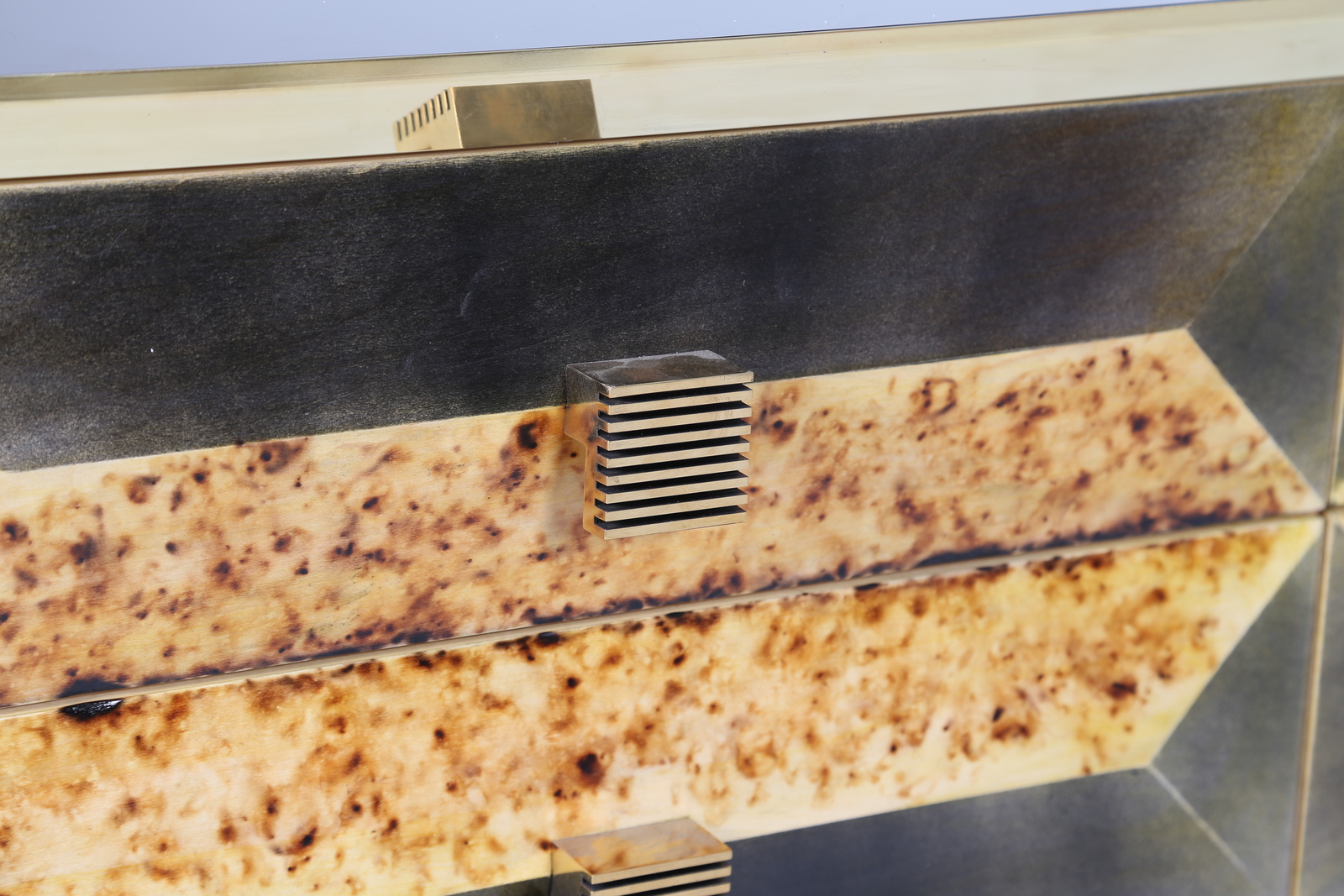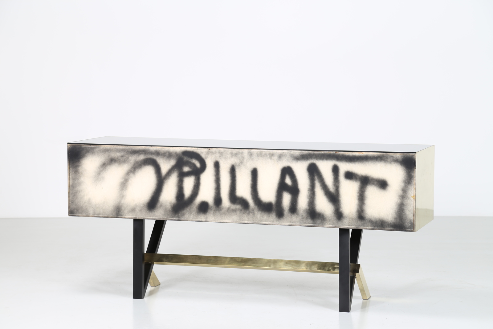 PILLANT MORDECAI Wood and brass comò, lacquered iron and brass legs, drawers with combustion decoration, 2015.
