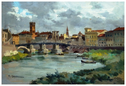 FRANCO COLELLA Bari 1900 – Bari 1979 Ponte della Fortezza, Passerella provvisoria 1956 Olio su tavola 25 x 35. Firma in b. a s.; sul verso titolo, data e firma + scritta di esposizione “6° esposizione Galleria Ciardelli, Pisa, 1956” + altra firma ignota. B.A.: OFFERTA LIBERA