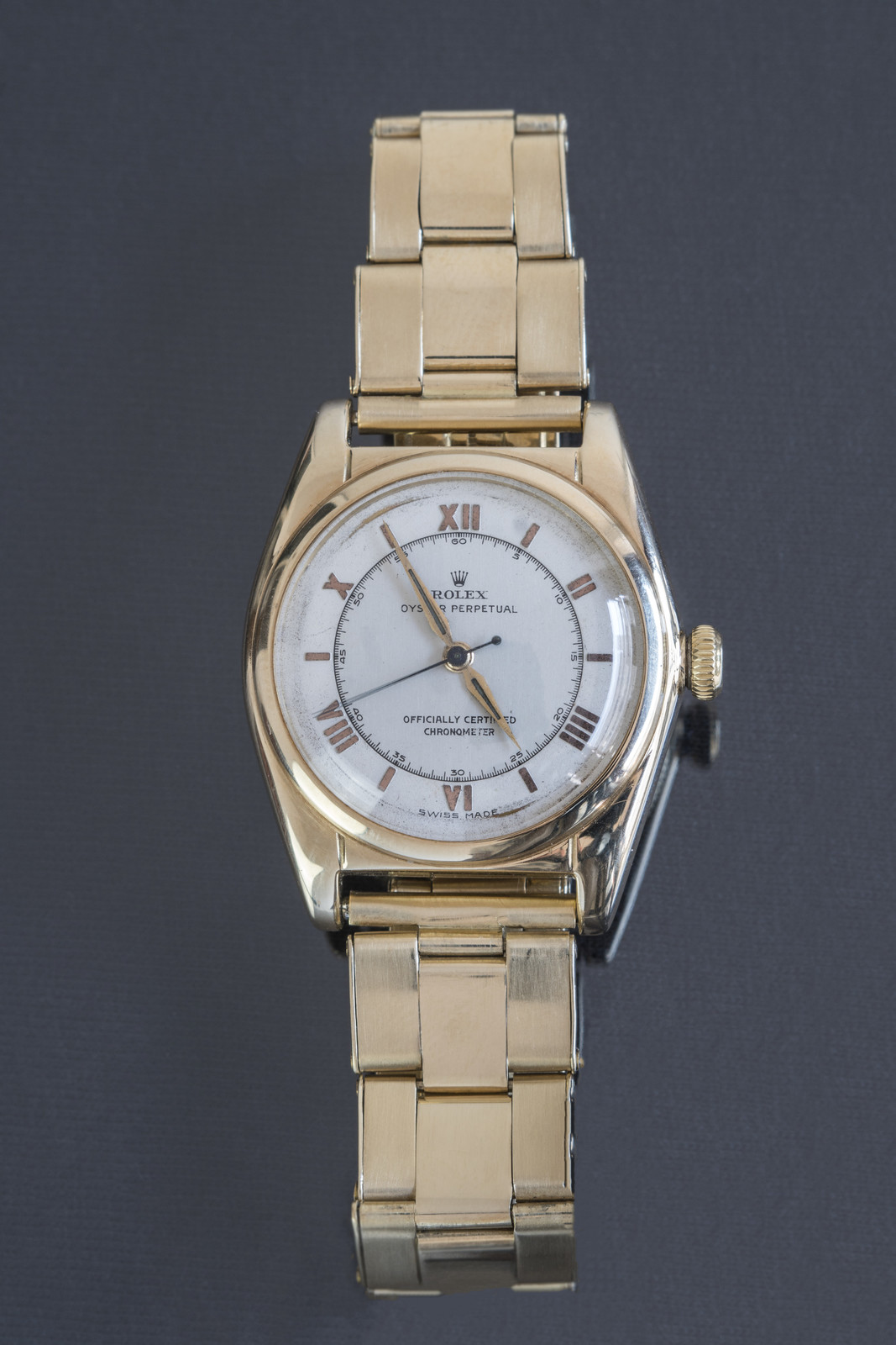 ROLEX Orologio da polso Rolex Ovetto Bubble back, anni ' 50 in oro 14kt movimento automatico, bracciale in oro rivettato. . .