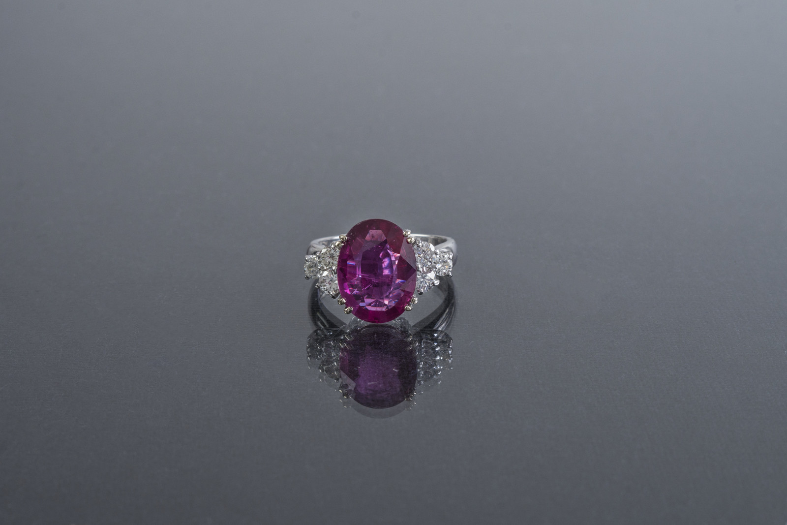 [Nessun Autore] Anello con rubino naturale no heat certificate GRS, cts 5.56 e diamanti cts 0.72. -. .
