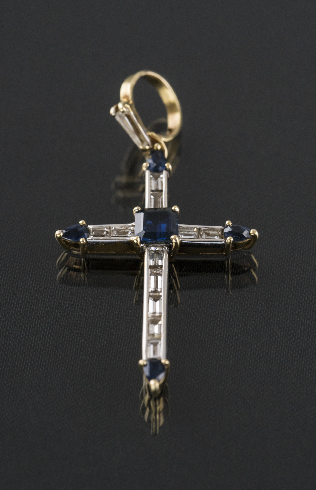 [Nessun Autore] Croce in oro bianco con baguette e zaffiri. . -. .