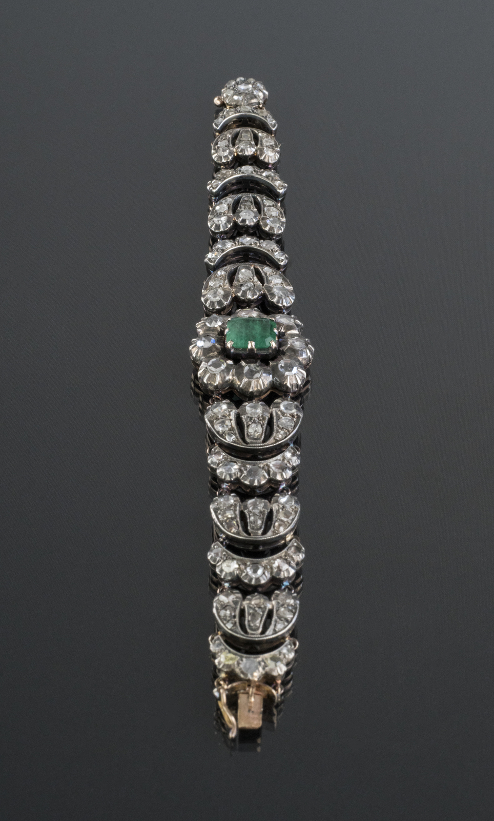 [Nessun Autore] Bracciale in oro e argento con diamanti rose cut e smeraldo centrale. . -. .