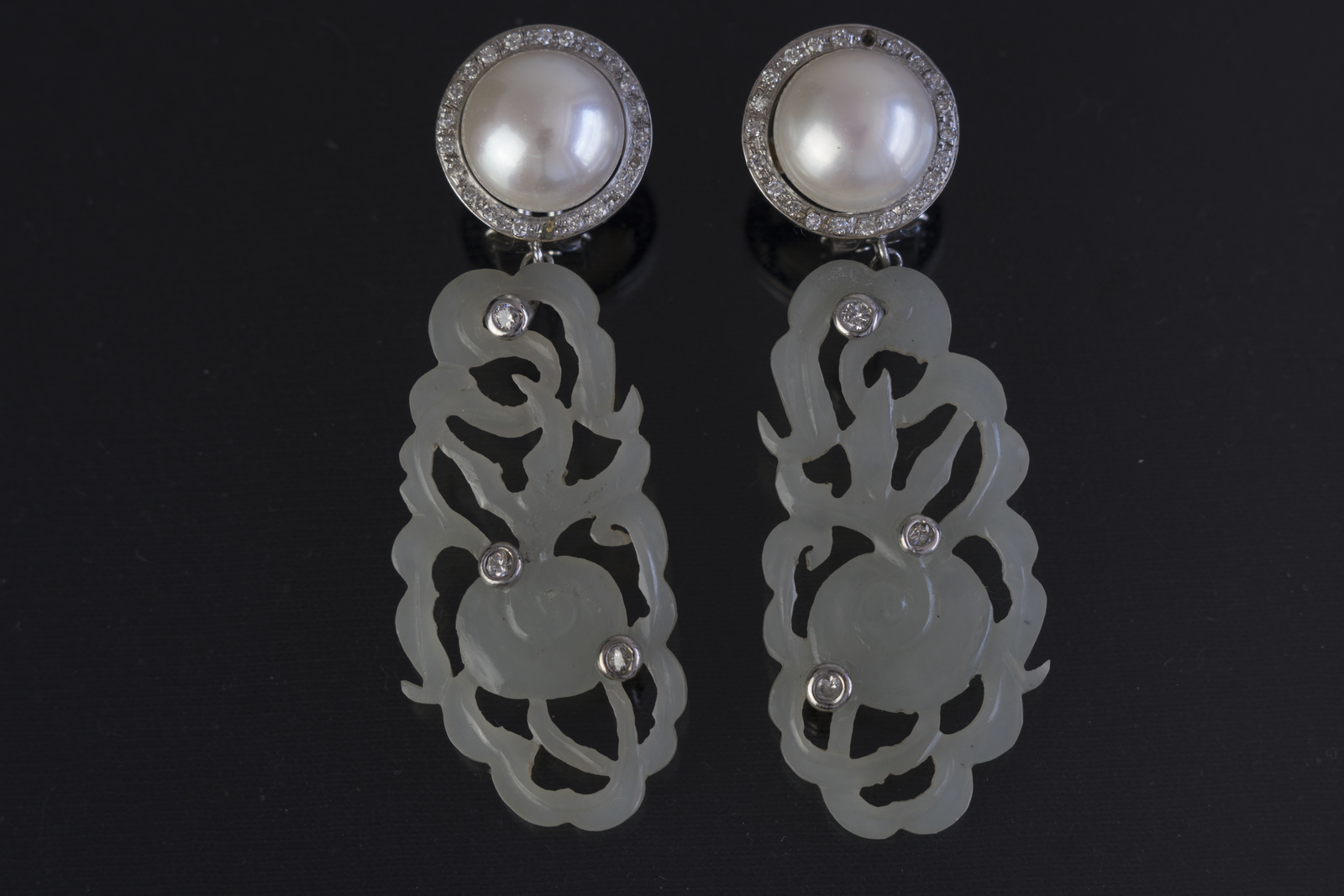 [Nessun Autore] Un paio di orecchini in perle di fiume e giada gr 9.90 brillanti per cts 0.65. -. .