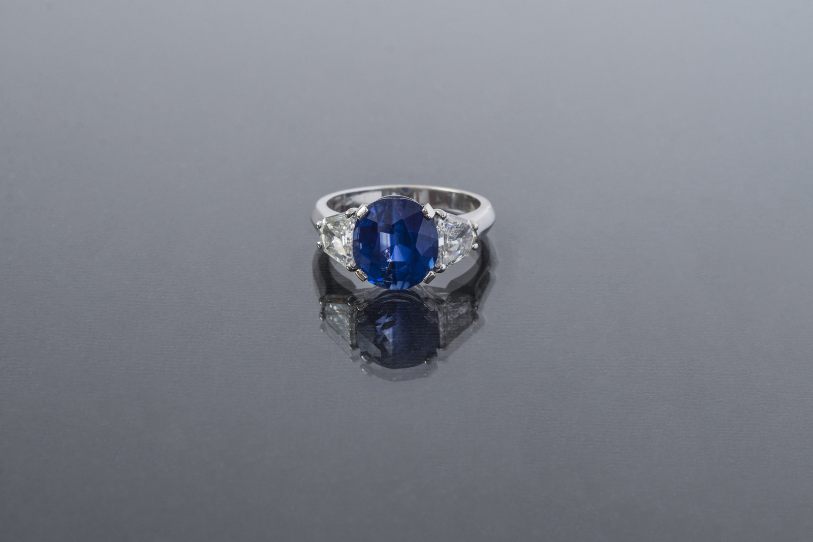 [Nessun Autore] Anello con zaffiro kashmir no heat certificato SSEF cts 4.59 fiancheggiato da due diamanti per cts 0.50 ciascuno circa. . -. .