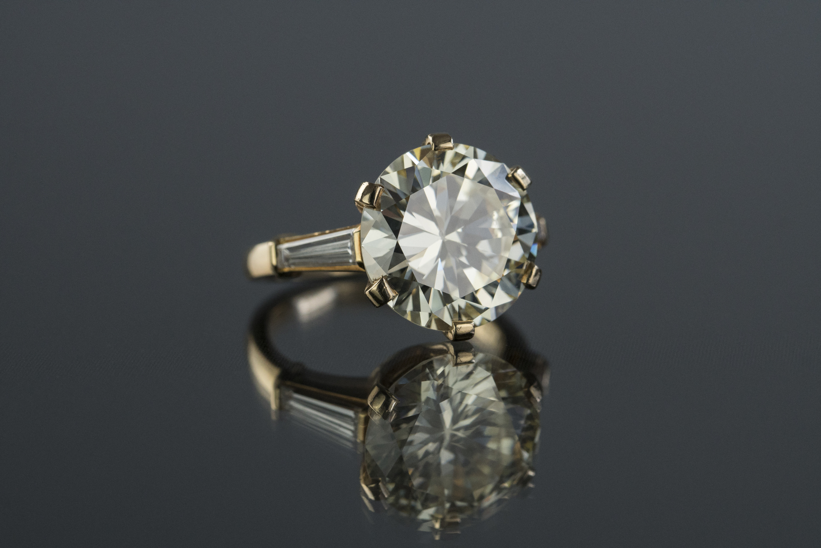 BULGARI Anello con diamante centrale per cts 7.65 e due taypers laterali per...