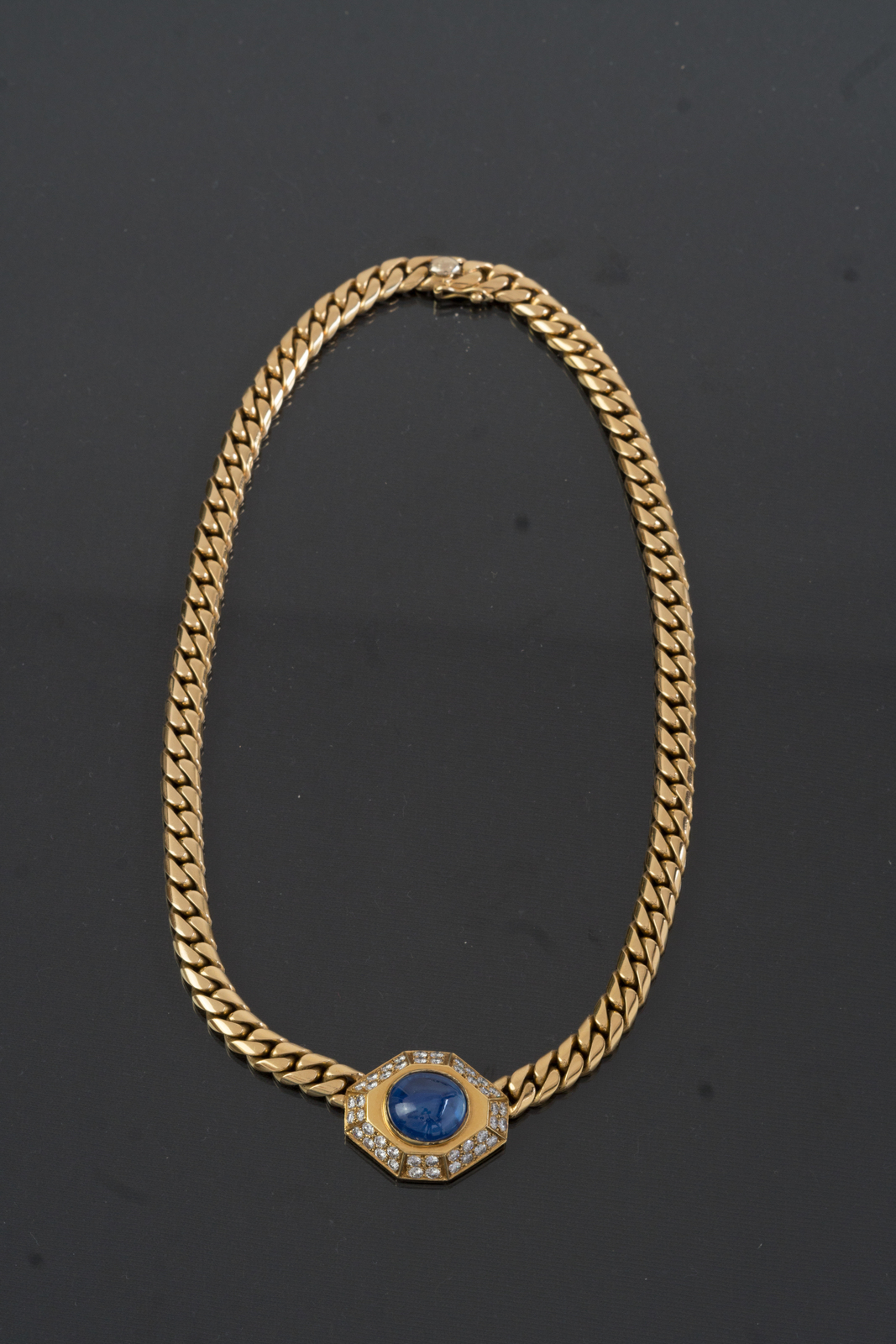 BULGARI Collana in oro giallo gr 78.30 firmata Bulgari con cts 1.75 di diamanti con al centro uno zaffiro Kashmir di cts 10.48. -. .