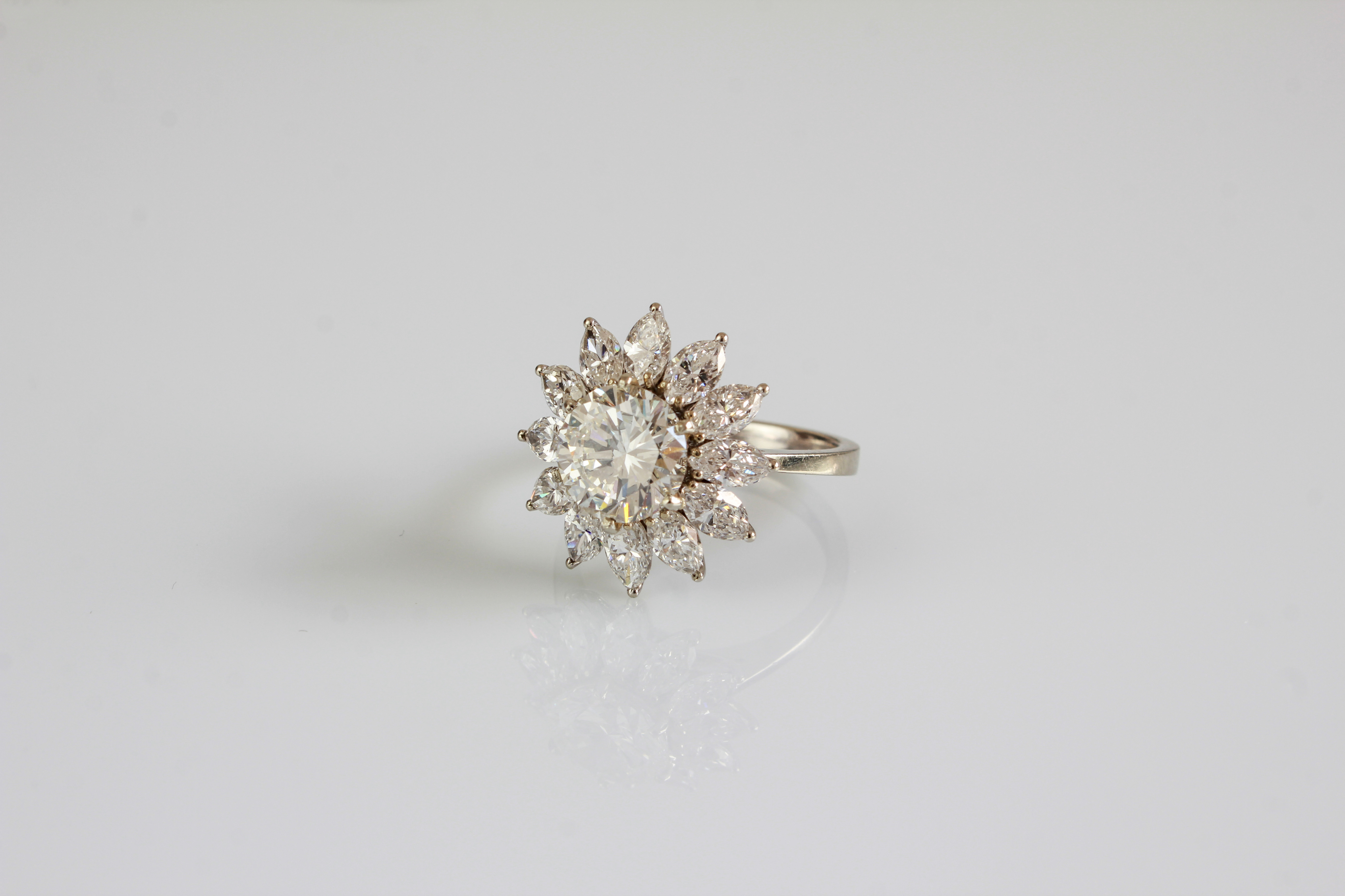 Anello in oro bianco di gr 5.70 con un diamante centrale di cts 2.12 colore I-IF ( certificato IGI n. 43028) contornato da diamanti navette per cts 2 circa. . -. .