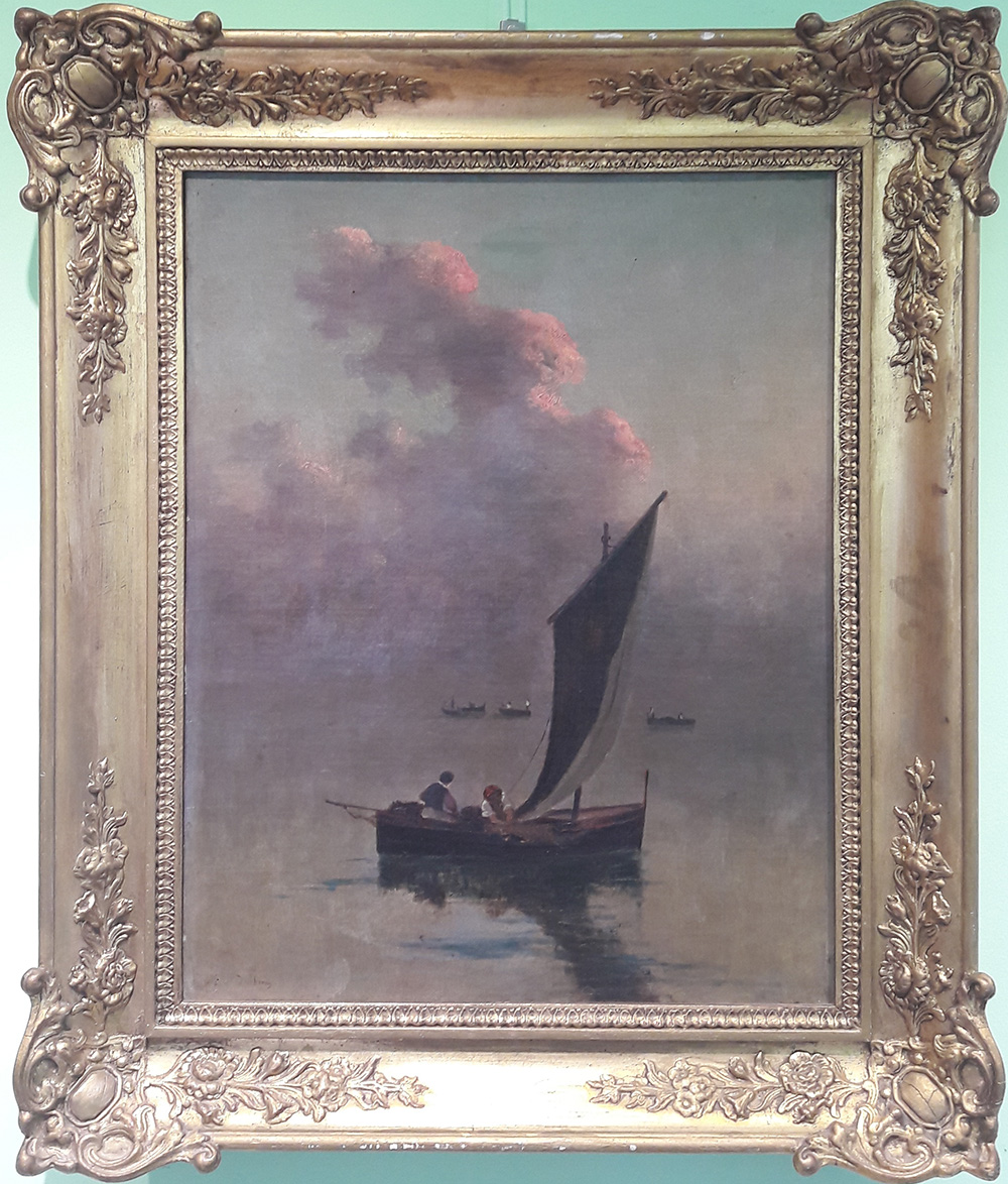 Scuola nordeuropea dell'800 "Barche al tramonto" - Olio su tela - cm 50x40 - opera corredata di cornice coeva. Firma dell'artista non decifrata in basso a sx