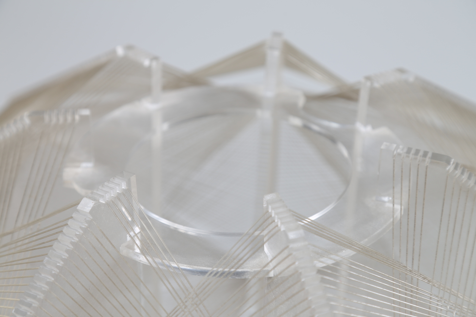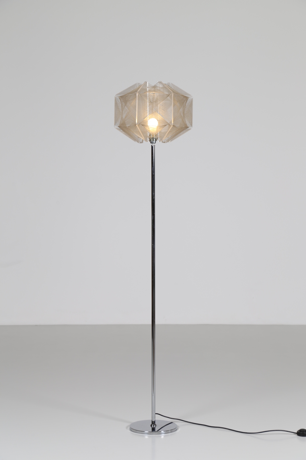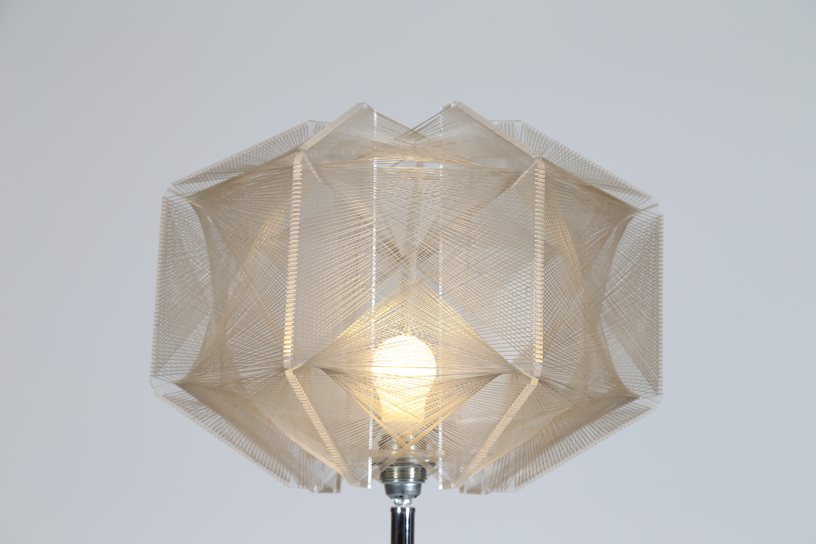 SECON PAUL (1916 - 2007) Lampada da terra con sottile fusto in metallo cromato e diffusore in plexiglass e fili di nylon intrecciati, mod. Swag, per Sompex anni '60, Germania.