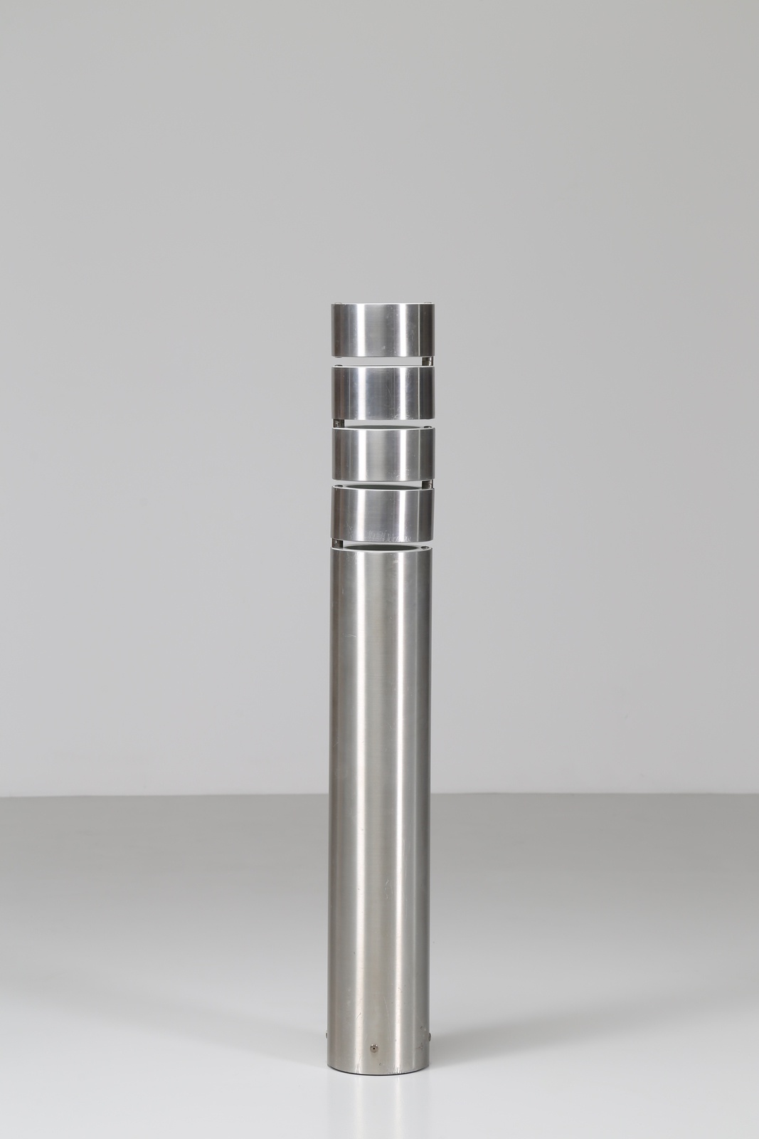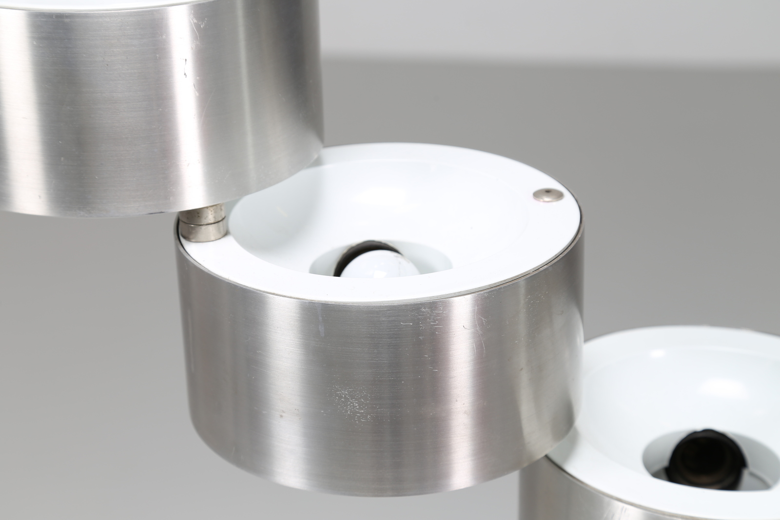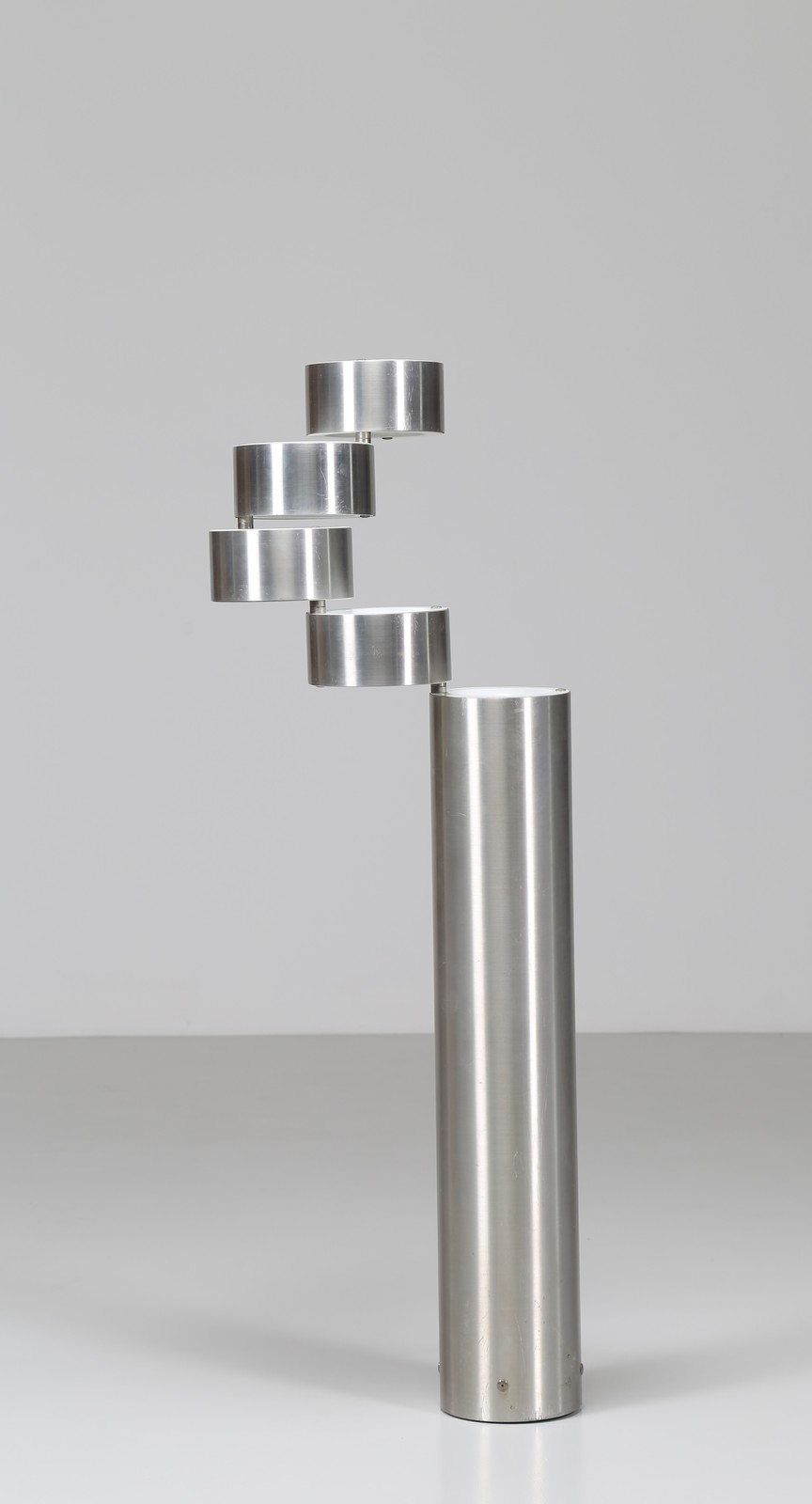 STILUX Lampada da terra in metallo spazzolato, quattro segmenti mobili di luce, produzione Stilux anni 70. Etichetta originale presente.