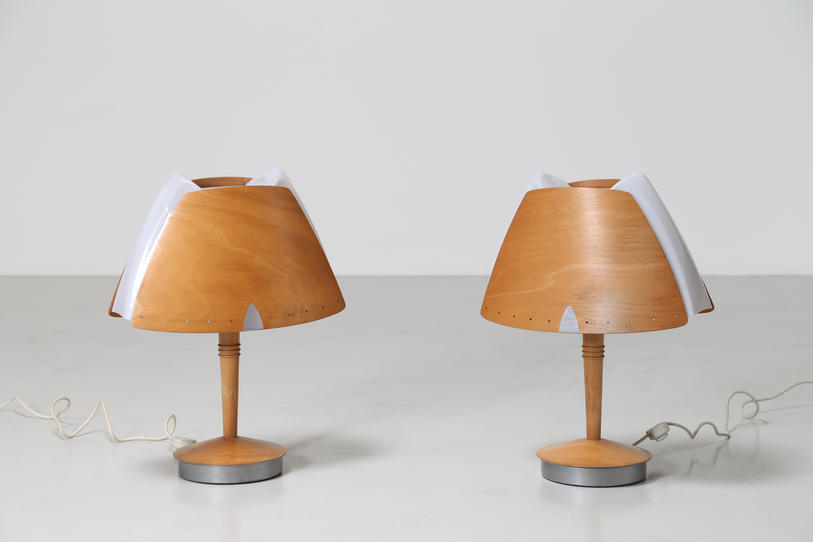 - Pair of curved wood, metal and plexiglass table lamps, designed for the Barcelona Hilton hotel 1970. . . Cm 48,00 x 65,00 x 24,00.