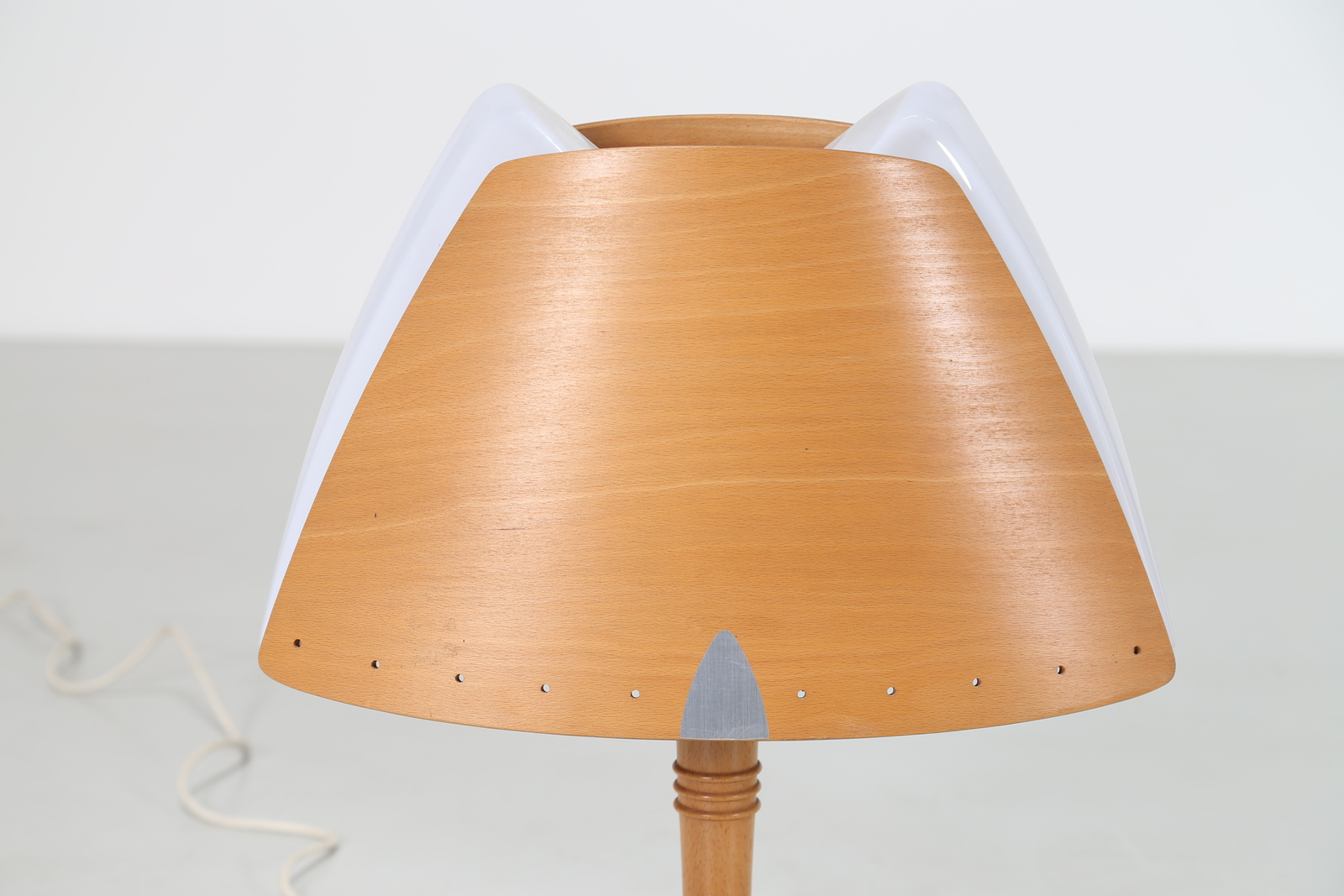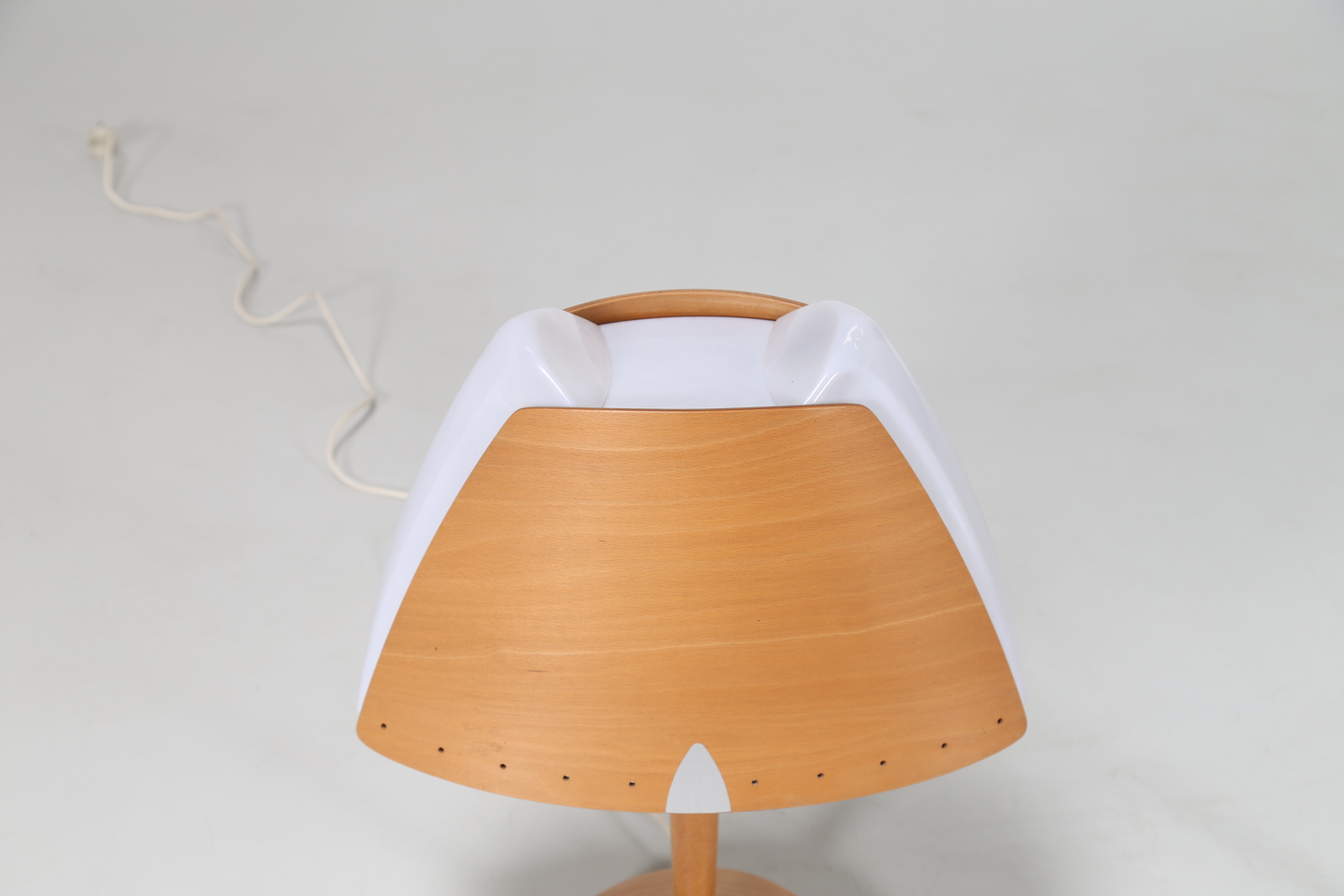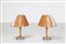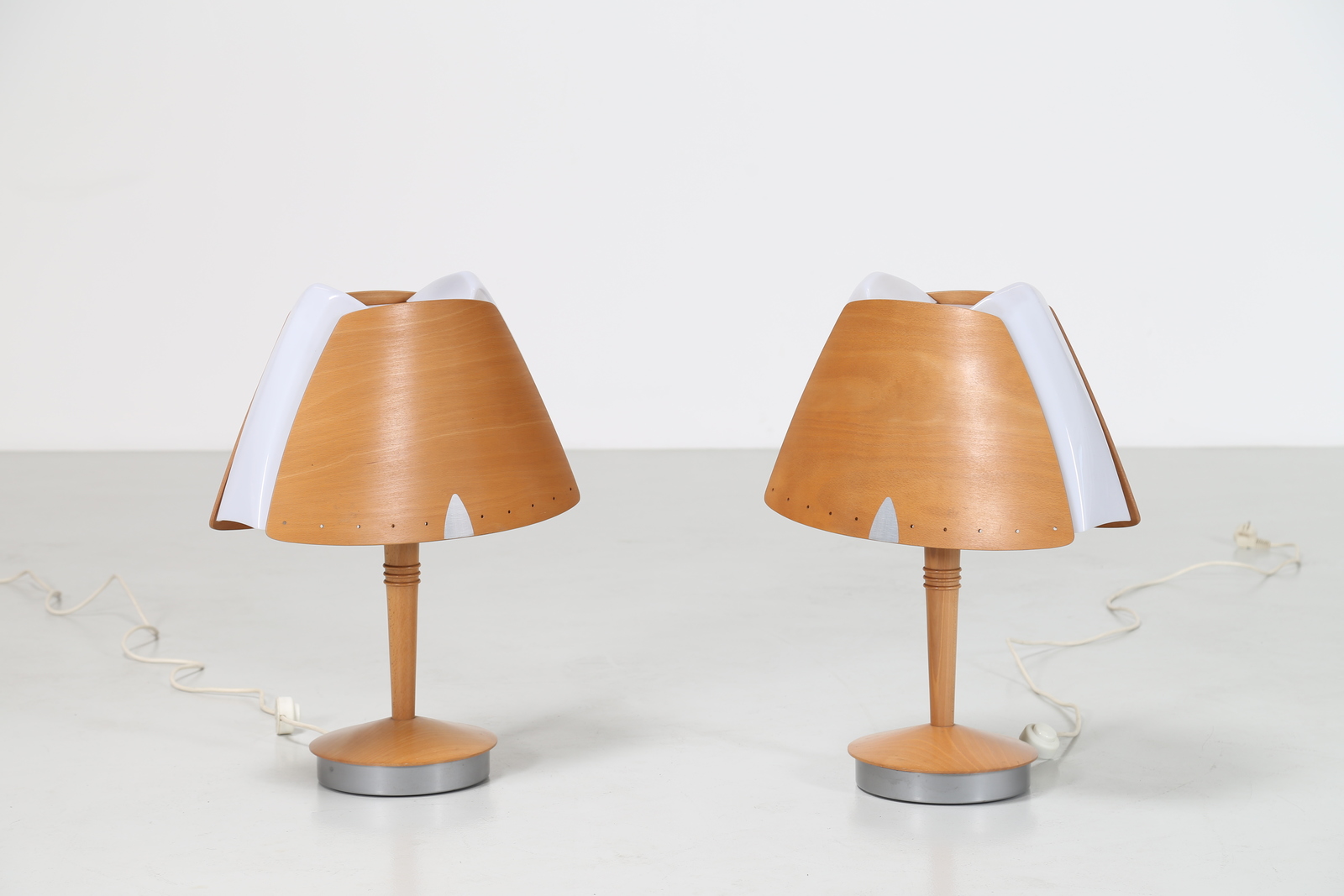 - Pair of curved wood, metal and plexiglass table lamps, designed for the Barcelona Hilton hotel 1970.