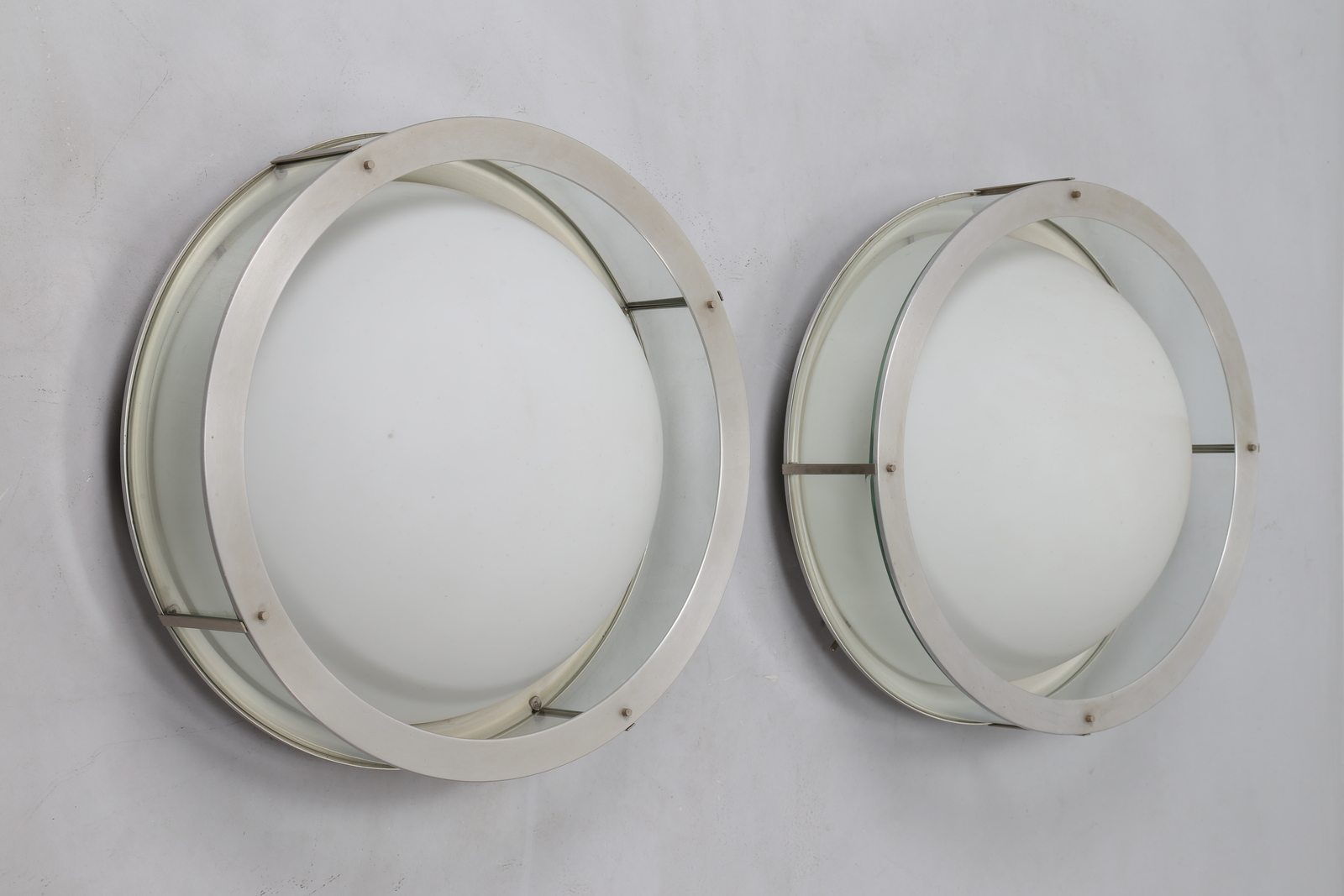 PIA GUIDETTI Pair of satinized aluminum appliques, polished glass, for Lumi, 60’s. There is the label.