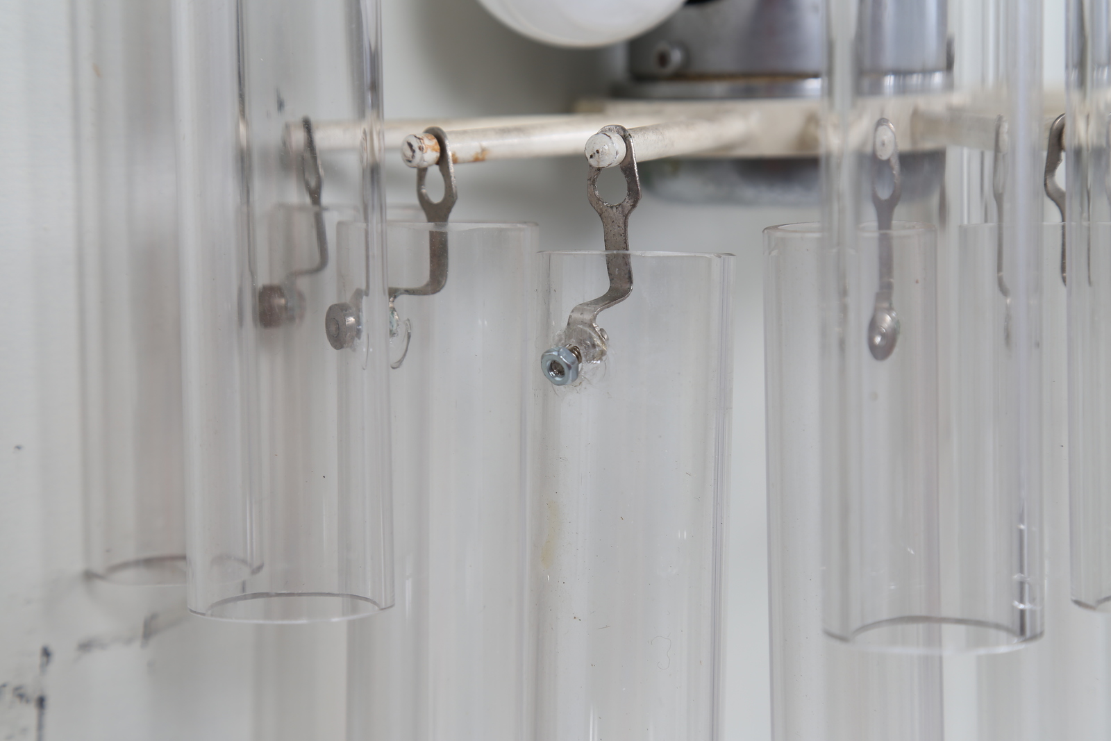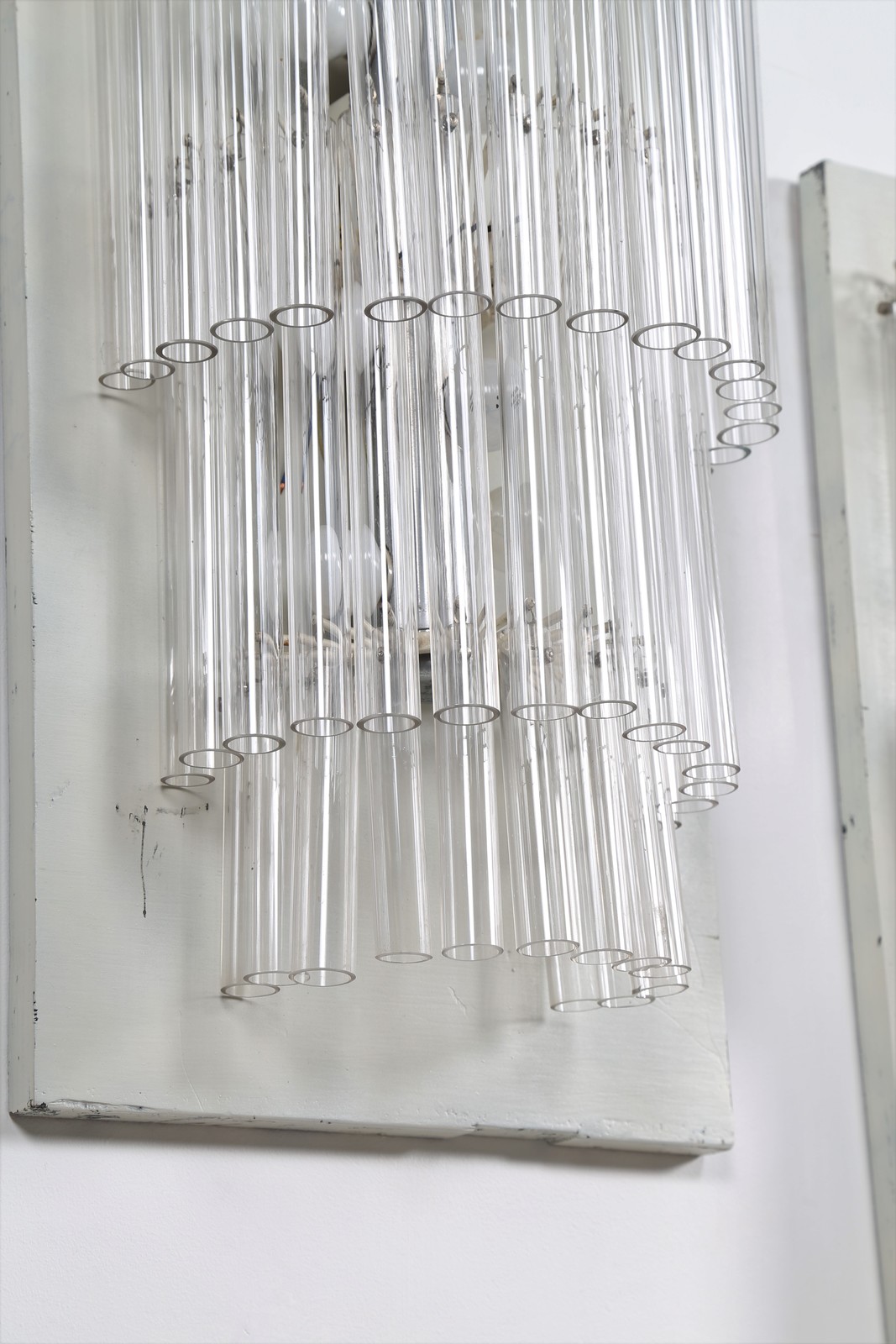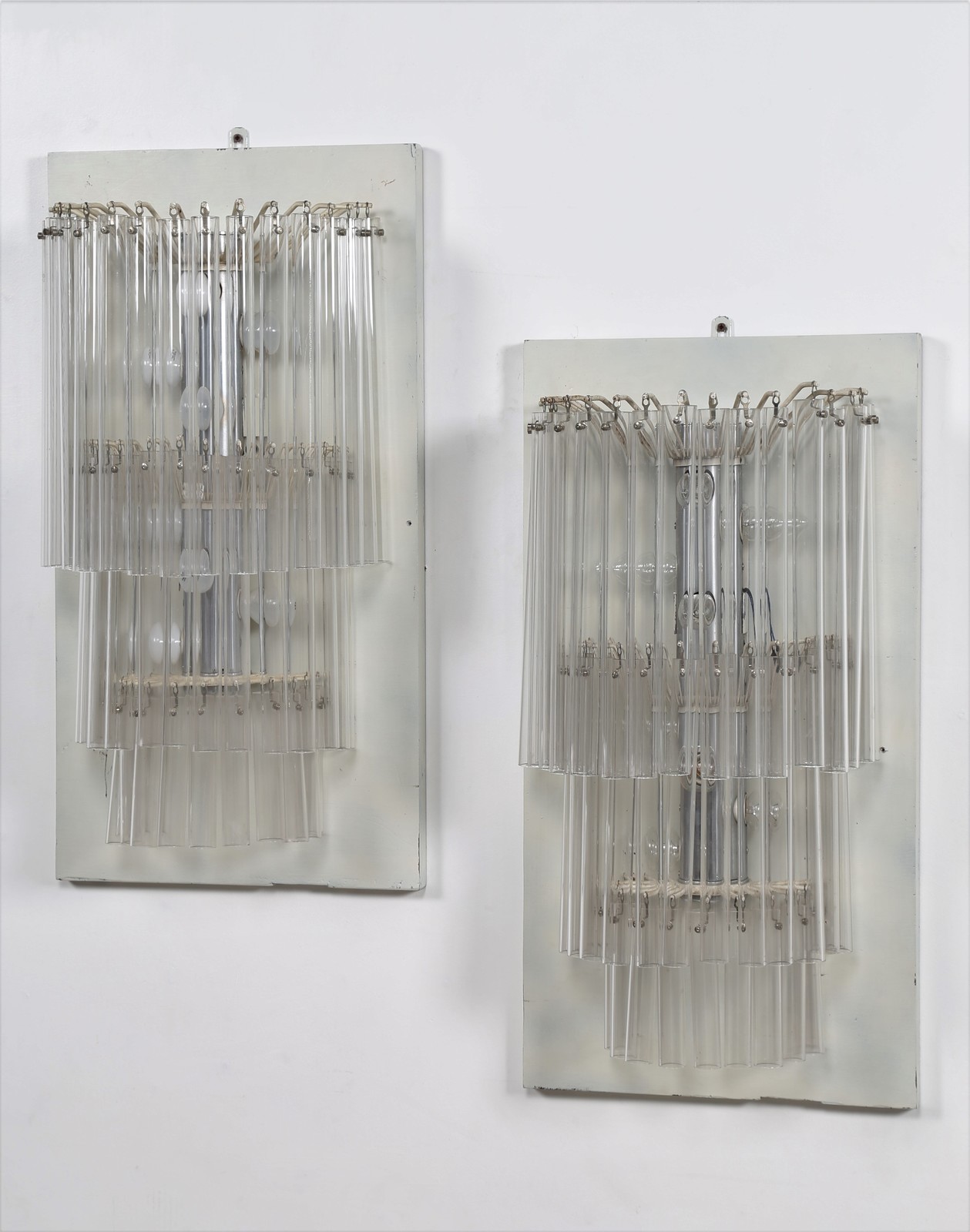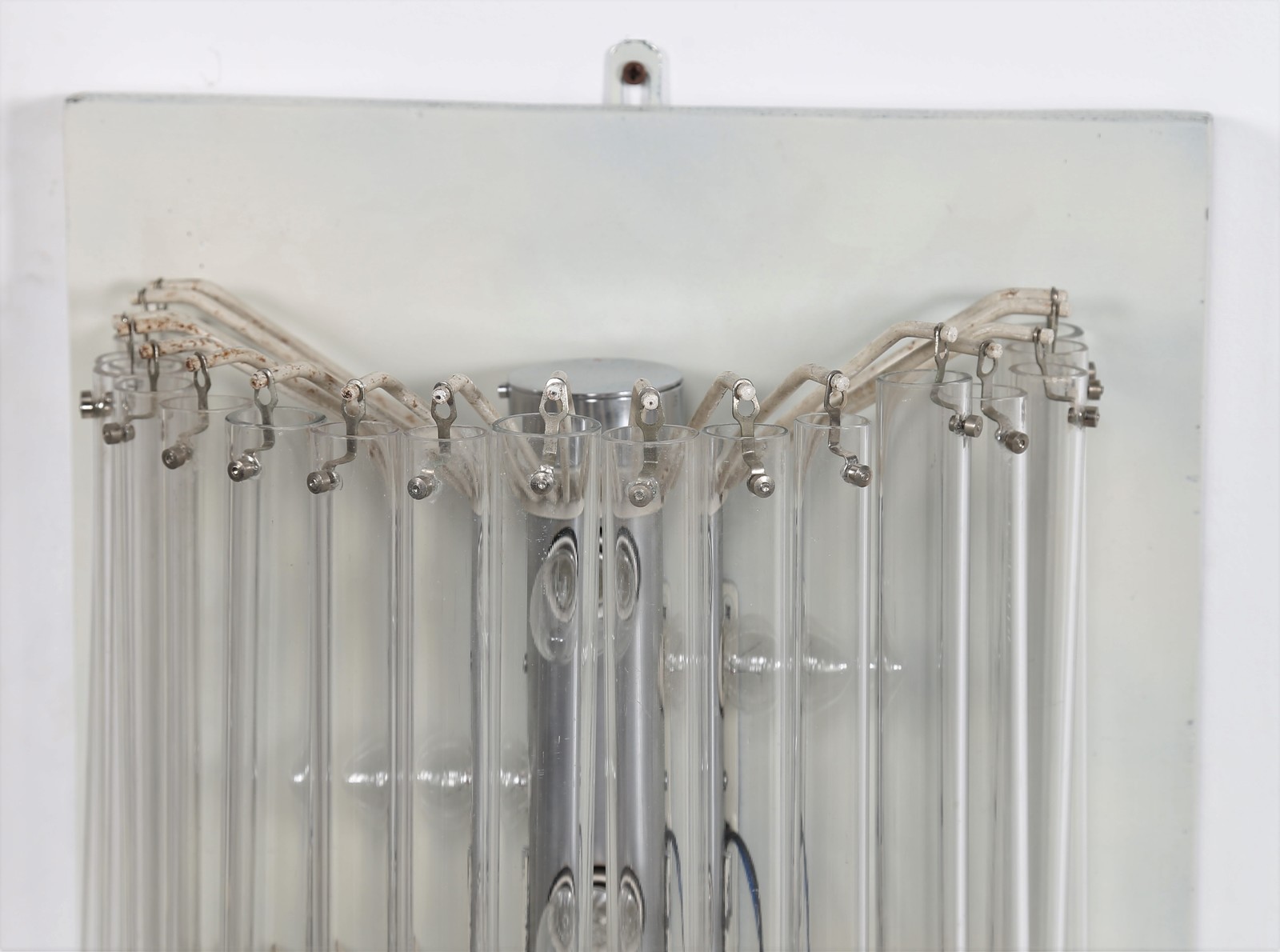 VENINI Coppia di applique in metallo e vetro tubolare, anni 60. -. Cm 34,00 x 80,00 x 22,00. Presente piccola fellatura a quattro vetri,