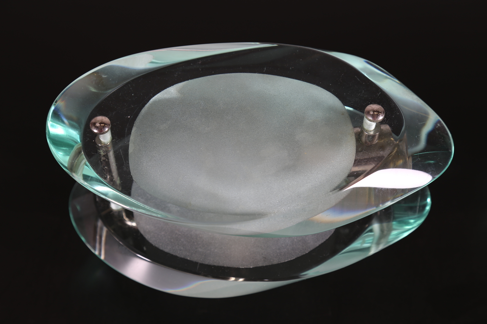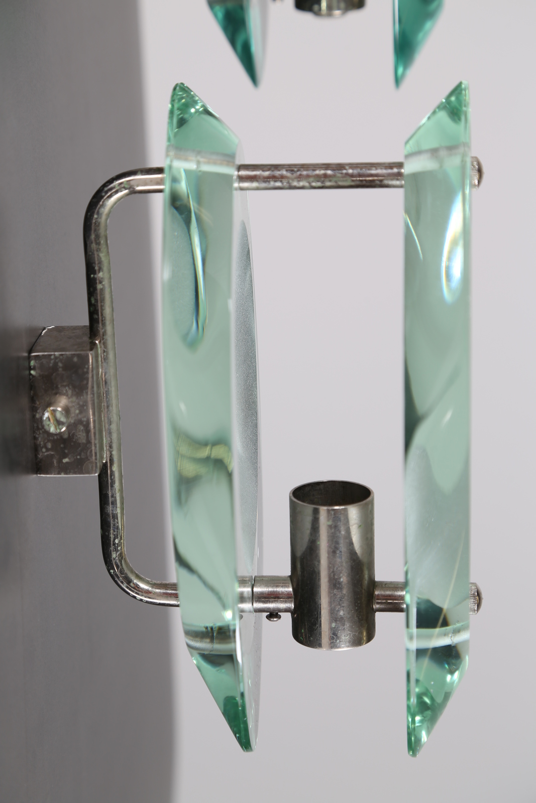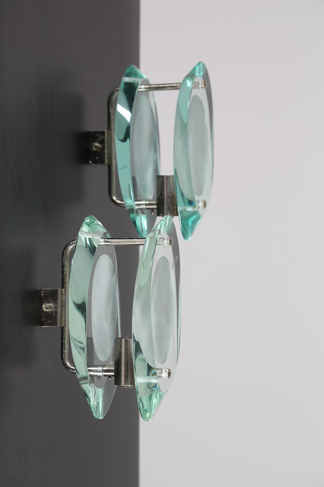 INGRAND MAX (1908 - 1969) Pair of nickel-plated brass appliques with two moulded, polished and internally satinized crystals, mod. 2093, for Fontana Arte, 50’s. Literature; Fontana Arte original catalog. . . Cm 12,00 x 21,50 x 16,00.