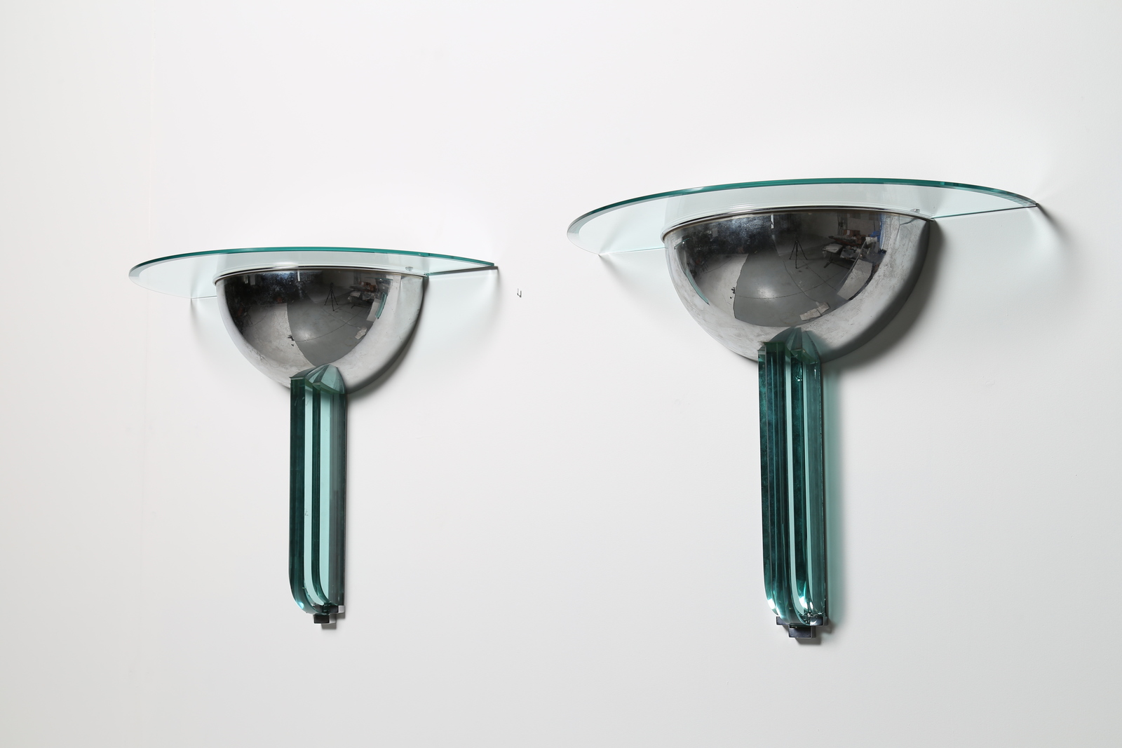 FONTANA ARTE Coppia di lampade da parete in metallo cromato e cristallo molato, anni 50. . Cm 70,00 x 65,00 x 39,00.