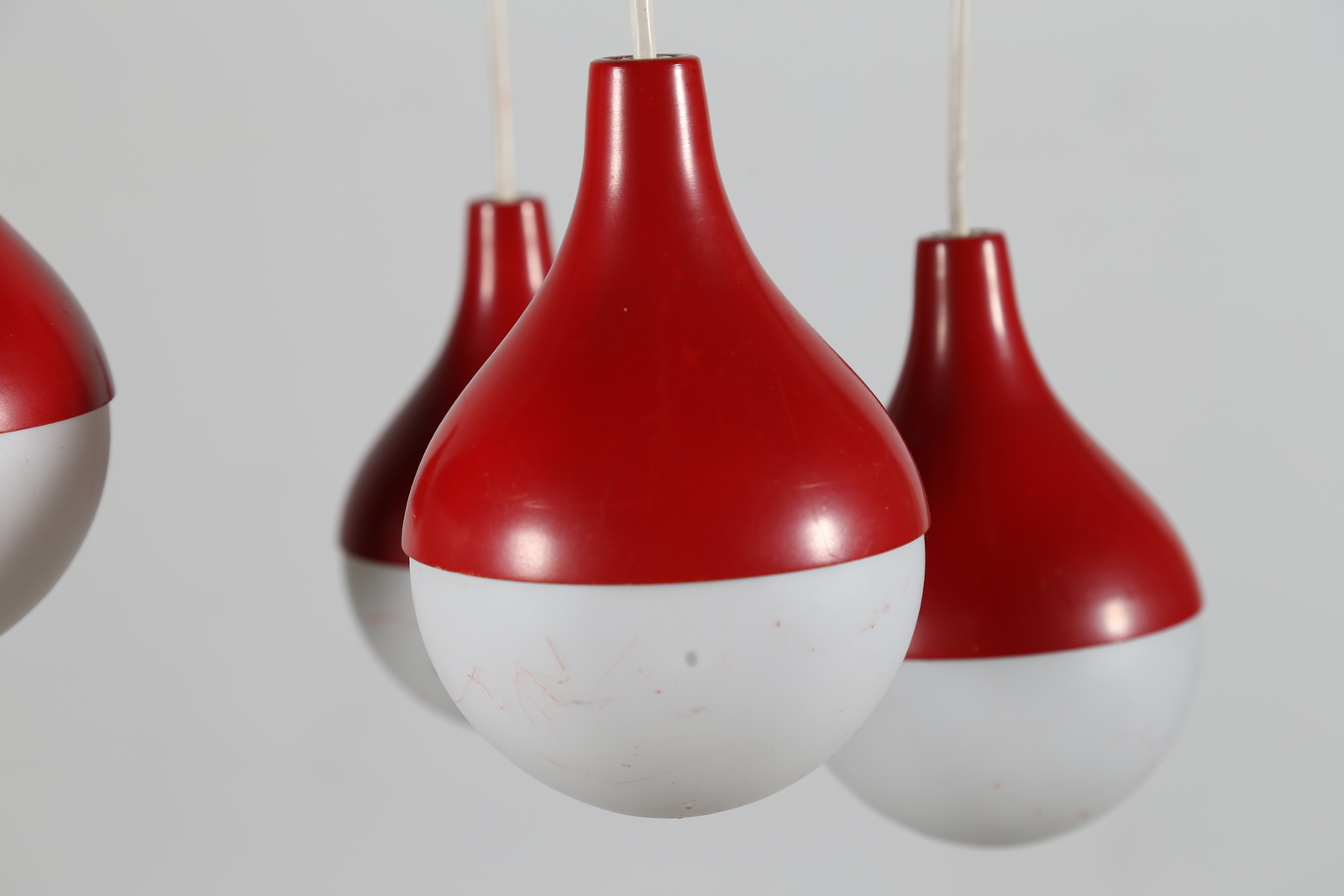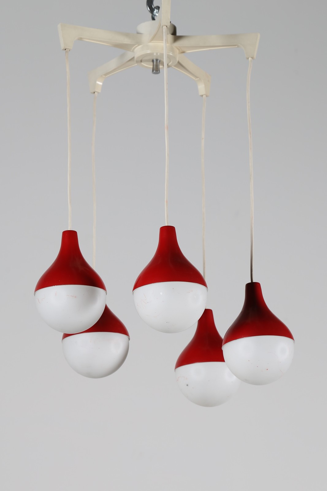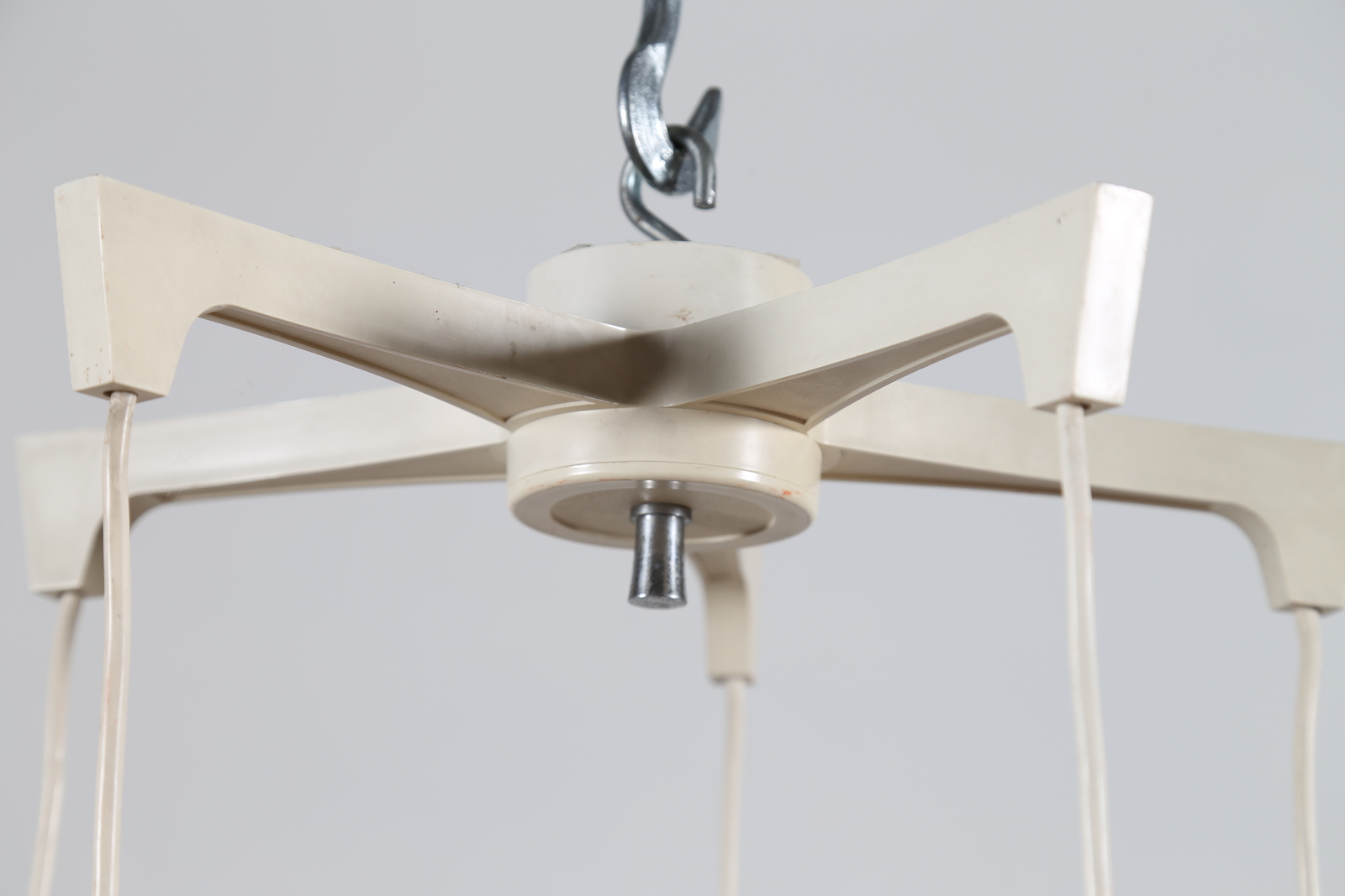 STILNOVO Lampadario in alluminio laccato, vetro opalino e plastica, anni 60. -. Cm 45,00 x 65,00 x 45,00.