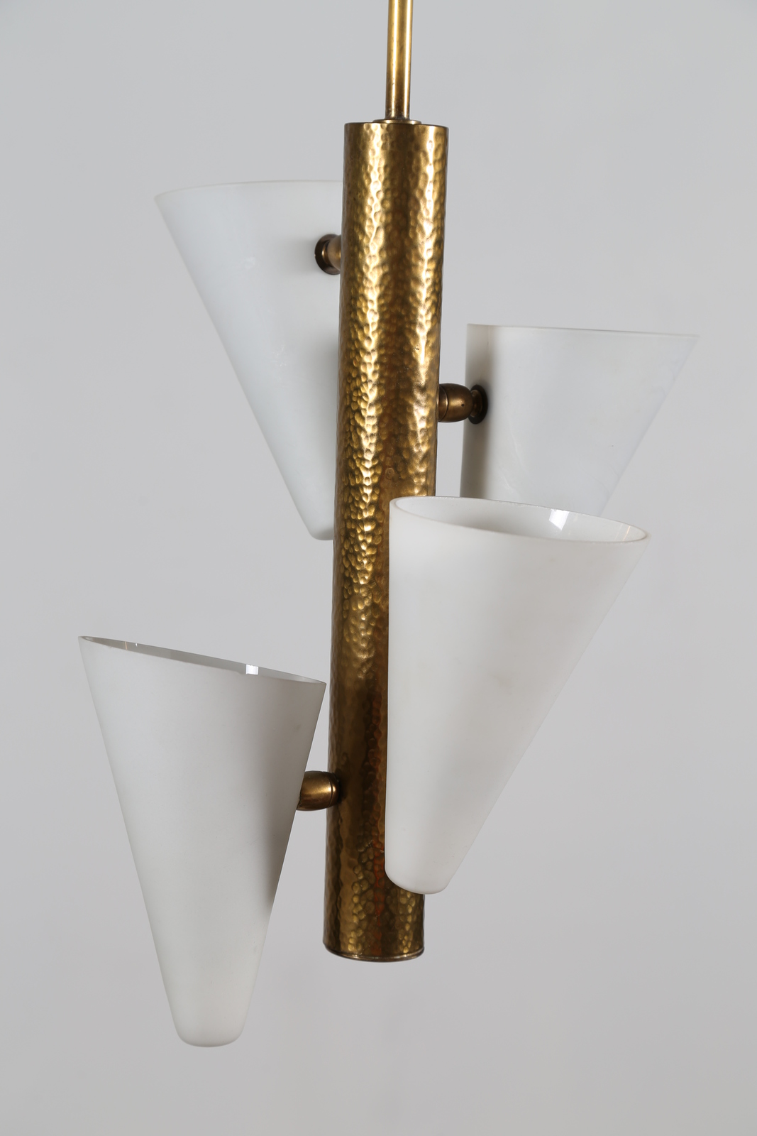 MANIFATTURA ITALIANA Lampadario in ottone martellato e vetro opalino, anni 50.