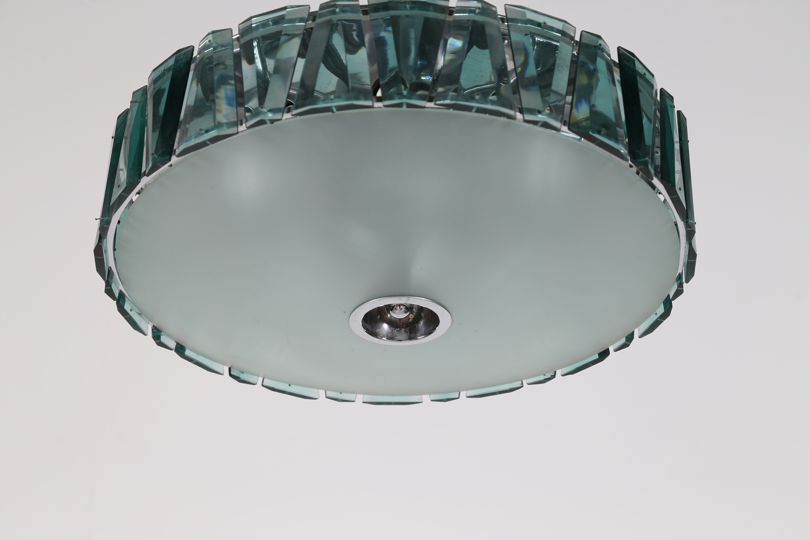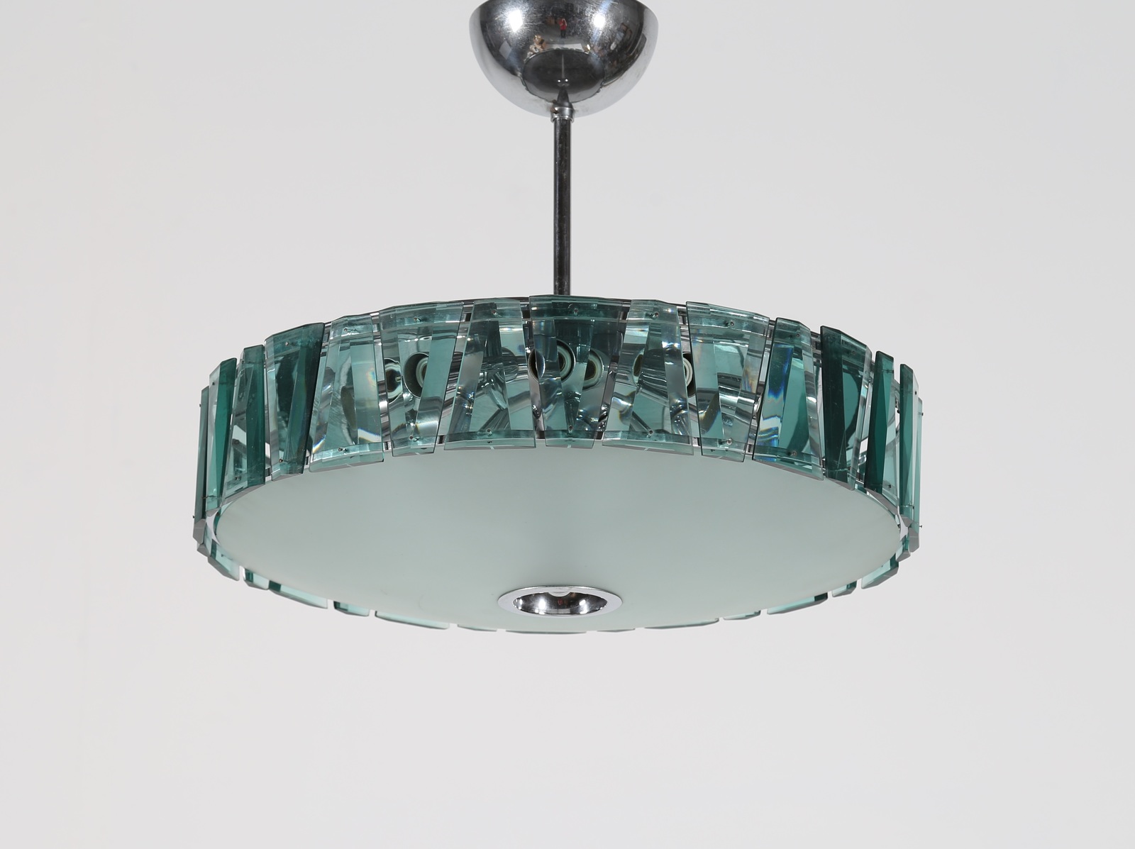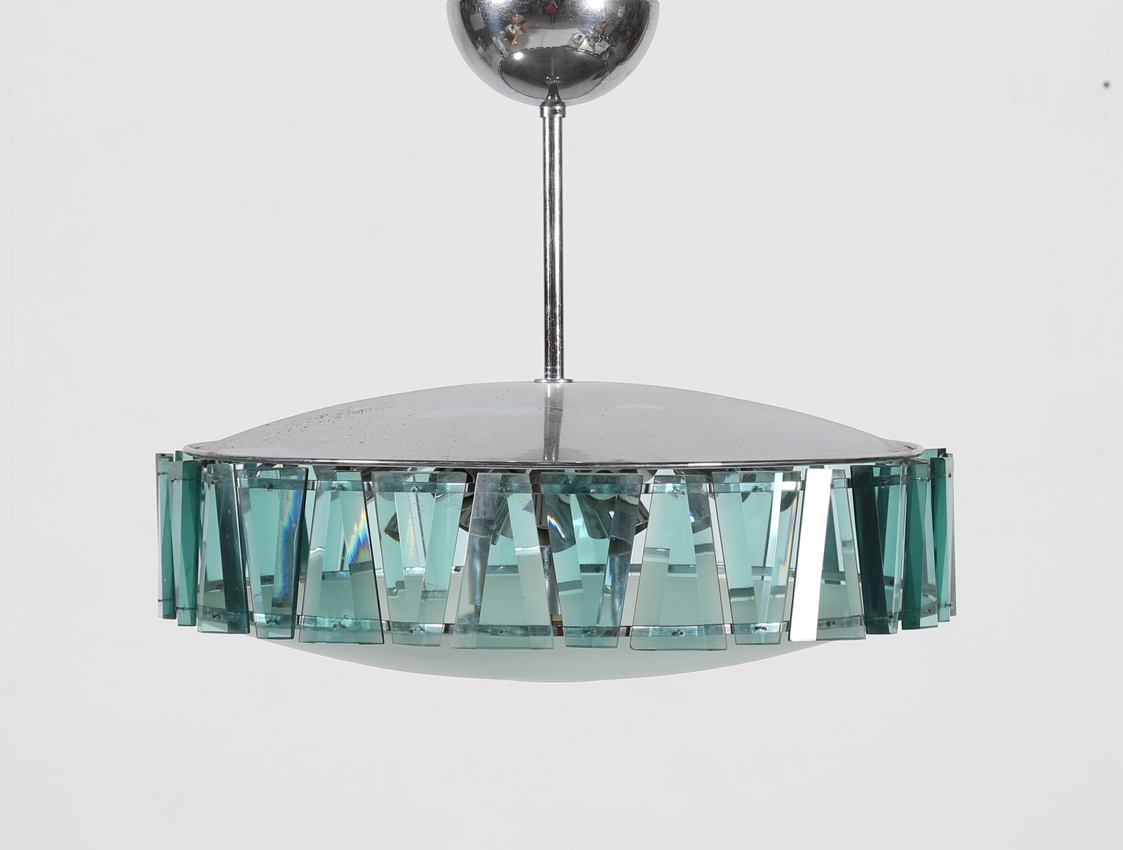 STILNOVO Chromed metal and polished crystals suspension lamp, 60’s.