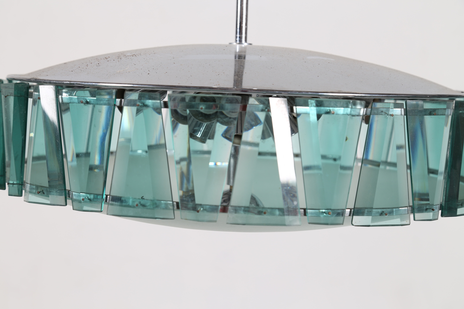 STILNOVO Lampada a sospensione in metallo cromato e cristalli molati, anni 60. . Cm 50,00 x 40,00 x 50,00.