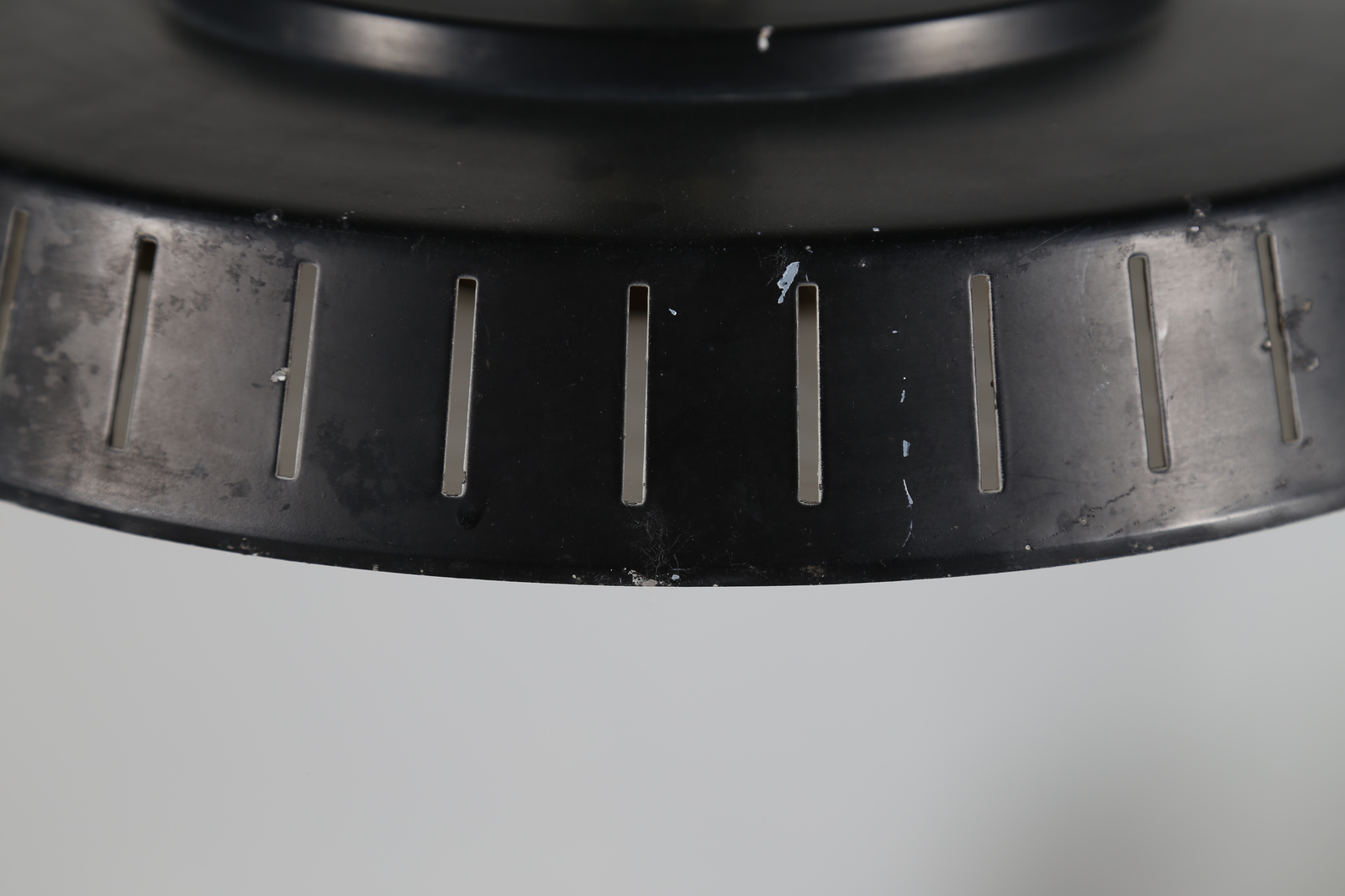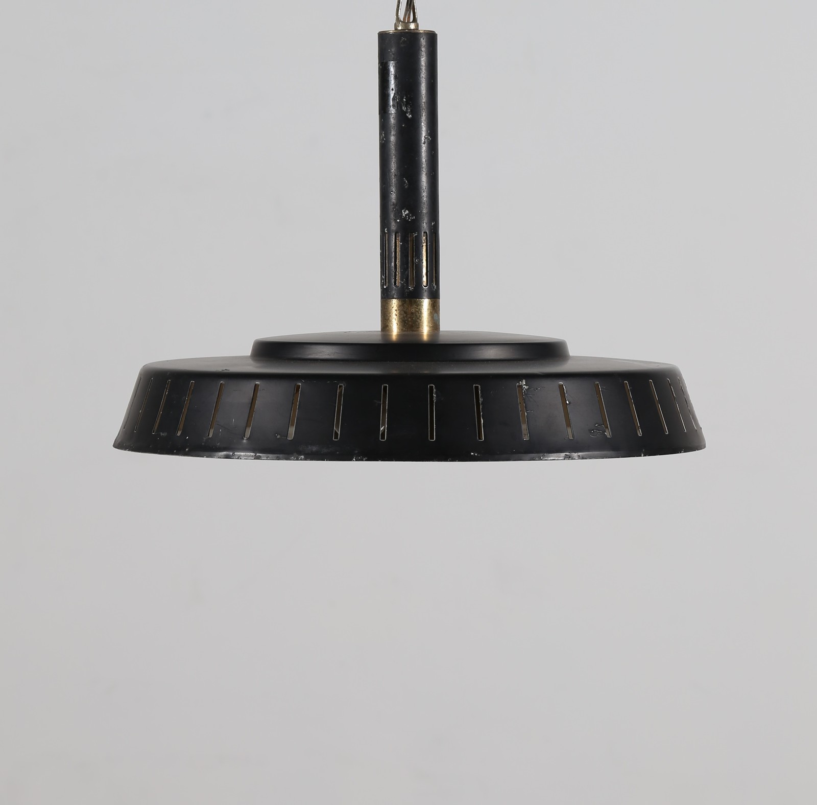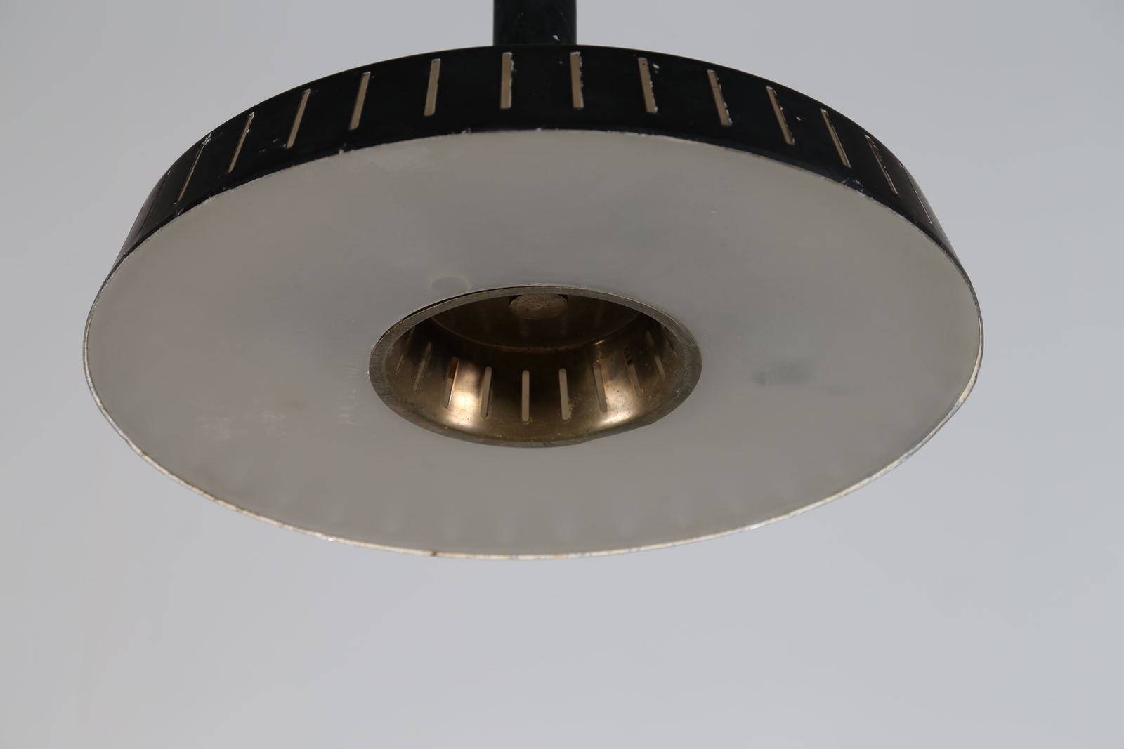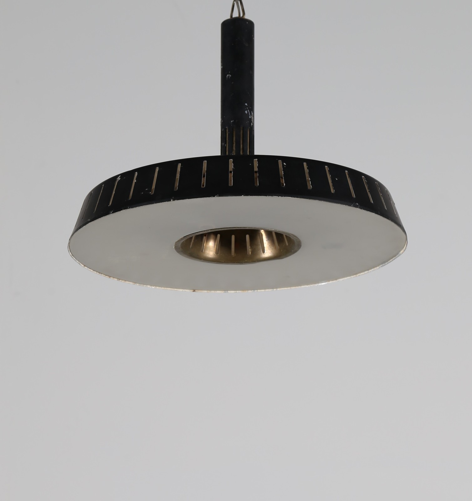 STILNOVO Lacquered metal, brass and glass suspension lamp, 50’s.