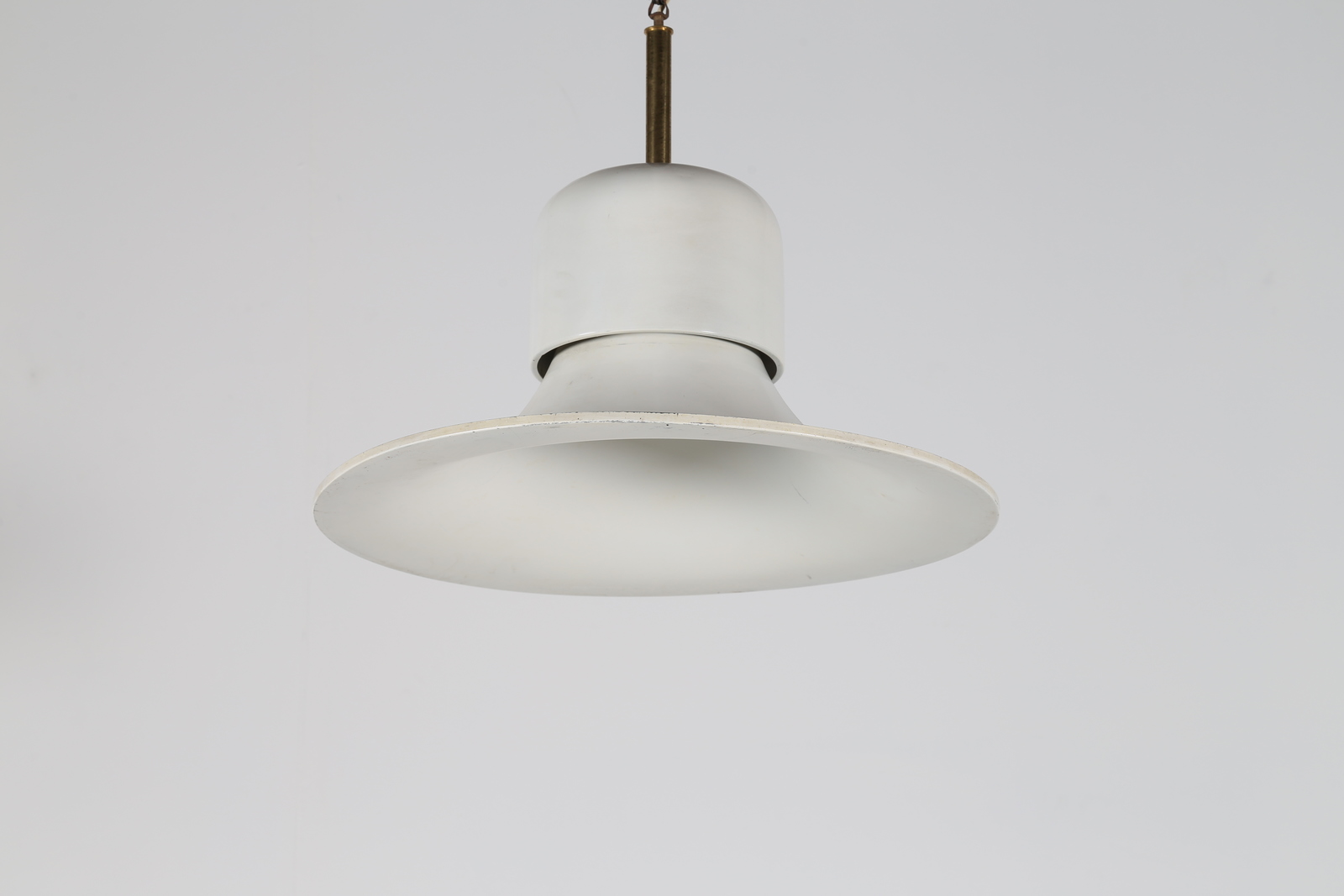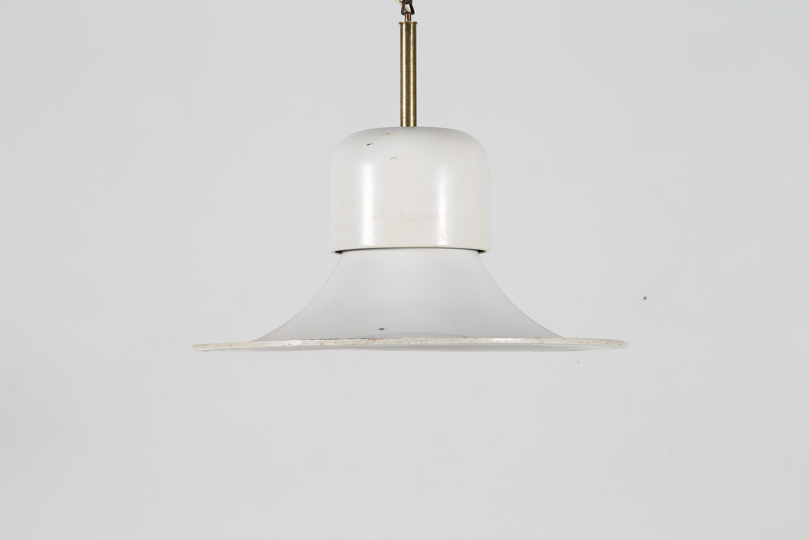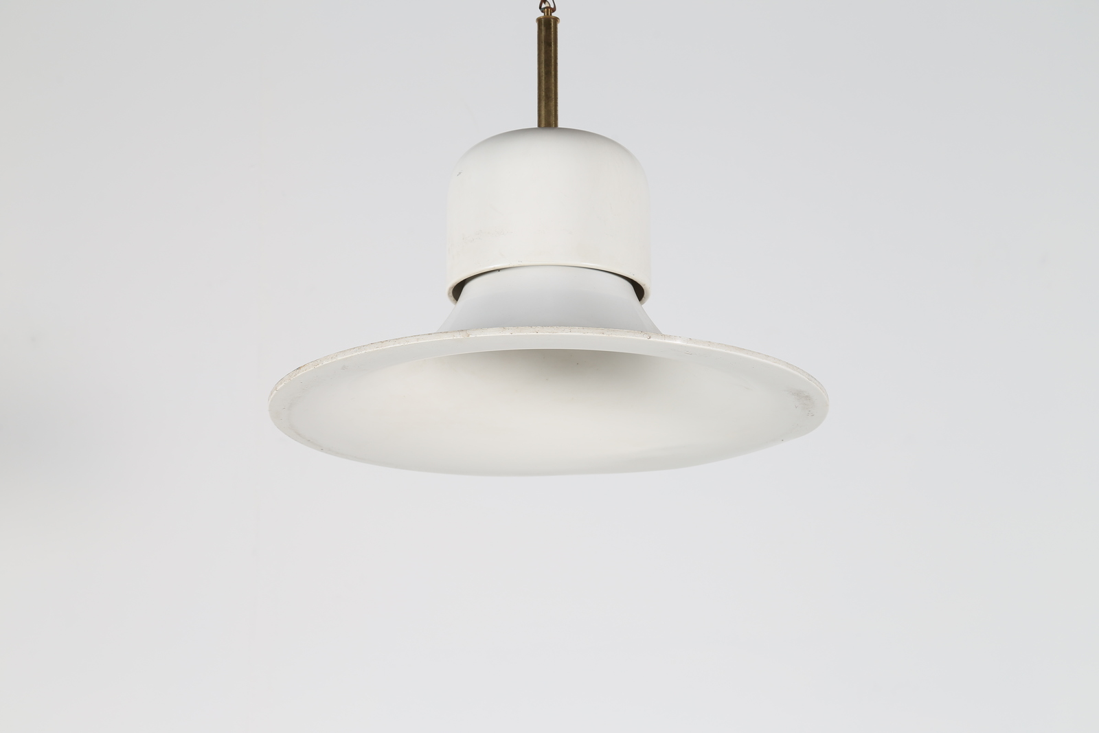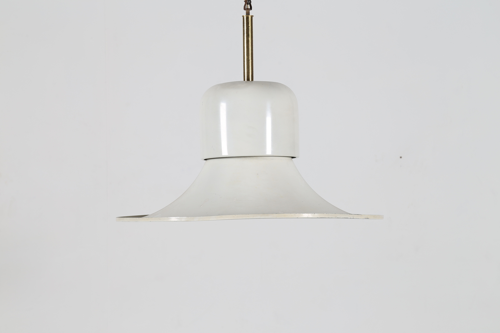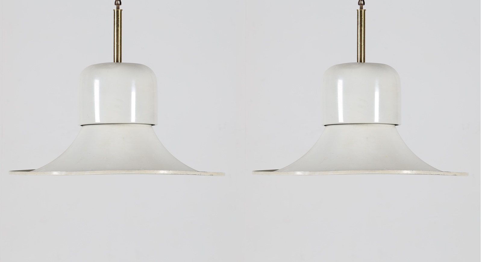 STILNOVO Pair of painted aluminum and brass suspension lamps, 60’s. There is the brand.