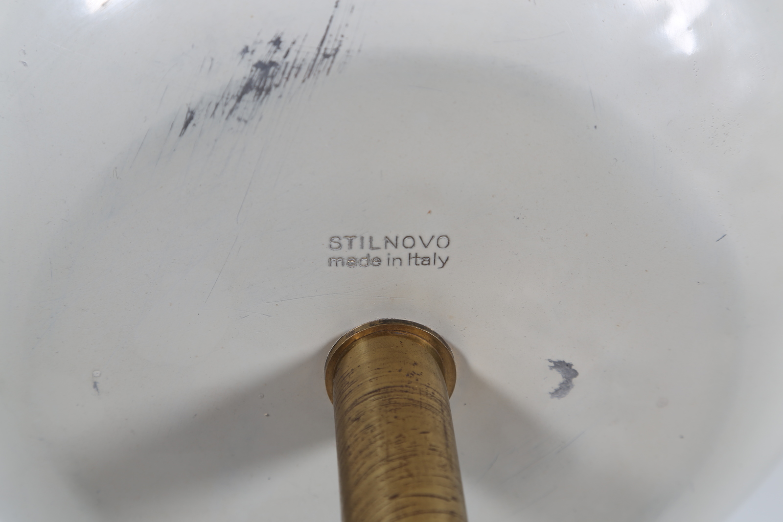 STILNOVO Coppia di lampade a sospensione in alluminio verniciato e ottone, anni 60. Marchio presente,. -. Cm 65,00 x 55,00 x 65,00.