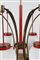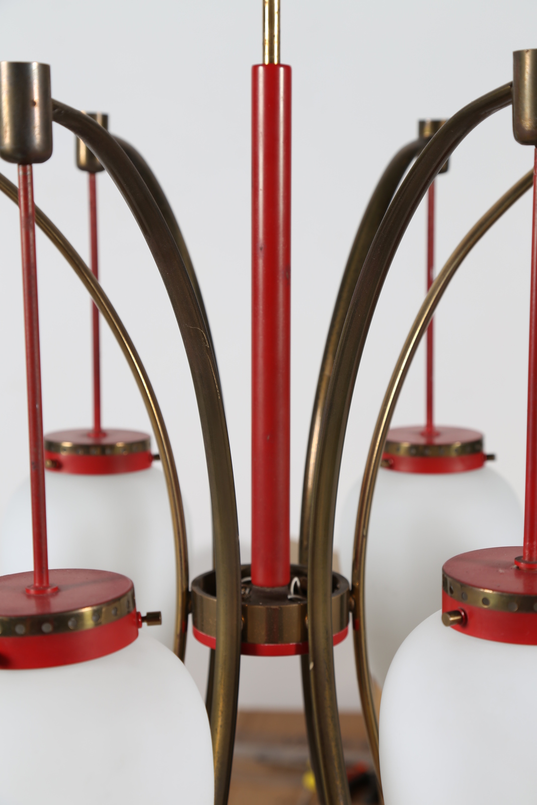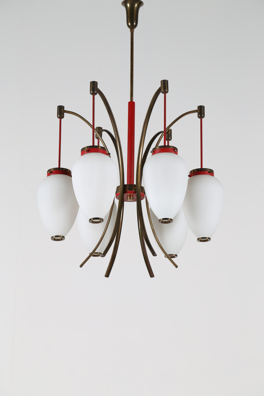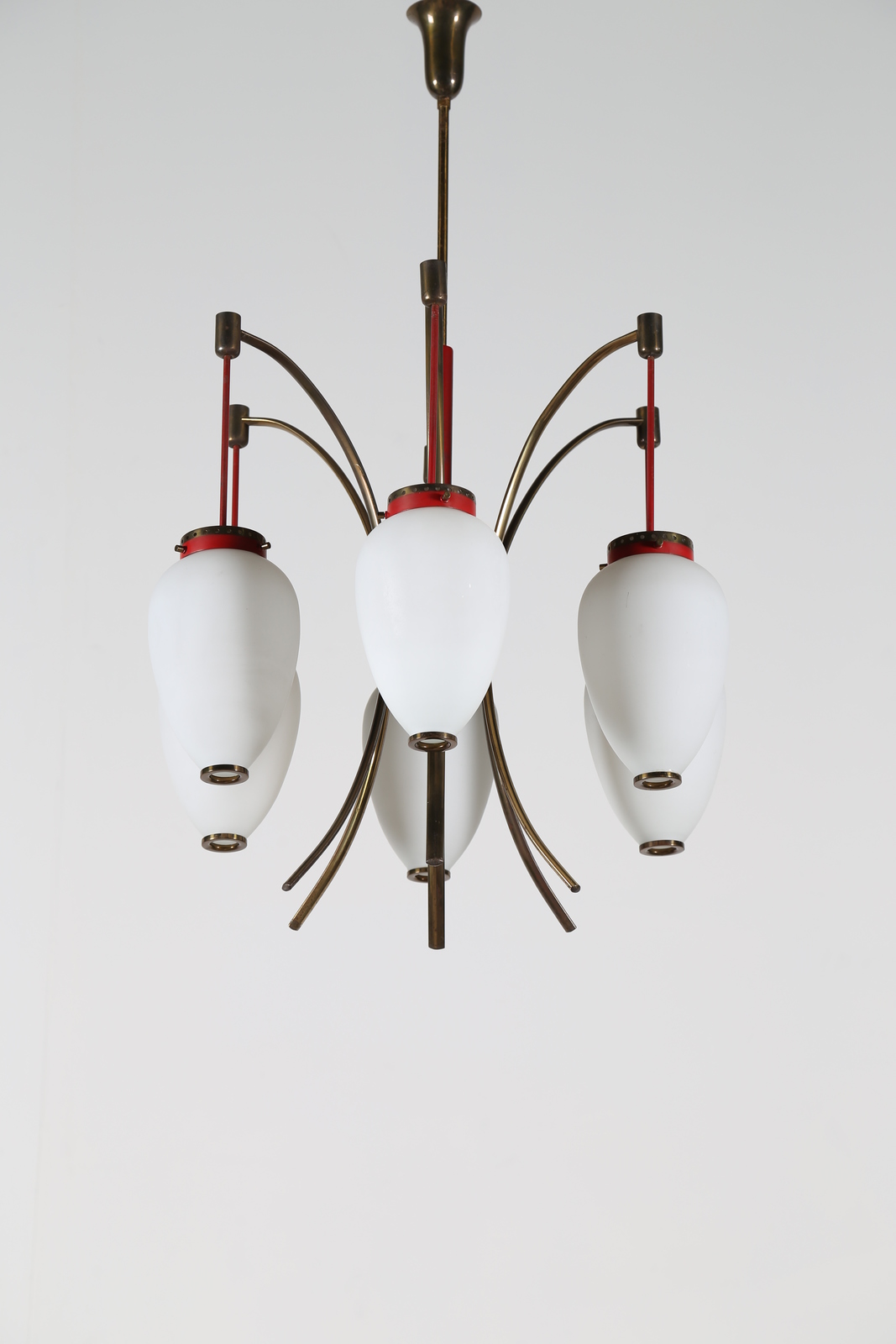 STILNOVO Lacquered metal, brass and glass chandelier, 50’s.