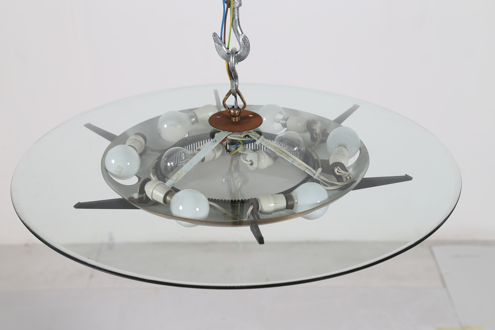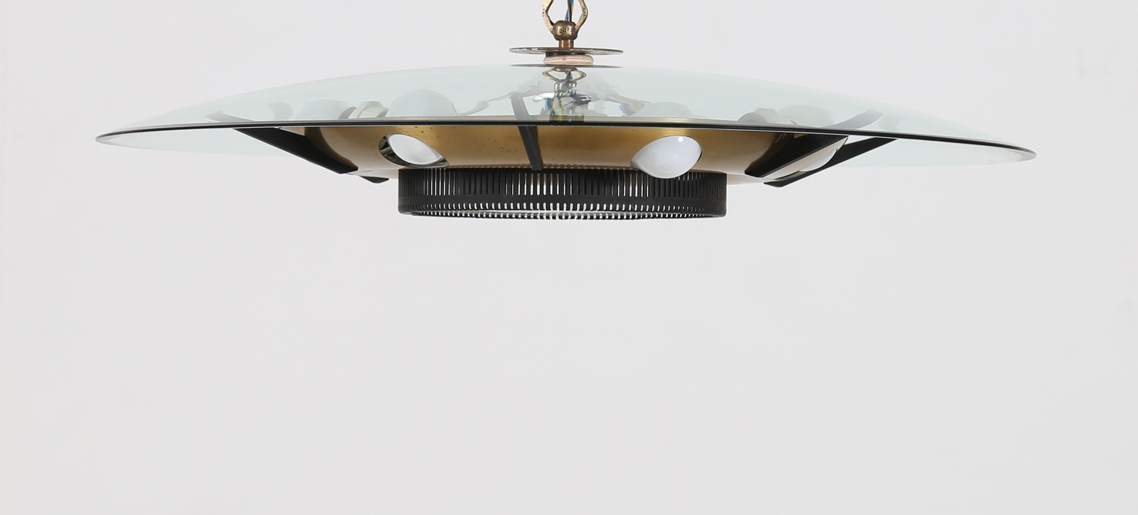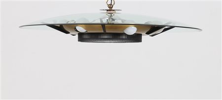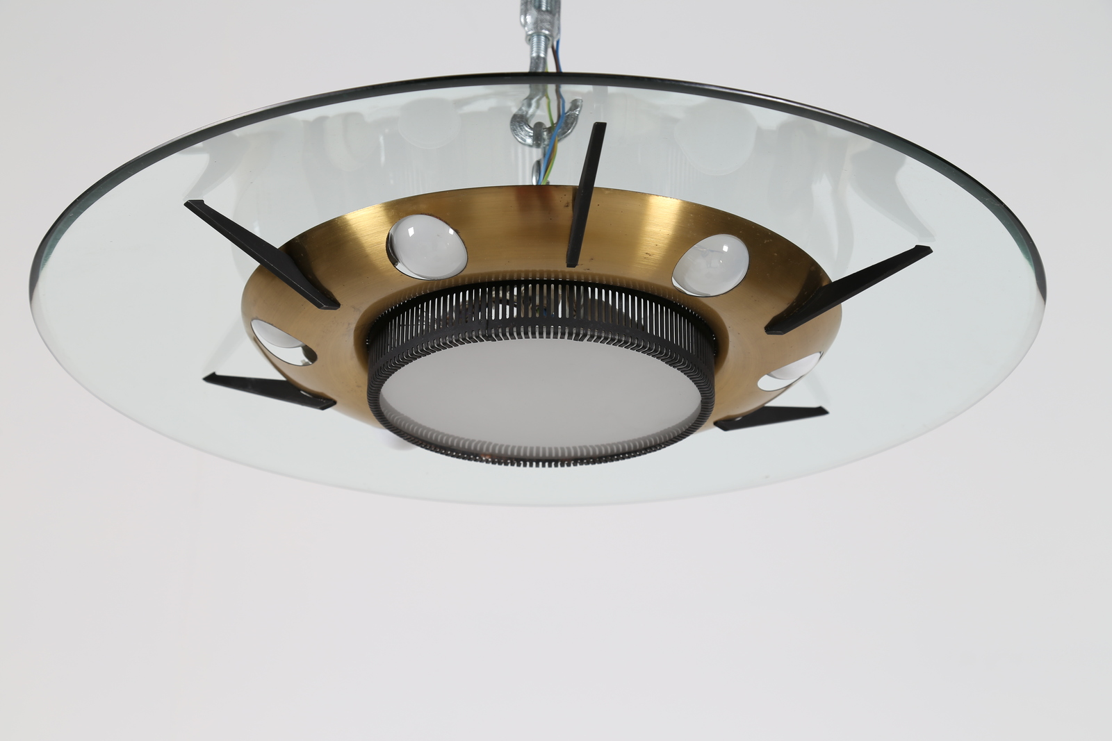 STILNOVO Lacquered metal, brass, plastic and glass suspension lamp, 50’s.