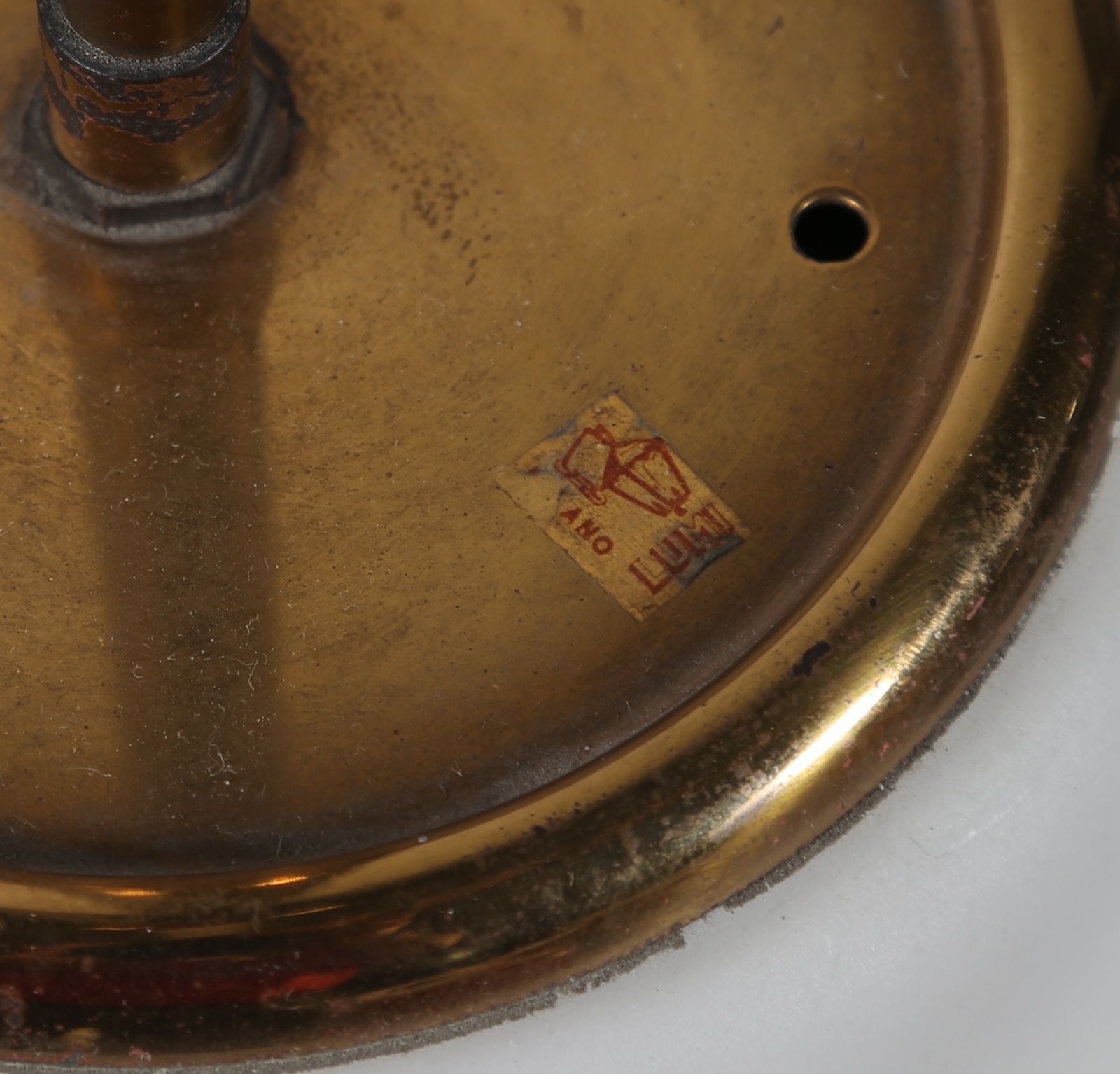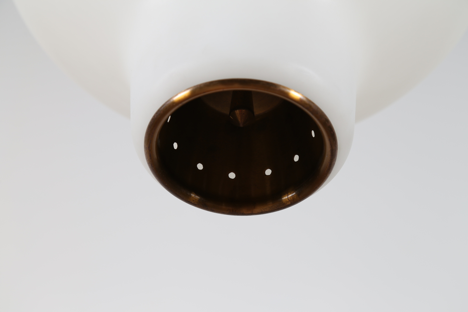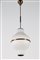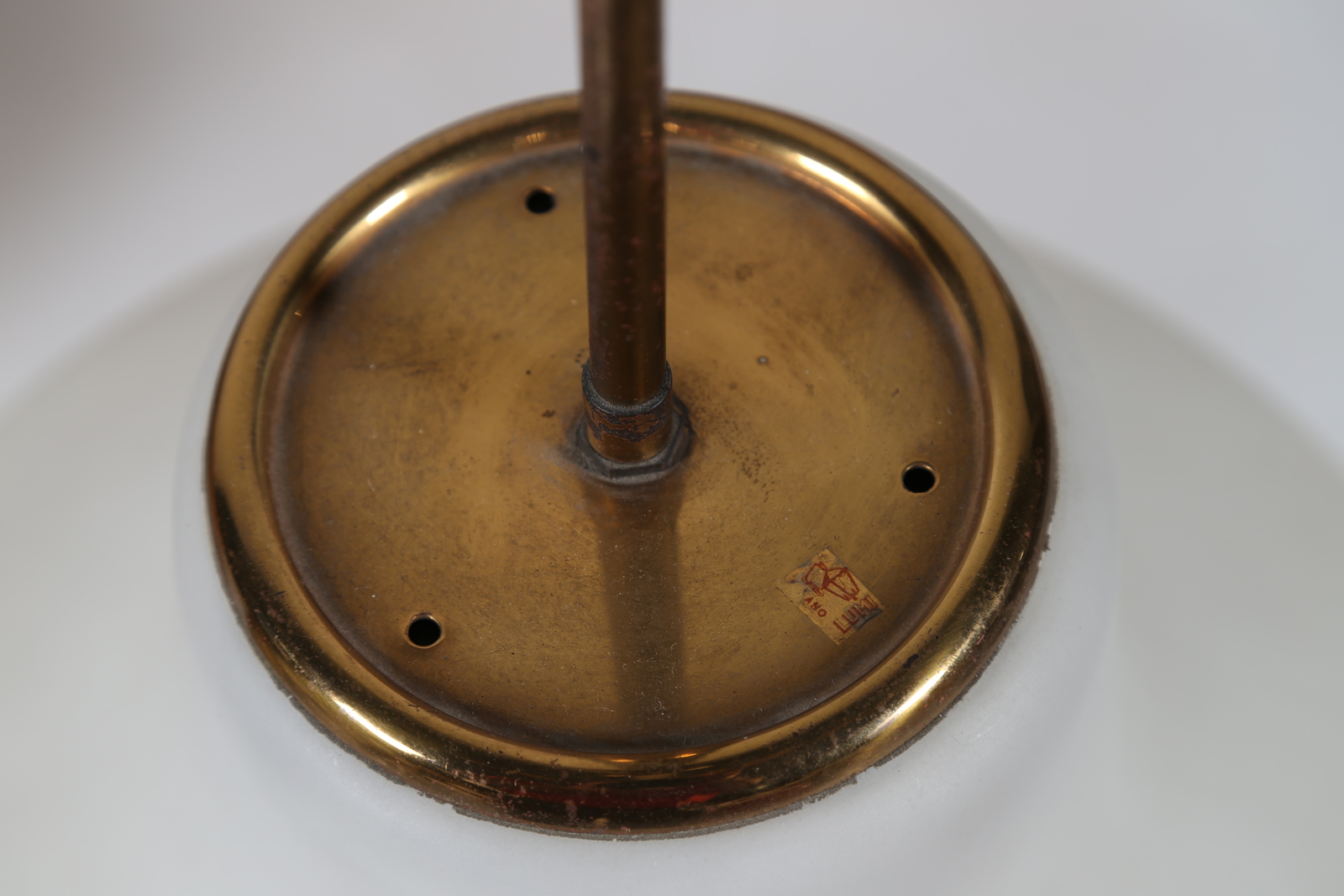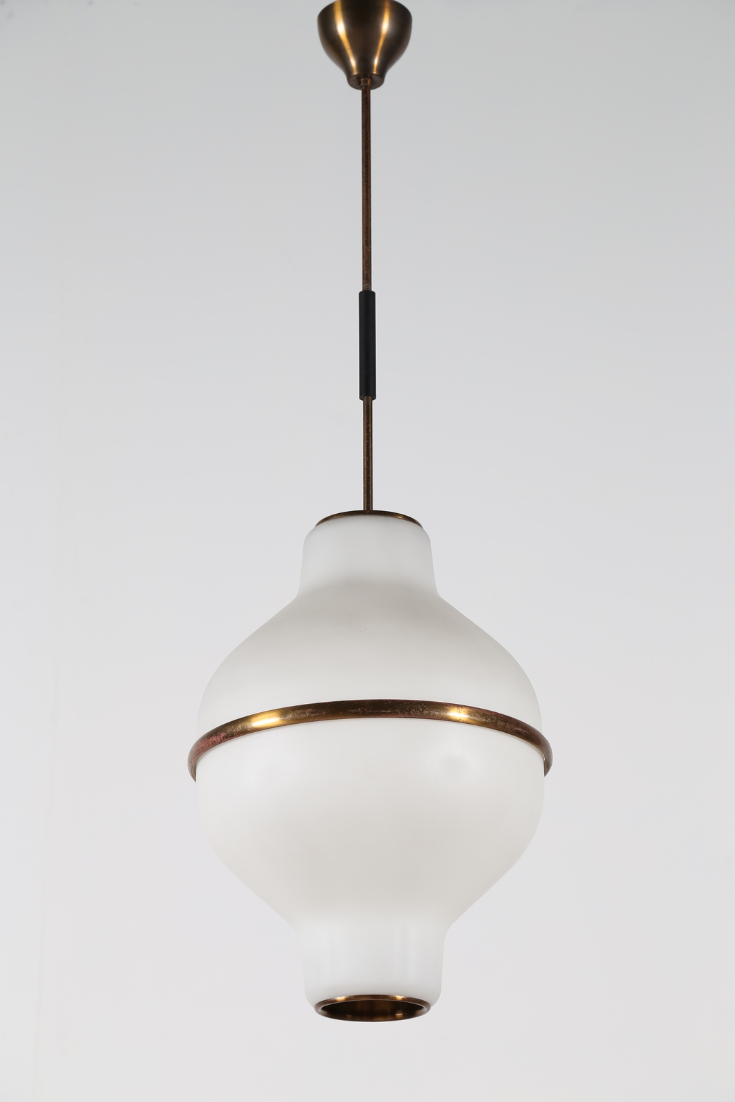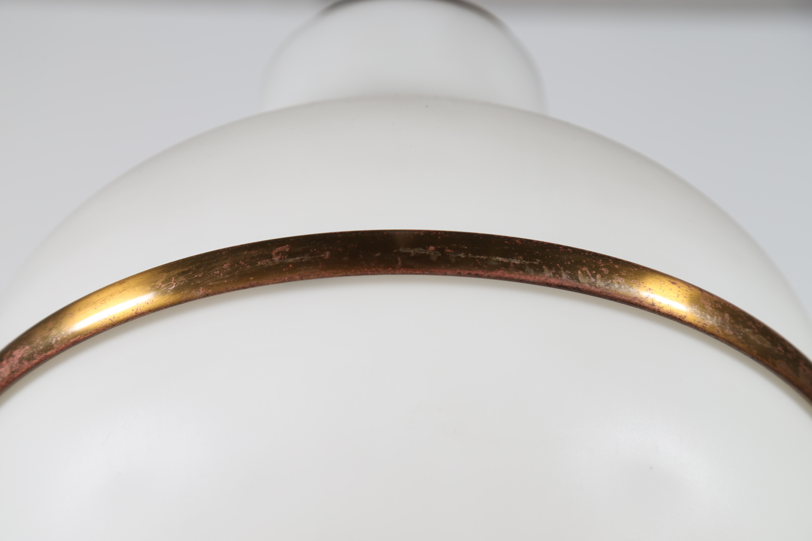 TORLASCO OSCAR Lampada a sospensione in metallo laccato ottone e vetro opalino, per Lumi anni 50. Etichetta originale presente. -. Cm 38,00 x 108,00 x 38,00.