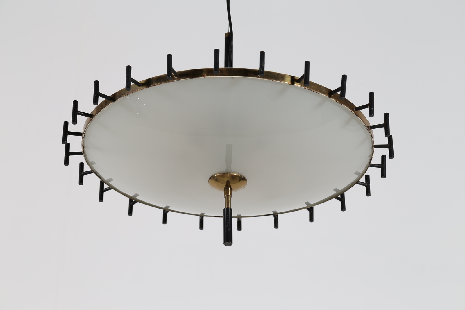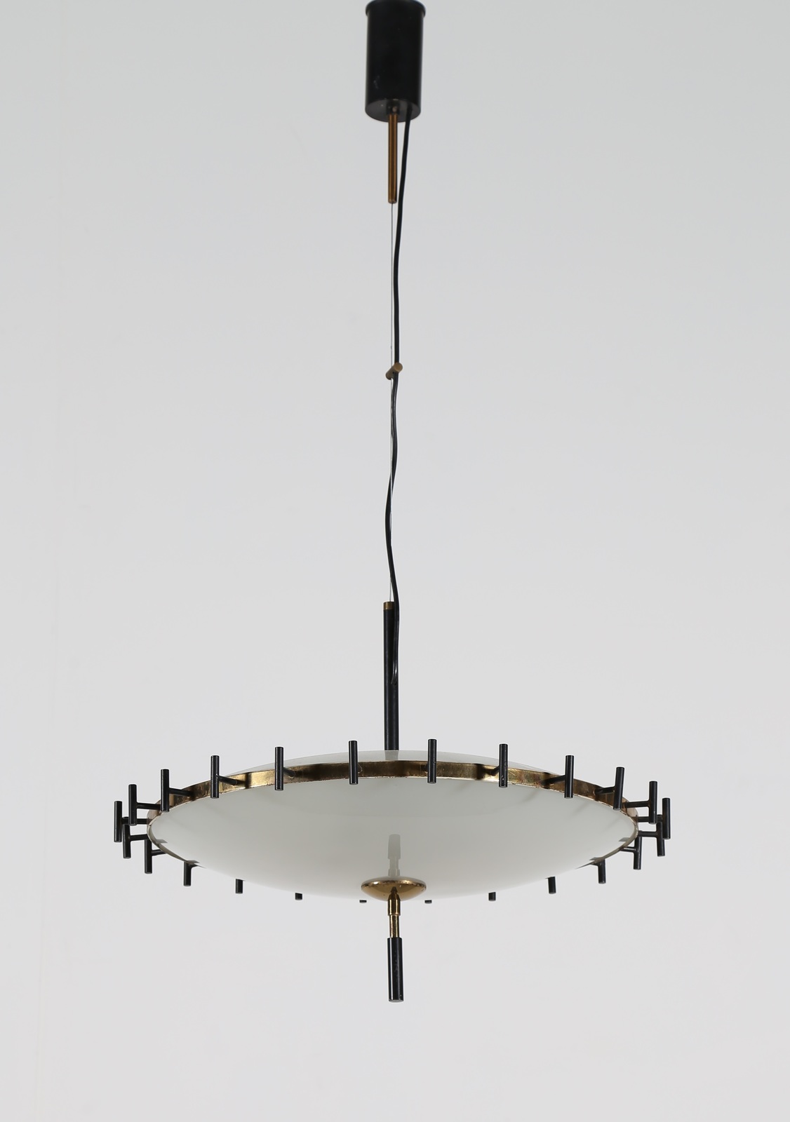 ARREDOLUCE Attrib. Brass, lacquered metal and glass suspension lamp, 50’s.