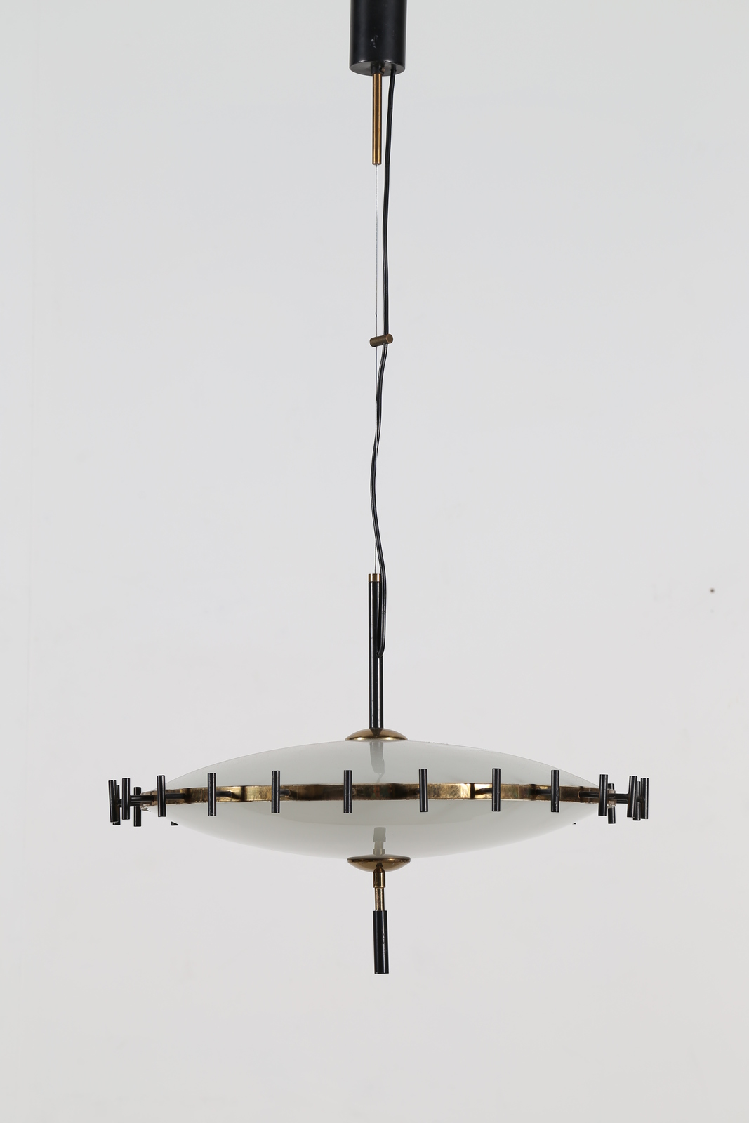 ARREDOLUCE Attrib. Lampada a sospensione in ottone metallo laccato e vetro opalino, anni 50. -. Cm 55,00 x 105,00 x 55,00.