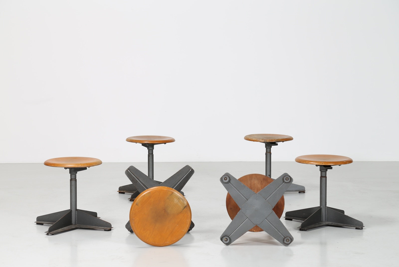 Lot 195 | MANIFATTURA ITALIANA Sei sgabelli regolabili in metallo e faggio. . -. Cm...