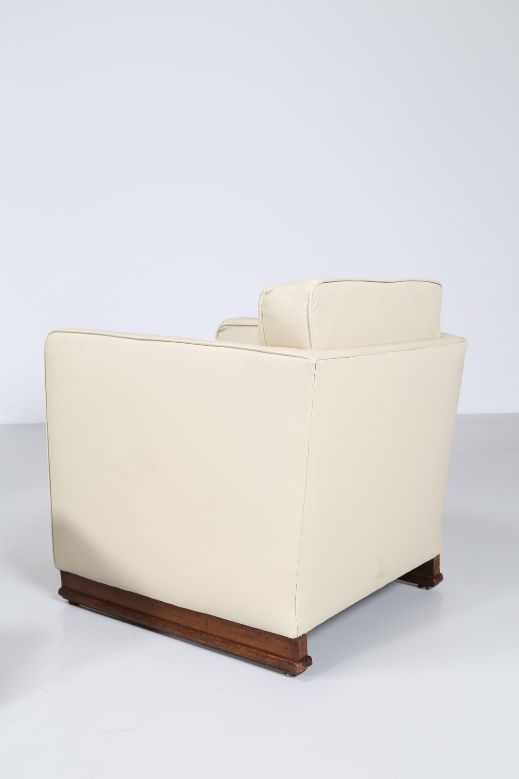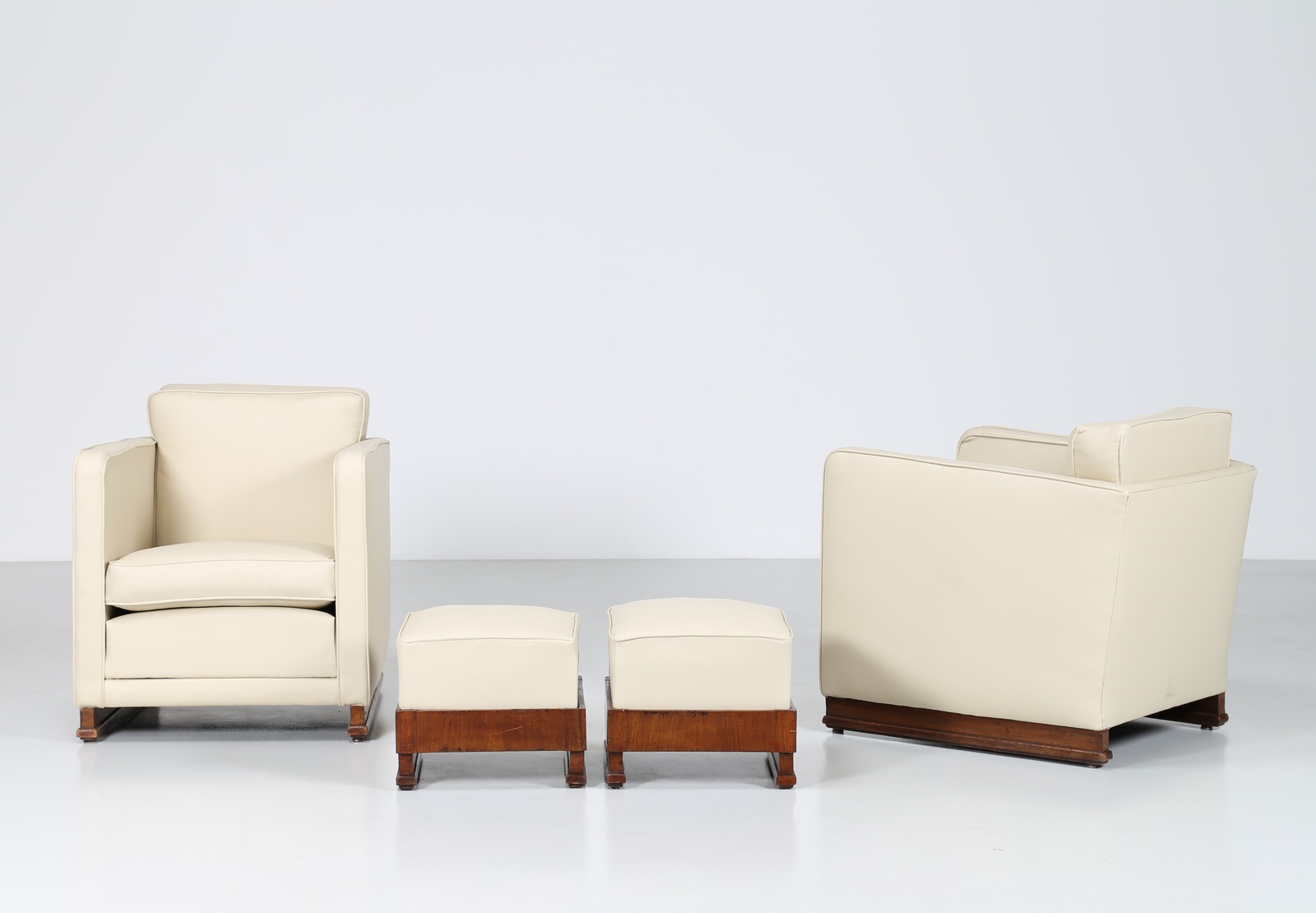 MANIFATTURA ITALIANA Coppia di poltrone con pouf in noce e sky, anni 40 . -....