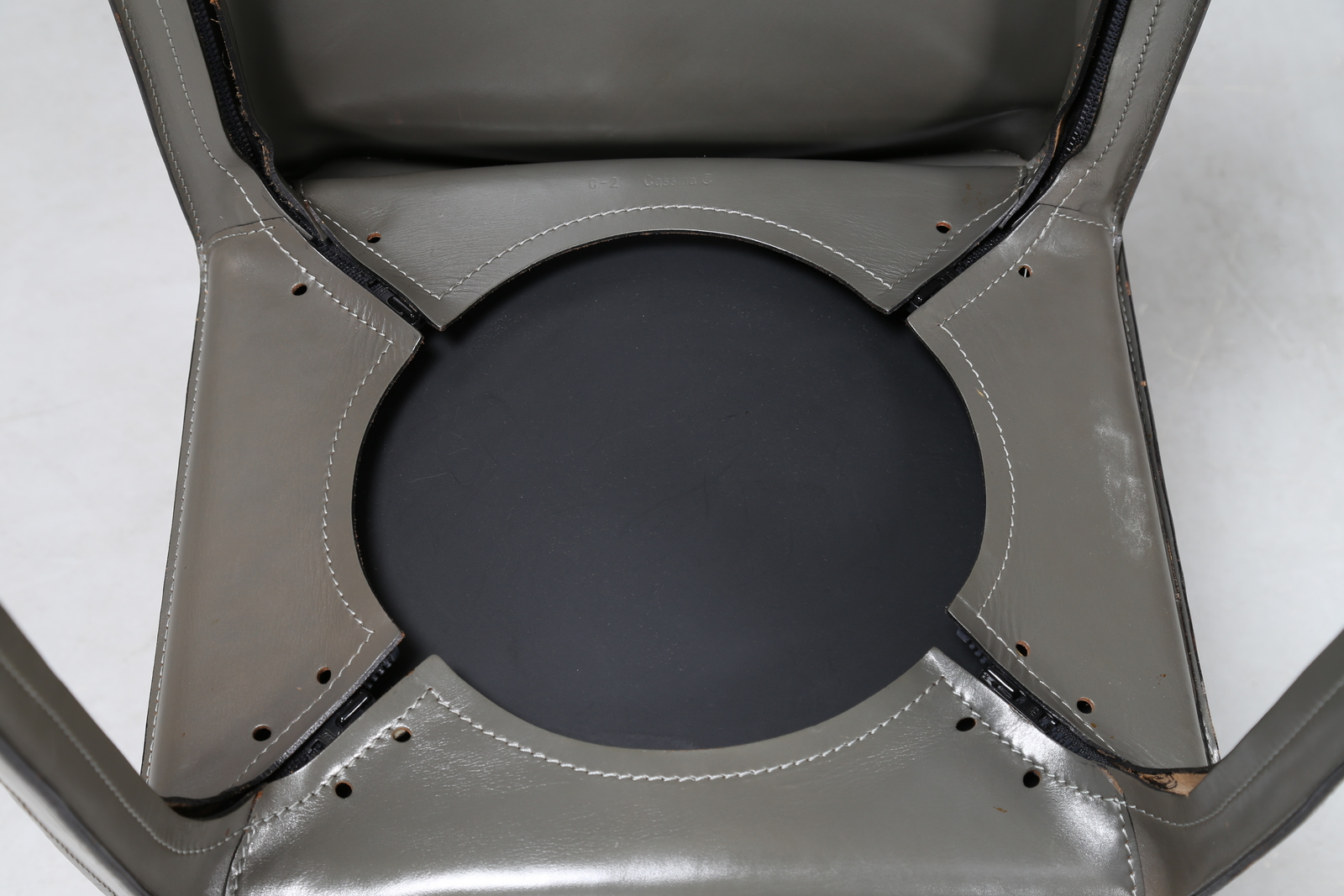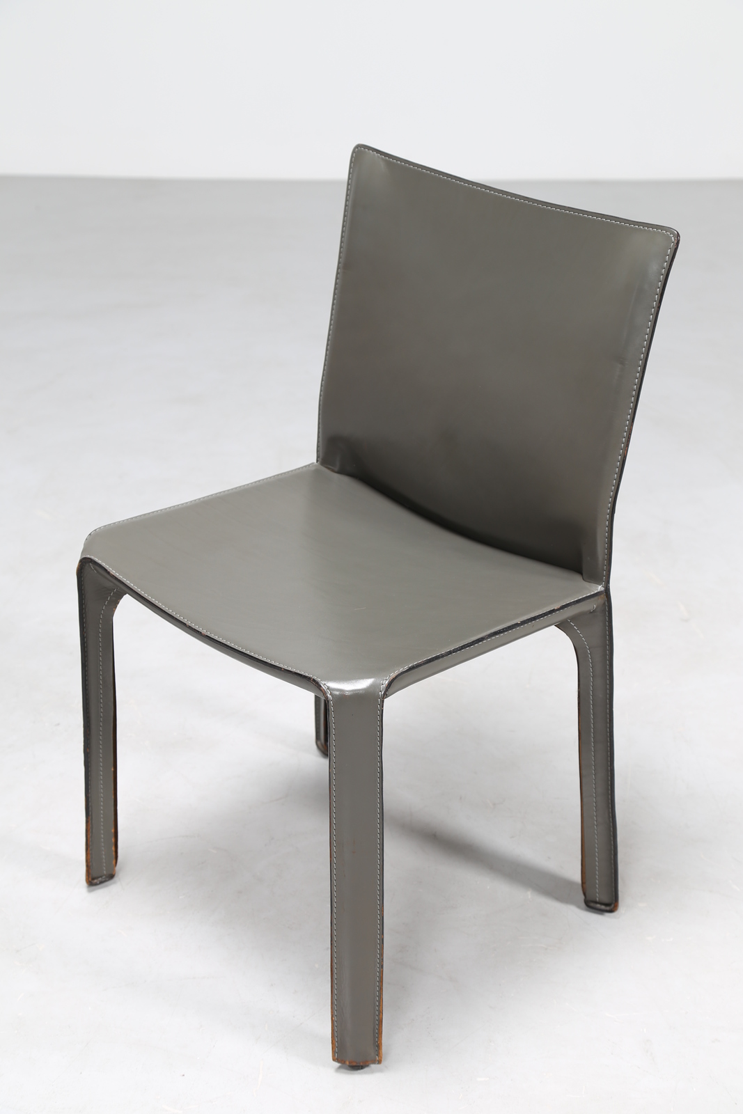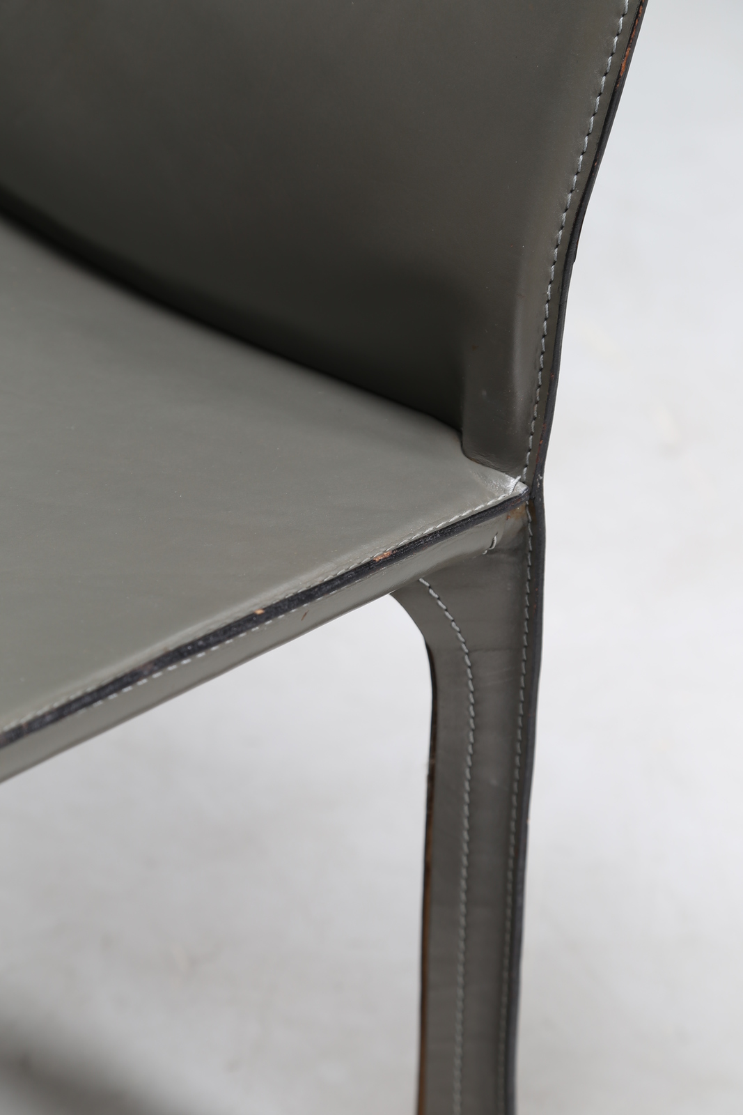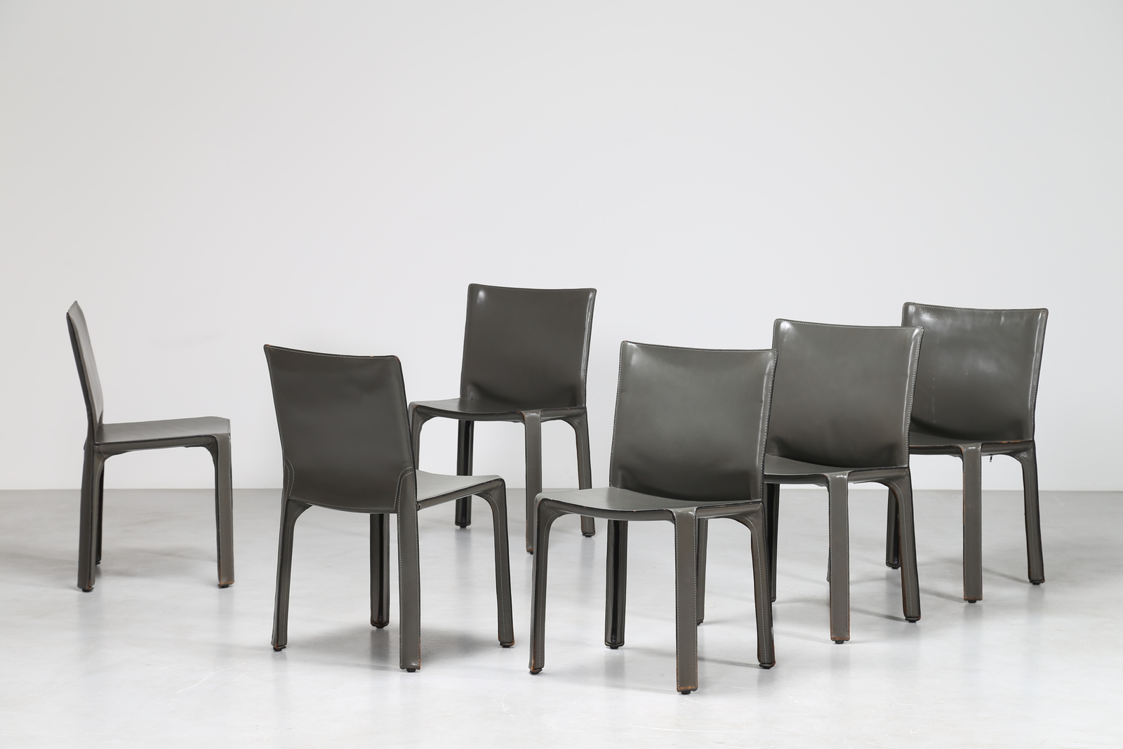 BELLINI MARIO (n. 1935) Six steel and plastic chairs, covered by hide, mod. Cab for Cassina, 70’s.