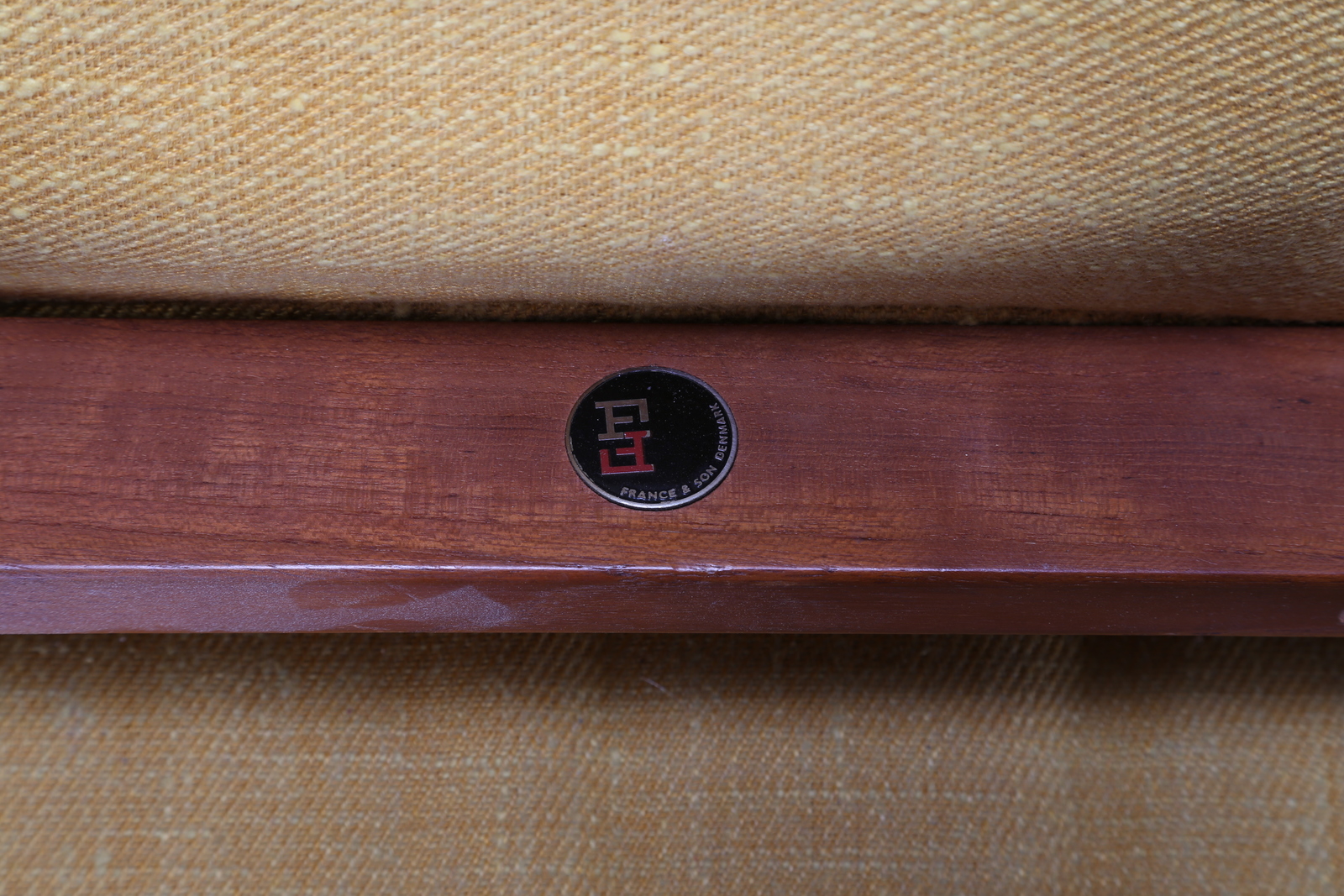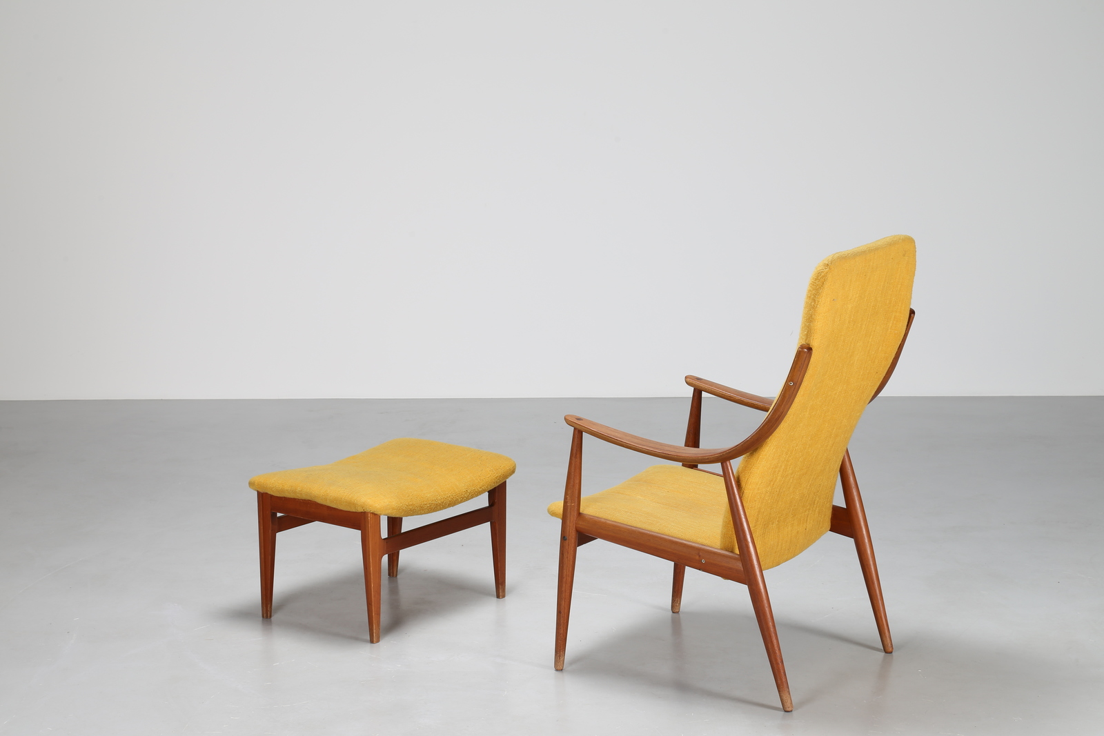 PETER HVIDT E ORLA MØLGAARD-NIELSEN Poltrona con pouf in rovere braccioli in teak laminato e tessuto originale, per Francia & Son 1953. Etichetta originale presente