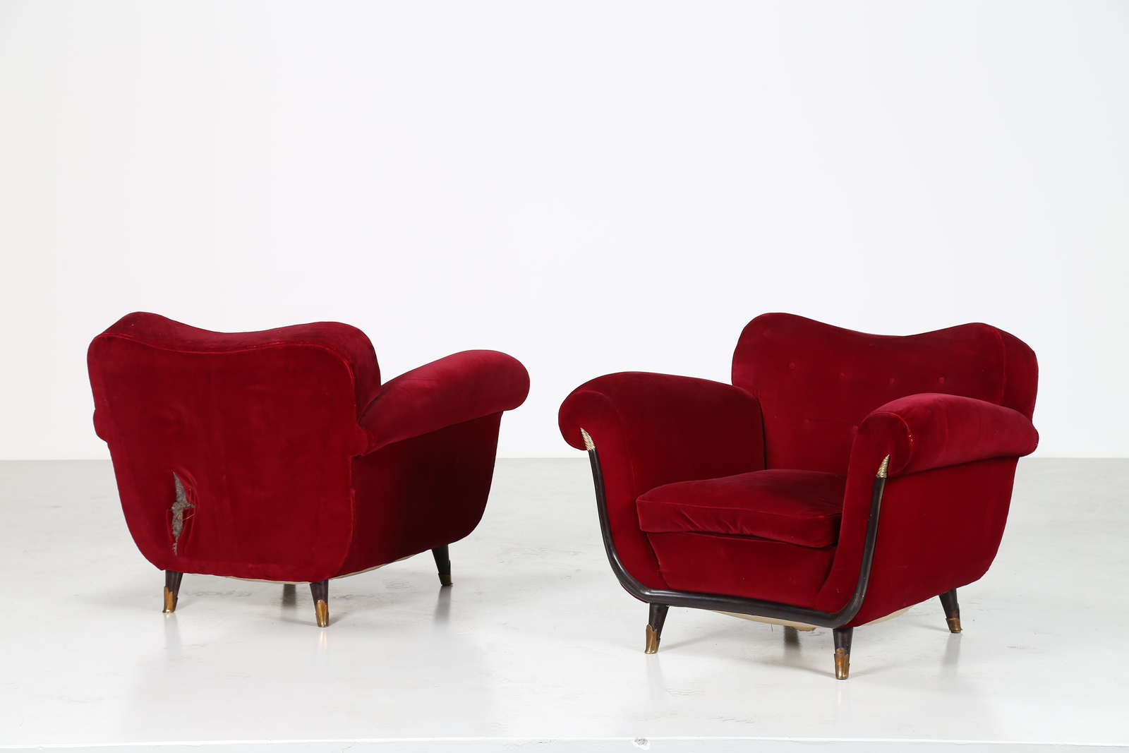 ULRICH GUGLIELMO Attrib. Coppia di poltrone in legno con dettagli in ottone e velluto, anni 50 . -. Cm 100,00 x 80,00 x 90,00.