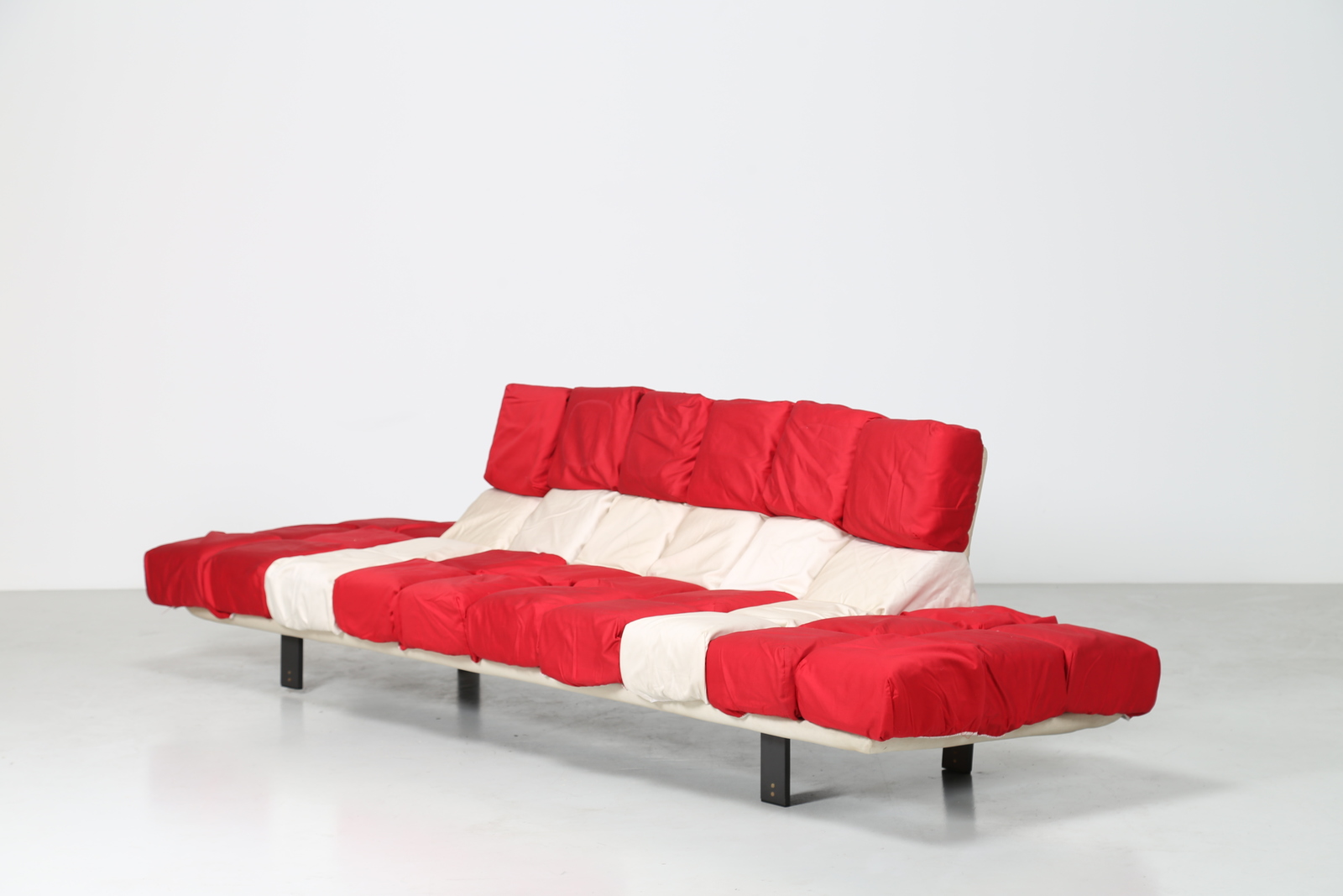 ROBERTO PAMIO e RENATO TOSO Divano in metallo ed elementi cubici in tessutto bianchi e rossi, mod. Scacco Matto, per Arflex, anni 80. Pubblicazioni; Ottagono, n. 67, settembre 1982. -. Cm 270,00 x 74,00 x 82,00.